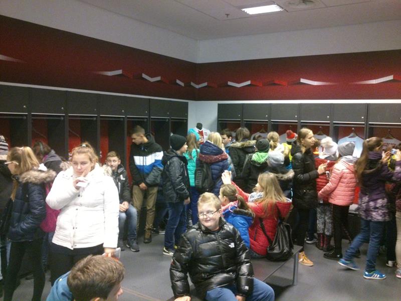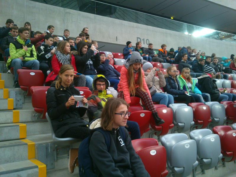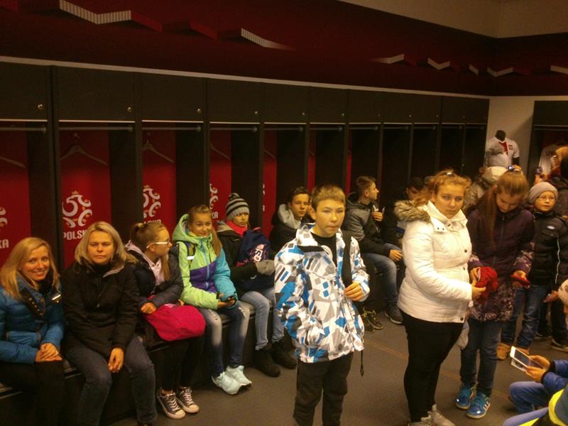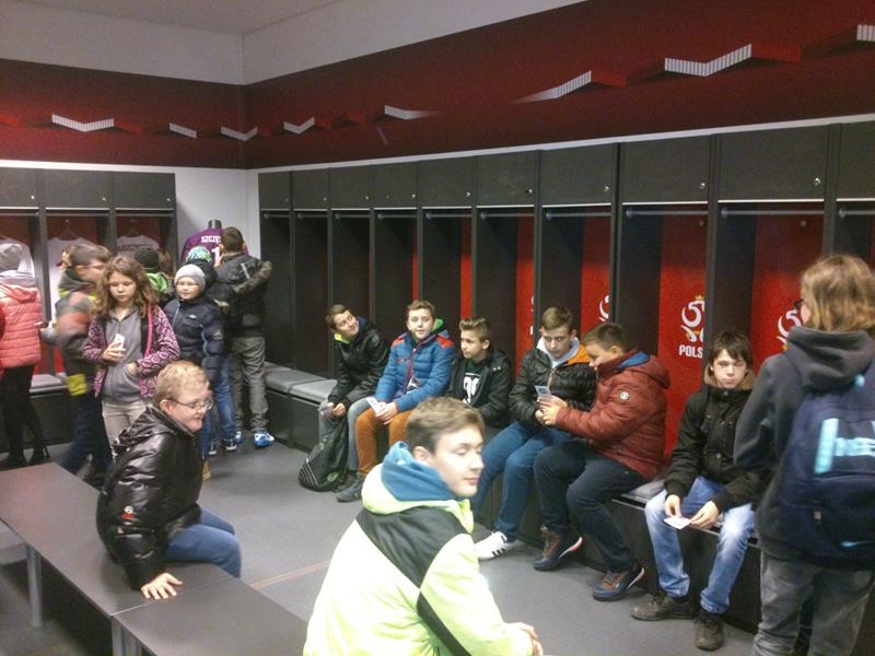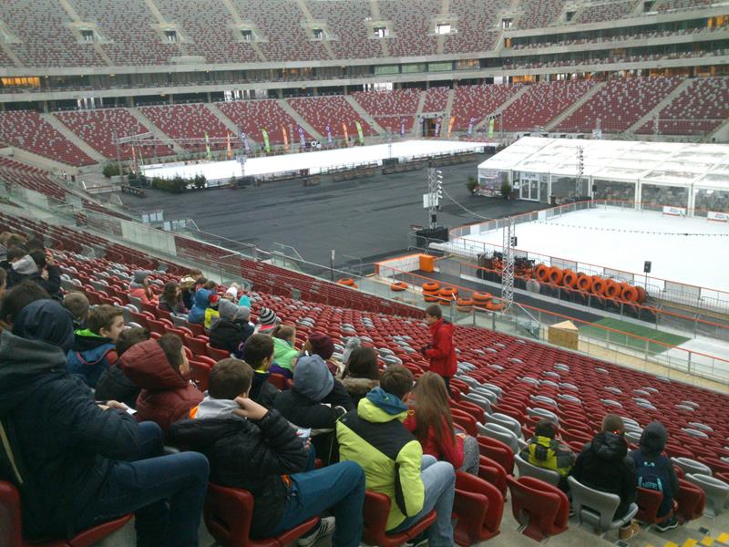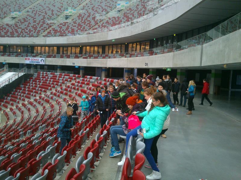 Pierwszym etapem wycieczki był Stadion PGE Narodowy. Uczniowie mieli możliwość obejrzeć zarówno trybuny, jak i pozostałe pomieszczenia stadionu, niedostępne do obejrzenia na co dzień. Przewodnik wycieczki zaznajomił uczniów z podstawowymi informacjami na temat budowy stadionu – genezy jego powstania, przeznaczenia obiektu oraz możliwości objętościowych budowli. Uczniowie zwiedzili nie tylko trybuny, ale również szatnie, salę konferencyjną, salę bankietową czy studio pracy dziennikarzy.
