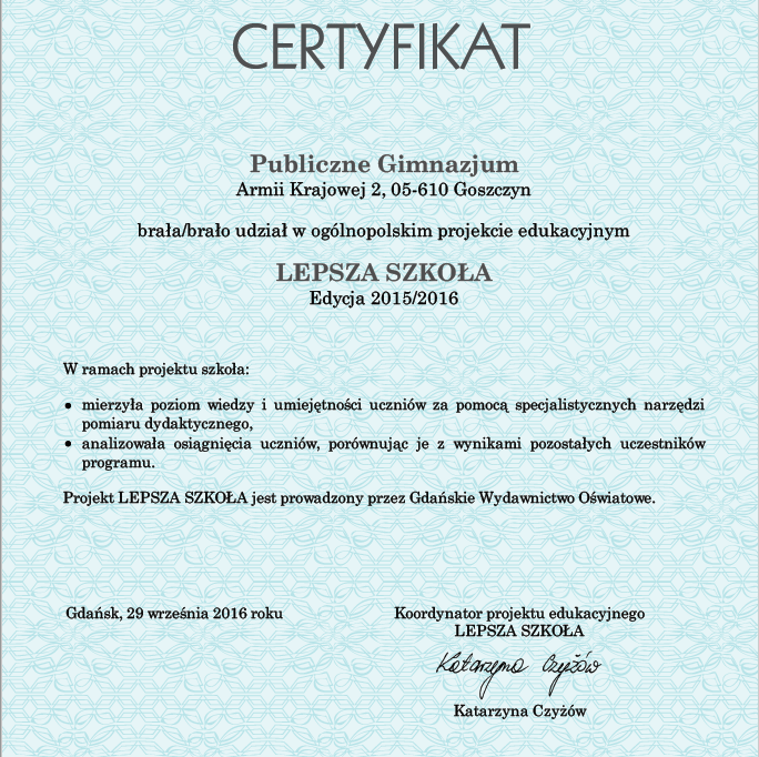 oraz fakt, iż aż 63% wszystkich uczniów z kraju napisało egzamin słabiej niż nasi uczniowie, dobitnie świadczy, że uczestnictwo w projekcie przyniosło oczekiwane rezultaty.