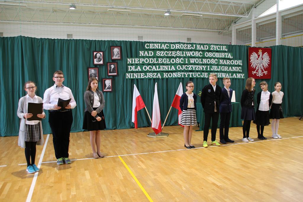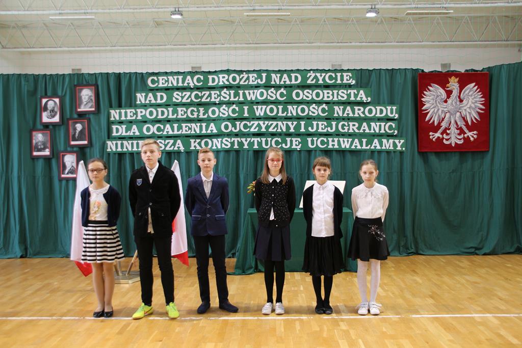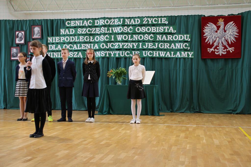 Akademia rozpoczęła się uroczystym wprowadzeniem sztandaru szkoły oraz odśpiewaniem hymnu państwowego. Program artystyczny, przygotowany przez klasę V a, przybliżył uczniom naszej szkoły historię tego jakże ważnego dla kraju wydarzenia. Nie zabrakło również poetyckich reminiscencji Święta Konstytucji 3 Maja oraz patriotycznych pieśni.