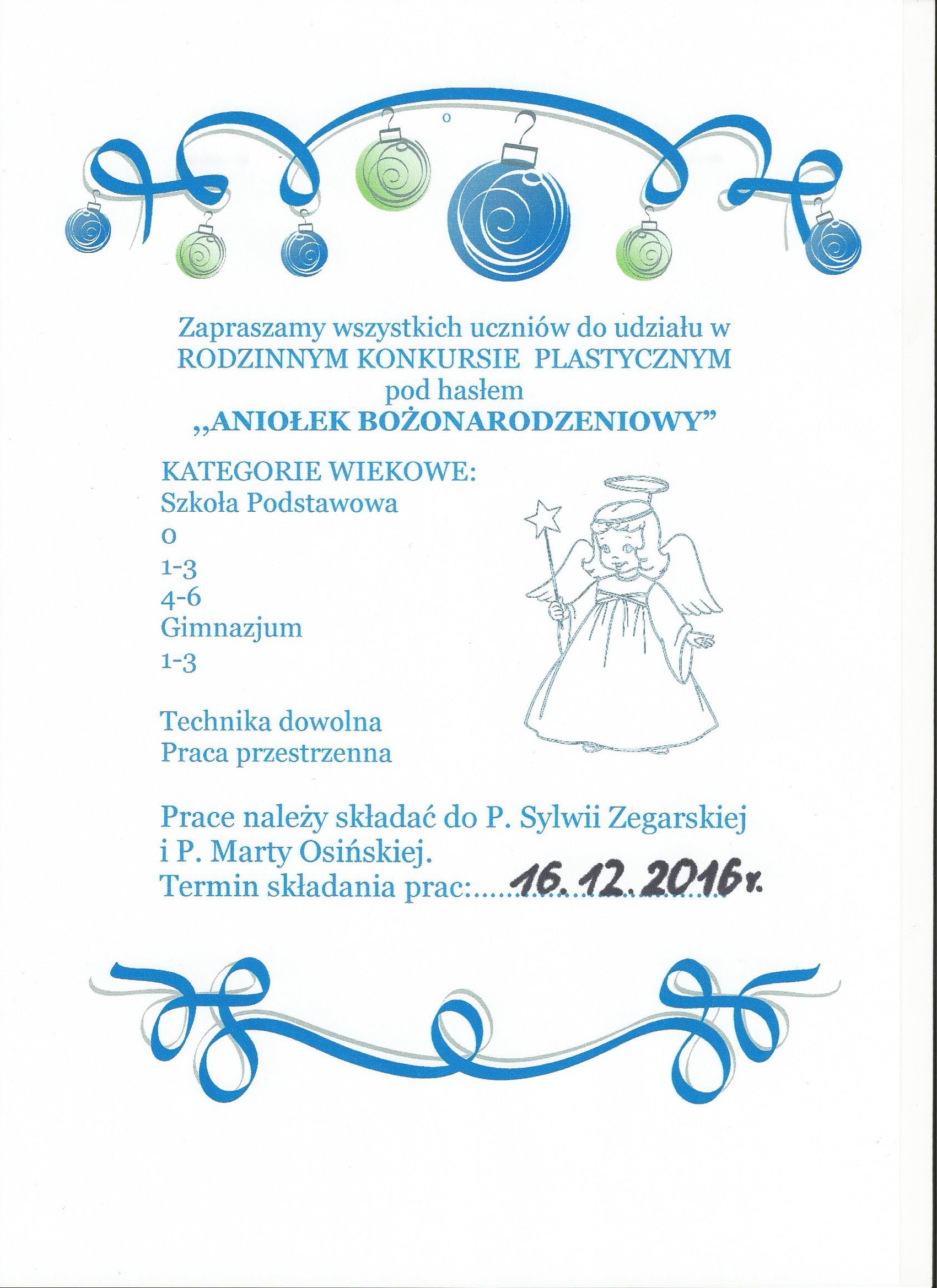 Zapraszamy wszystkich uczniów do udziału w Rodzinnym Konkursie Plastycznym pod hasłem "Aniołek Bożonarodzeniowy".