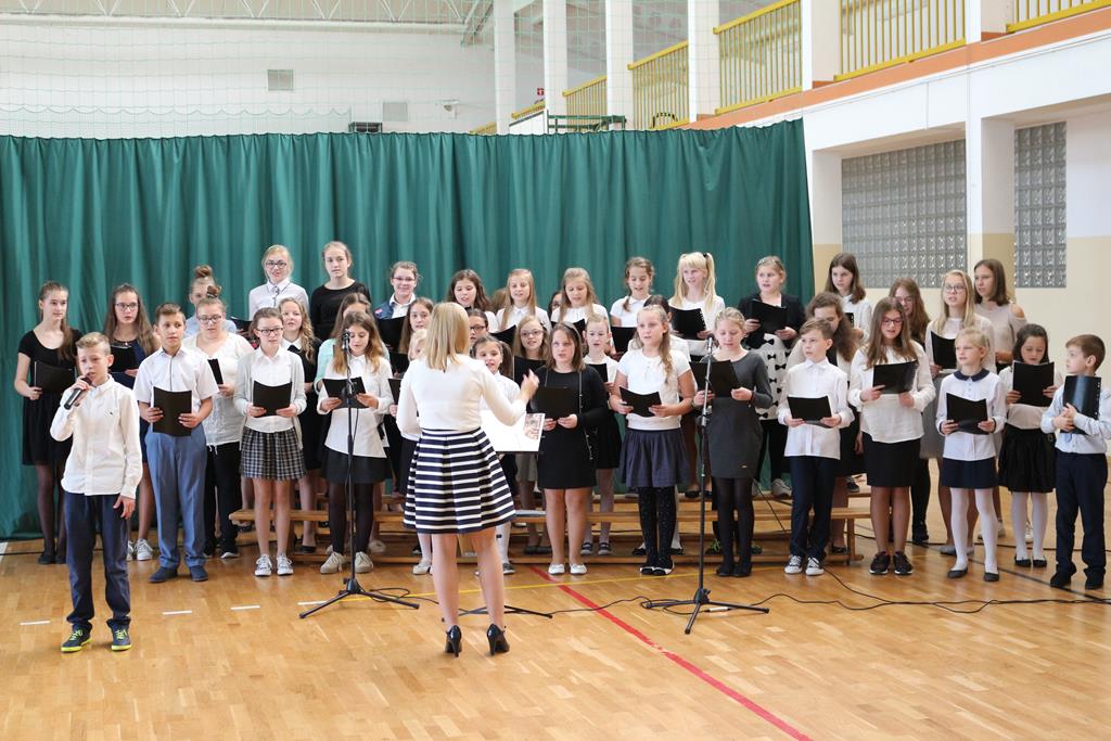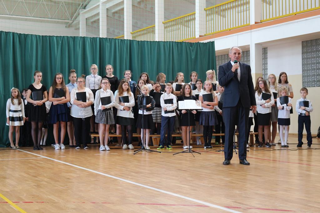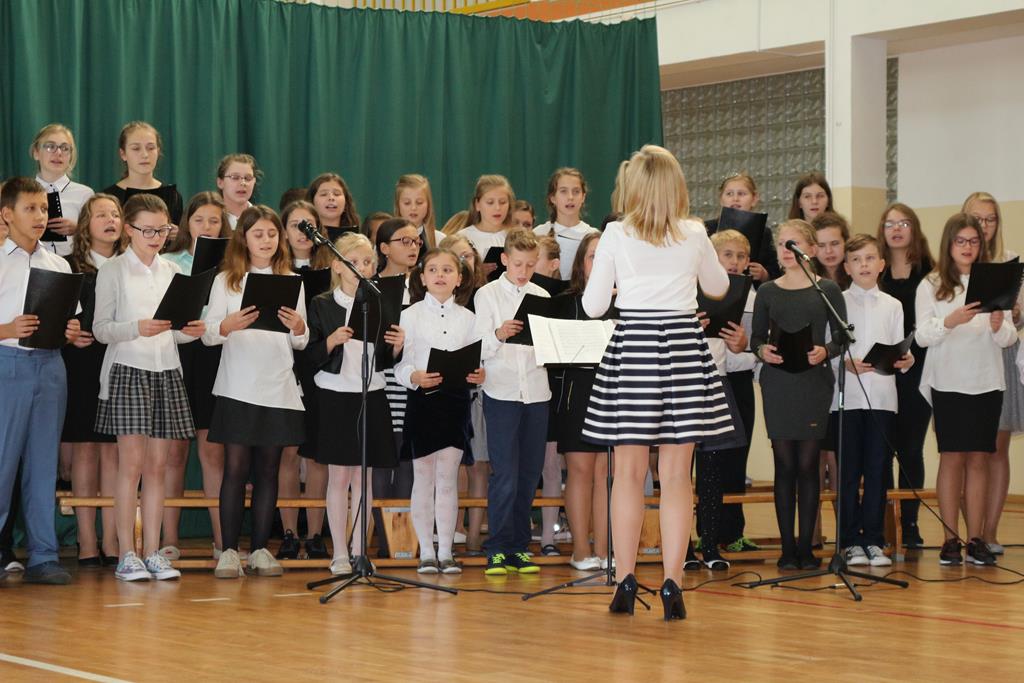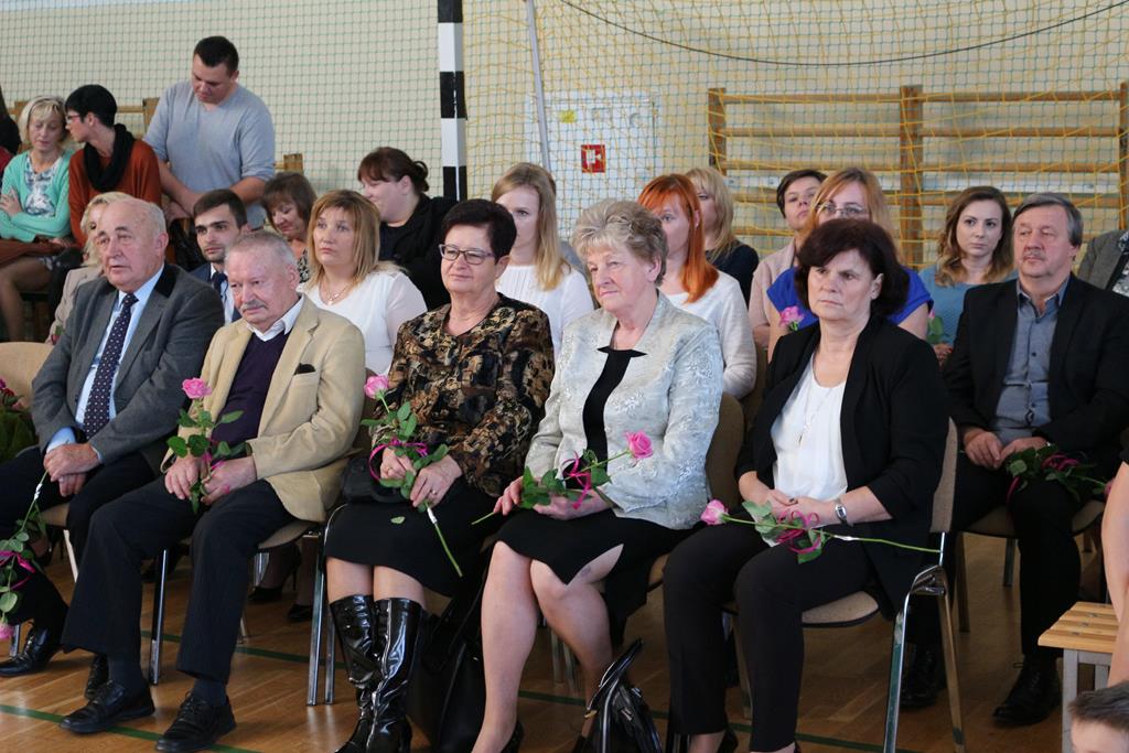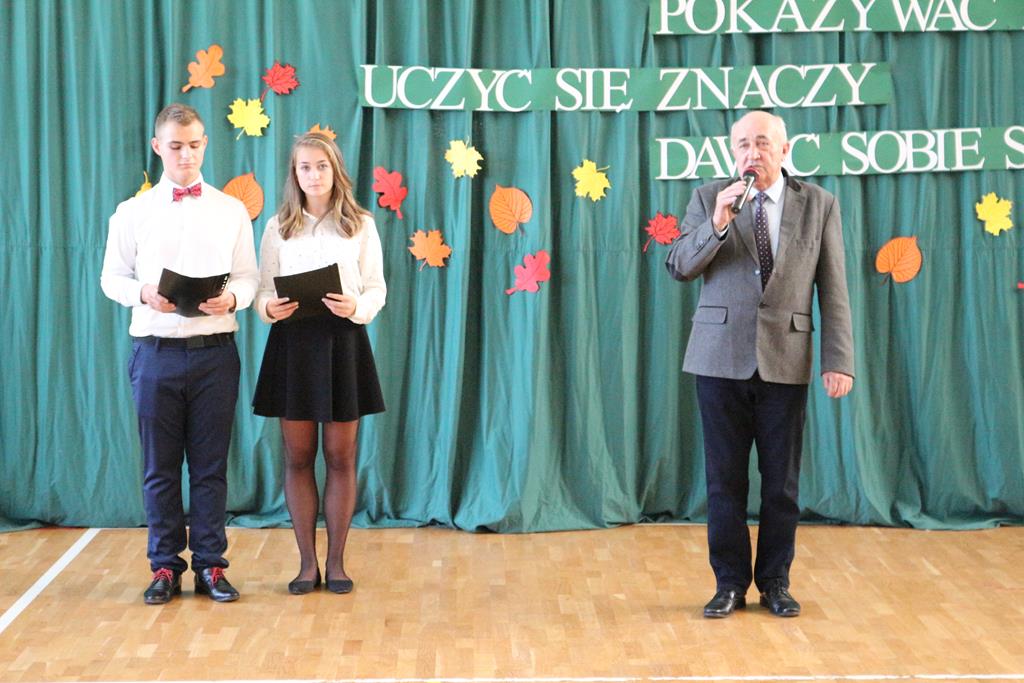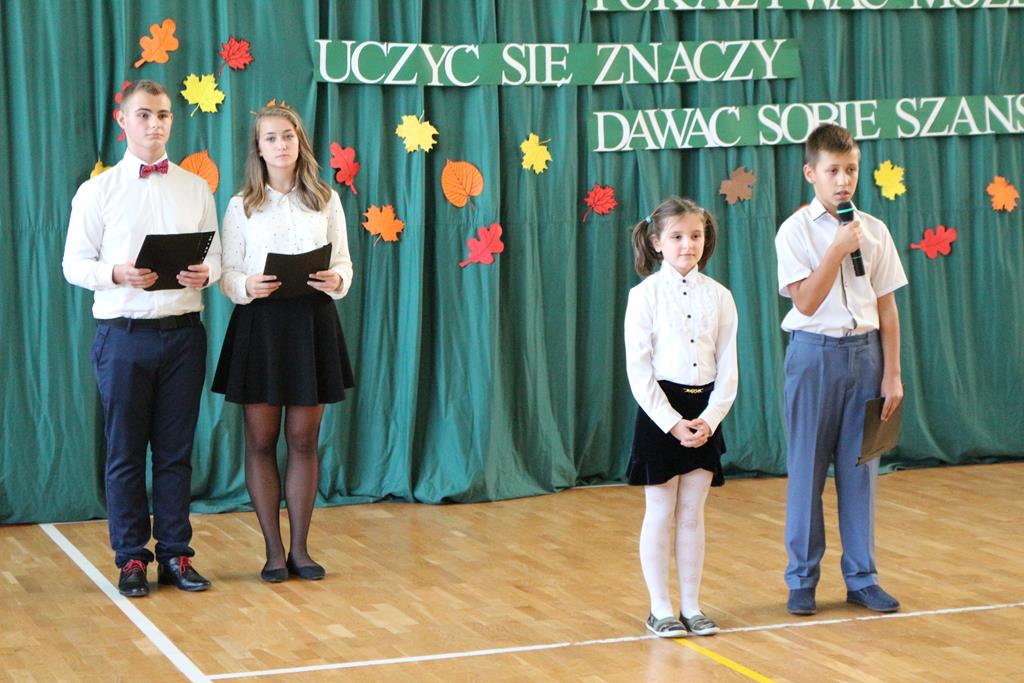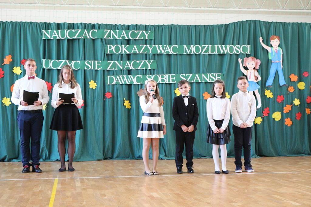 Uroczystość rozpoczął Pan Dyrektor – Mariusz Wangryn, który powitał zebranych oraz podziękował za przybycie szanownym gościom: Panu Sławomirowi Słabuszewskiemu - Wójtowi Gminy Goszczyn oraz emerytowanym nauczycielom, którzy w tym dniu zaszczycili nas swą obecnością. Po krótkim wstępie na scenę wkroczyli uczniowie. Przedstawiciele Samorządu Uczniowskiego przypominali o potrzebie kształcenia i roli nauczyciela. Młodzi recytatorzy wierszem sławili nauczyciela-pedagoga, wychowawcę. Cały występ wzbogaciły utwory muzyczne przygotowane przez chór szkolny pod kierownictwem Pani Moniki Piekarskiej.