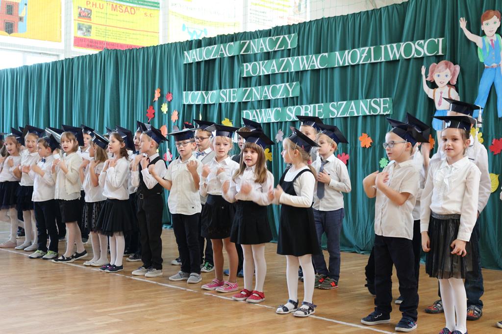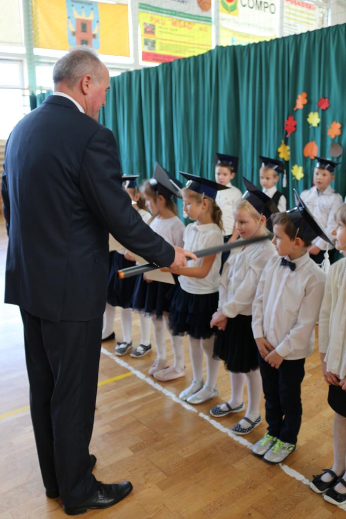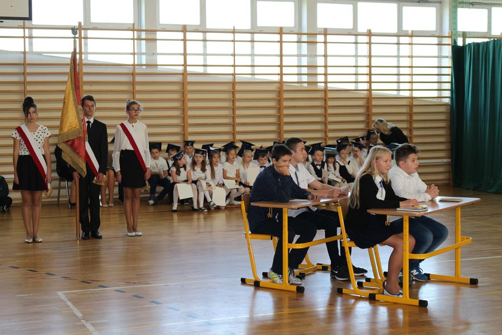 Niezwykle ważnym punktem uroczystości było ślubowanie i pasowanie na ucznia. Na tę chwilę z niecierpliwością czekał każdy pierwszoklasista. Najmłodsi uczniowie Szkoły Podstawowej w Goszczynie we wrześniu zasiedli w szkolnych ławkach i pod czujnym okiem Pani Anny Fatek i Pani Sylwii Mieńkowskiej przegotowywali się do tego wspaniałego wydarzenia .