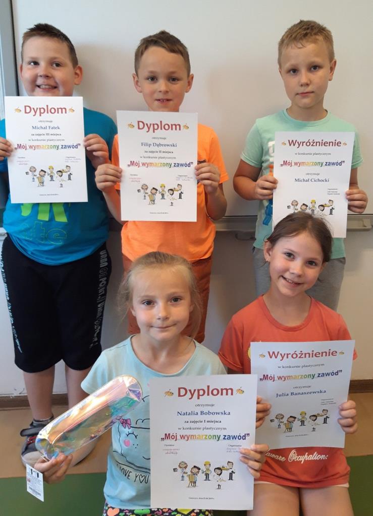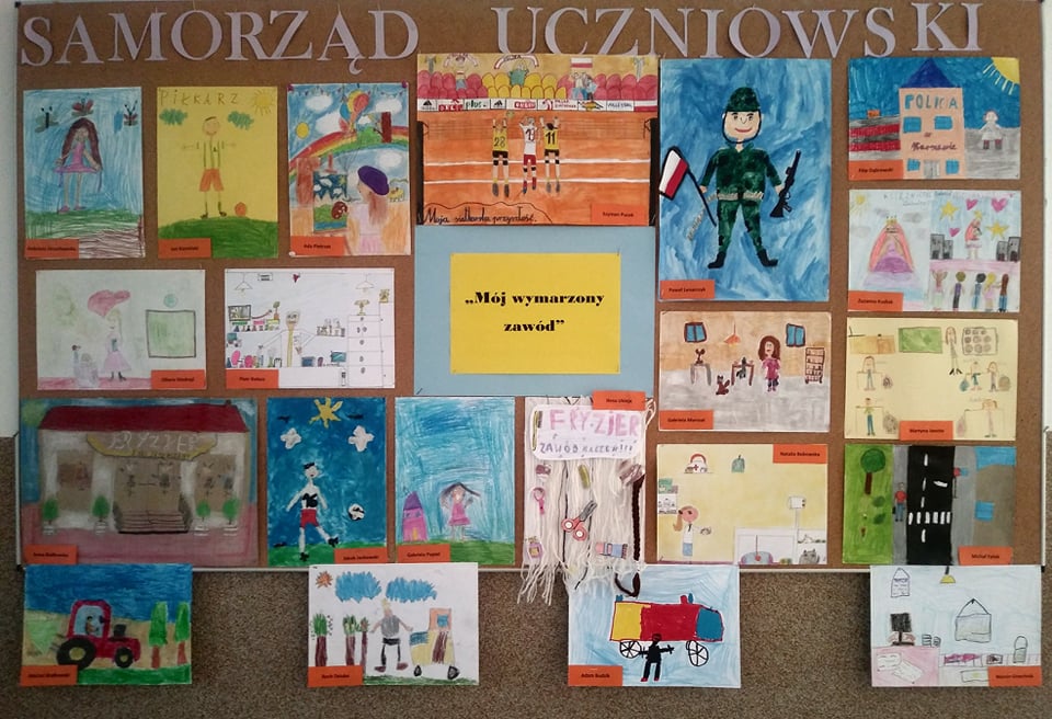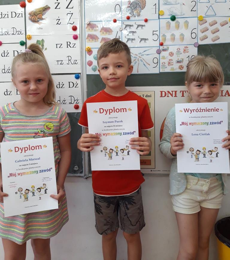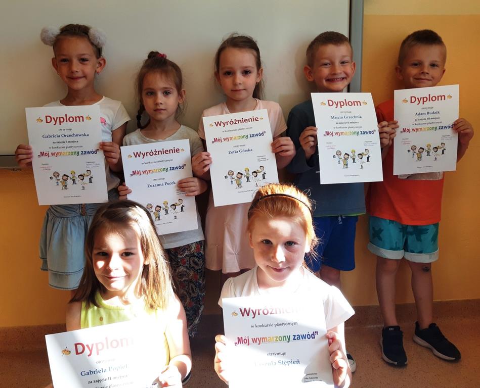 Jest nam niezmiernie miło ogłosić wyniki konkursu plastycznego zorganizowanego w ostatnich dniach maja w zakresie doradztwa zawodowego pt. "Mój wymarzony zawód". Zadaniem uczestnika konkursu (przedszkolaków oraz uczniów klas I-III) było plastyczne przedstawienie własnych wyobrażeń na temat wybranego przez siebie zawodu i zaprezentowanie pracy, jaką autor chciałby wykonywać w przyszłości lub która obecnie budzi jego szczególne zainteresowanie.