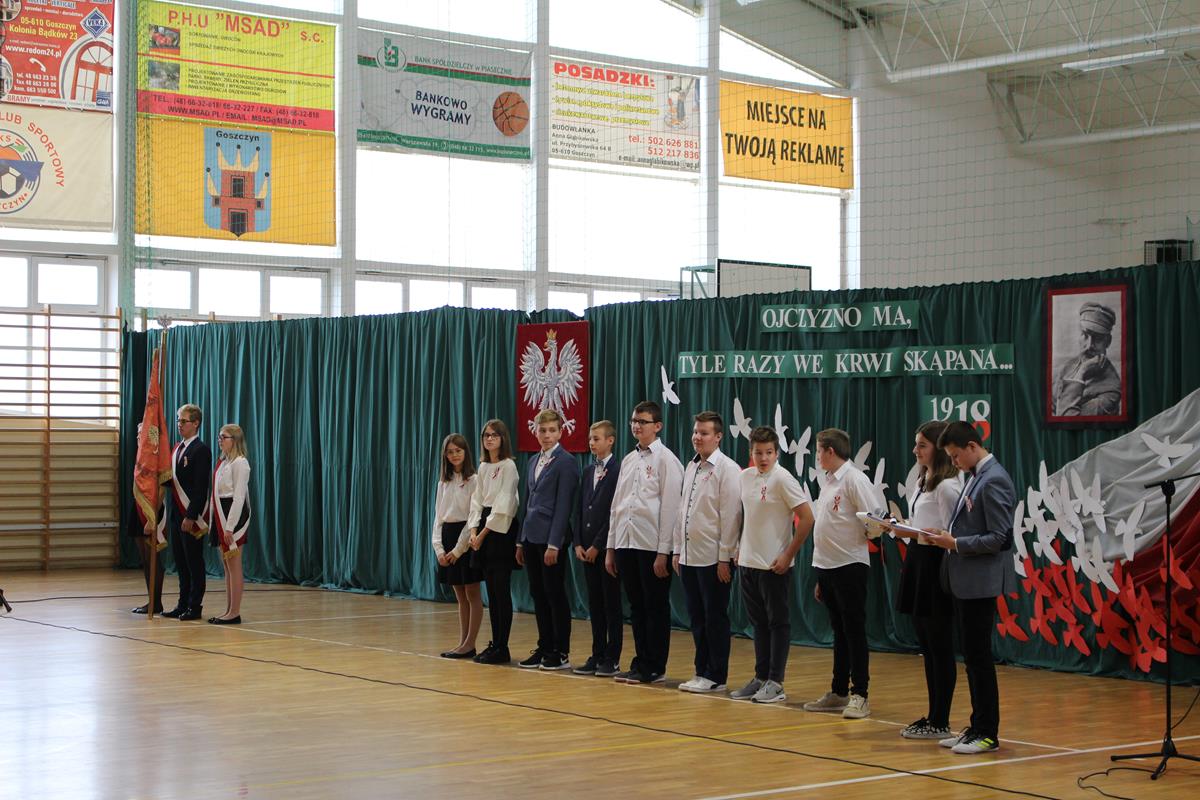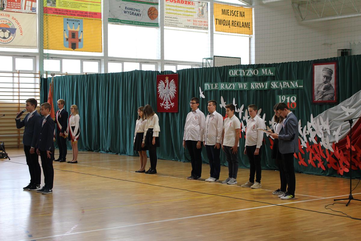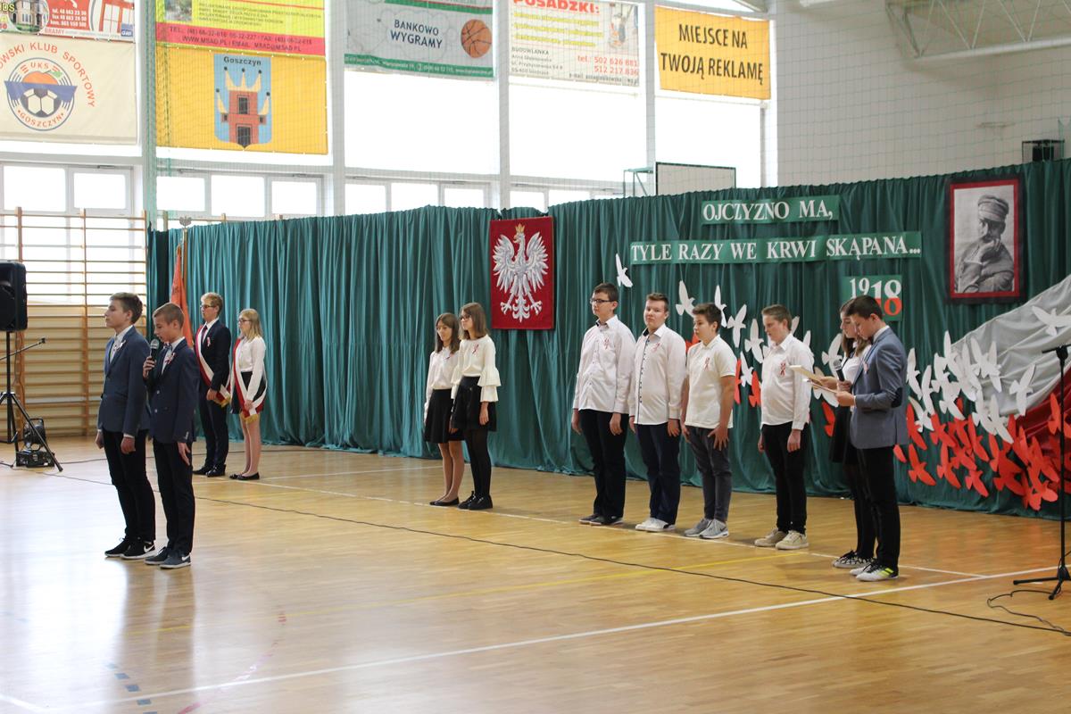 13 listopada 2018 roku w Publicznej Szkole Podstawowej w Goszczynie społeczność szkolna świętowała 100. rocznicę odzyskania przez Polskę niepodległości. Wszyscy uczniowie wraz z gronem pedagogicznym oraz obecnymi rodzicami wzięli udział w uroczystym apelu przygotowanym przez kolegów z klasy VII a.