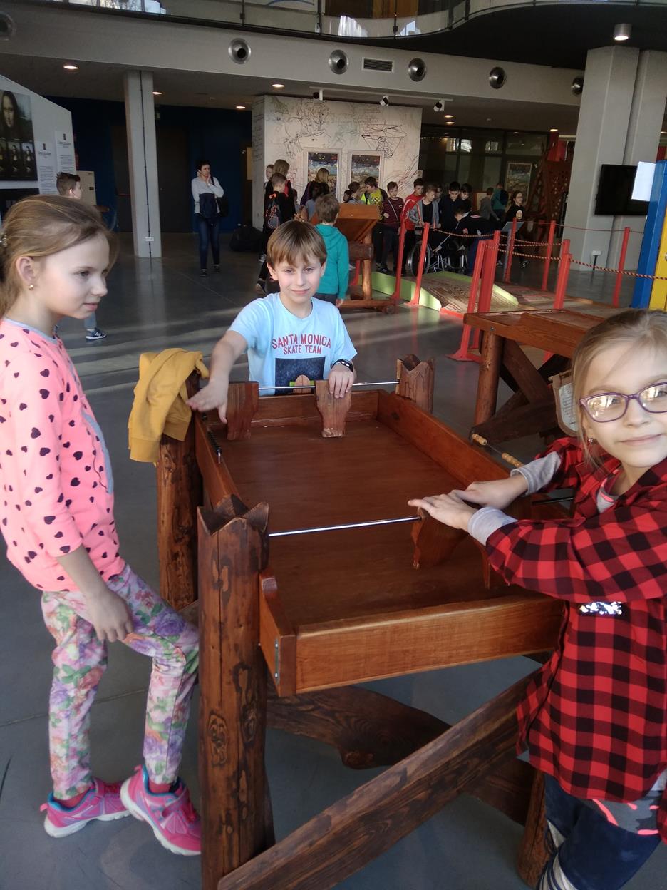 Po pysznym obiedzie w Zajeździe pod Srebrną Górą w Chęcinach naładowani nową energia i jeszcze lepszymi humorami udaliśmy się do ostatniego punkt wycieczki jakim było Centrum Nauki Leonardo Da Vinci. Celem pobytu w tym oto miejscu była przede wszystkim nauka poprzez doświadczenie i zabawę z wykorzystaniem nowoczesnych interaktywnych eksponatów. Uczestnicy wycieczki mieli okazję podziwiać wspaniałe fizyczne modele odtworzone na podstawie projektów Leonarda da Vinci. Radości i pozytywne emocje przyniosły uczniom obserwacje przez mikroskop,gry i układanki logiczne oraz obserwacja stanowisk multimedialnych i mechatronicznych. Każdy znalazł tam coś dla siebie, dotknął, doświadczył, sprawdził i zapamiętał.