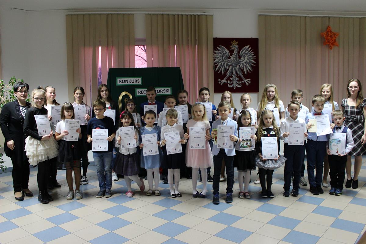 15 lutego 2019 roku w naszej szkole odbył się Gminny Konkurs Recytatorski. Zebrani goście mieli możliwość wysłuchania deklamacji „Samochwały” czy „Skarżypyty” Jana Brzechwy, „Stefka Burczymuchy” Marii Konopnickiej, „Nic dwa razy” Wisławy Szymborskiej oraz wielu innych recytacji. W konkursie wzięło udział 26 uczestników. A oceny wystąpień dokonało oraz jury w składzie – p. Beata Turzyńska oraz p. Karolina Grzechnik.