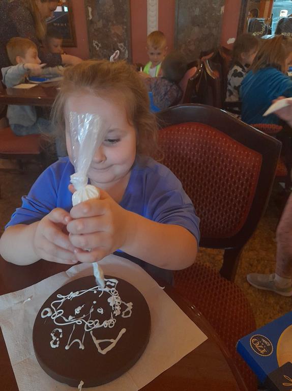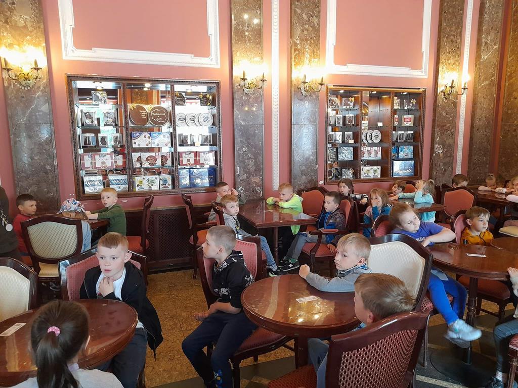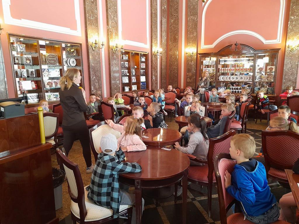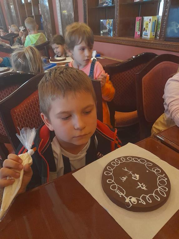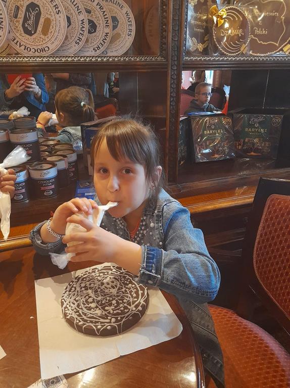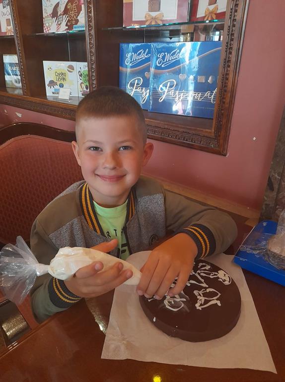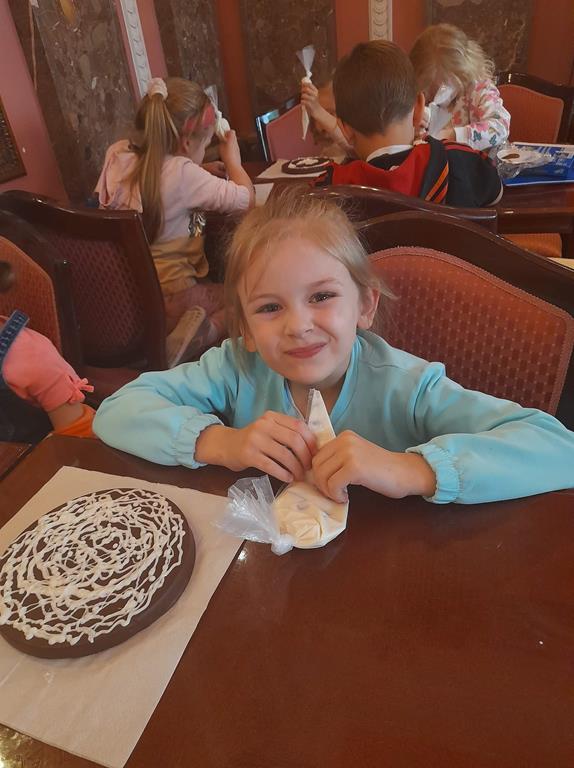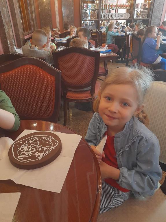 Drugim punktem wycieczki była wizyta w pijalni czekolady E. Wedel, gdzie dzieci mogły posmakować napoju czekoladowego, dowiedziały się jakie podstawowe rodzaje czekolady wyróżniamy oraz jak powstaje czekolada. Jednak najciekawszą rzeczą było własnoręczne ozdabianie wedlowskich torcików białą, płynną czekoladą. Dzieci do domu wróciły ze słodkimi upominkami i uśmiechniętymi buziami.