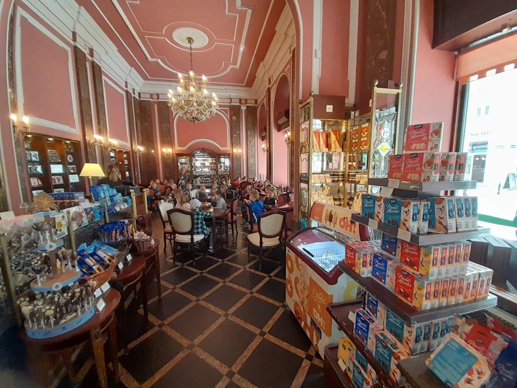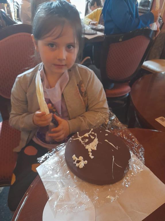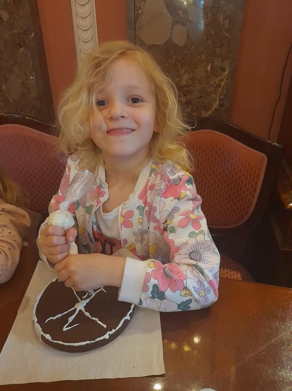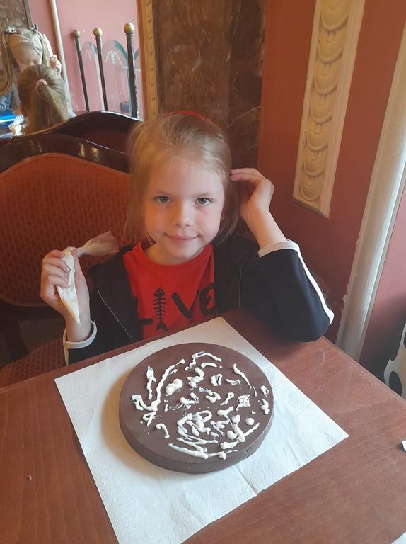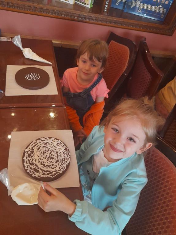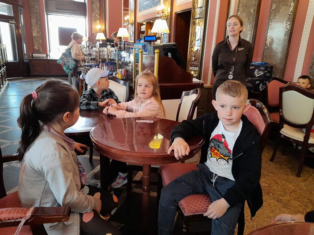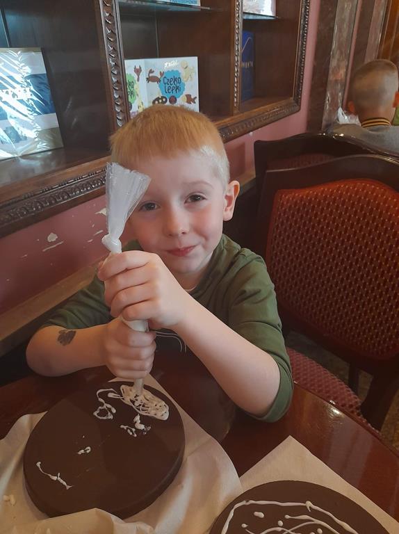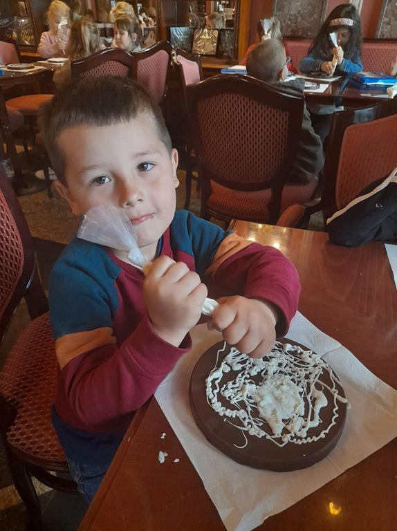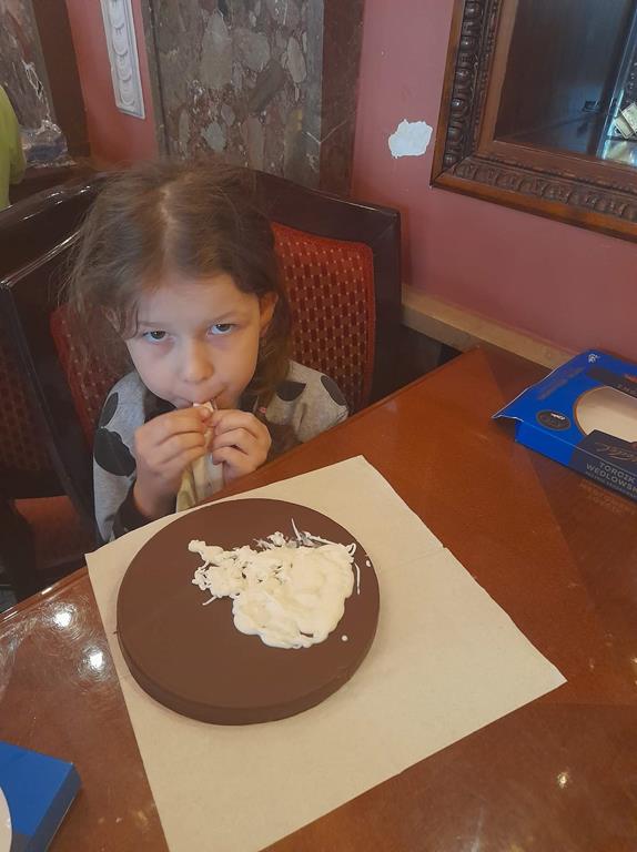Drugim punktem wycieczki była wizyta w pijalni czekolady E. Wedel, gdzie dzieci mogły posmakować napoju czekoladowego, dowiedziały się jakie podstawowe rodzaje czekolady wyróżniamy oraz jak powstaje czekolada. Jednak najciekawszą rzeczą było własnoręczne ozdabianie wedlowskich torcików białą, płynną czekoladą. Dzieci do domu wróciły ze słodkimi upominkami i uśmiechniętymi buziami.
