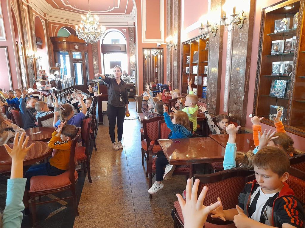 Drugim punktem wycieczki była wizyta w pijalni czekolady E. Wedel, gdzie dzieci mogły posmakować napoju czekoladowego, dowiedziały się jakie podstawowe rodzaje czekolady wyróżniamy oraz jak powstaje czekolada. Jednak najciekawszą rzeczą było własnoręczne ozdabianie wedlowskich torcików białą, płynną czekoladą. Dzieci do domu wróciły ze słodkimi upominkami i uśmiechniętymi buziami.