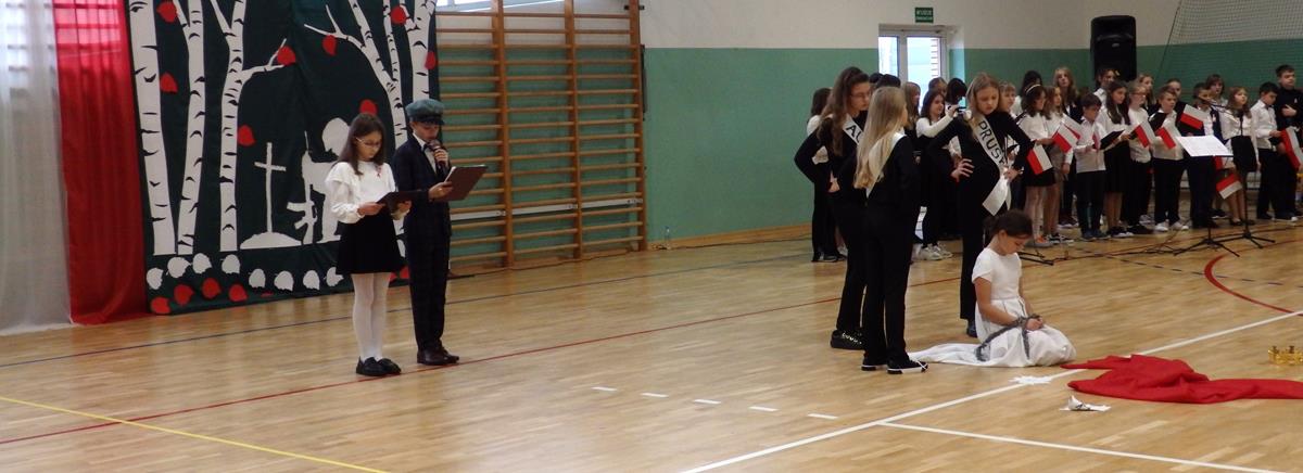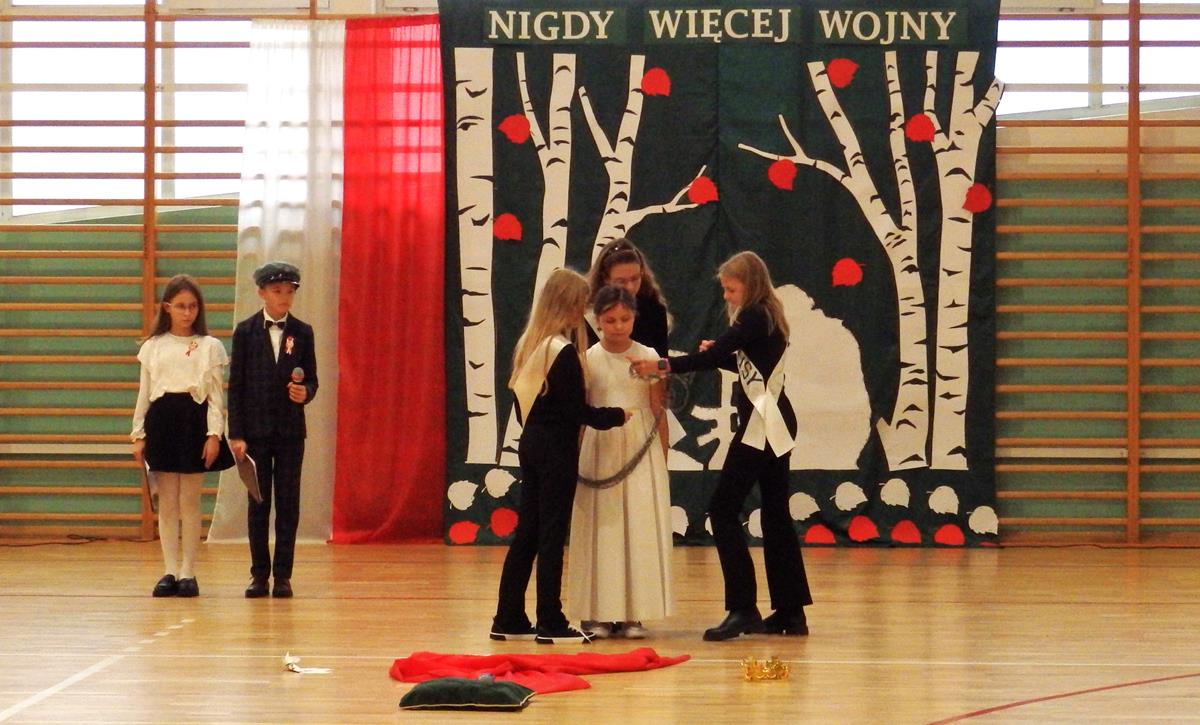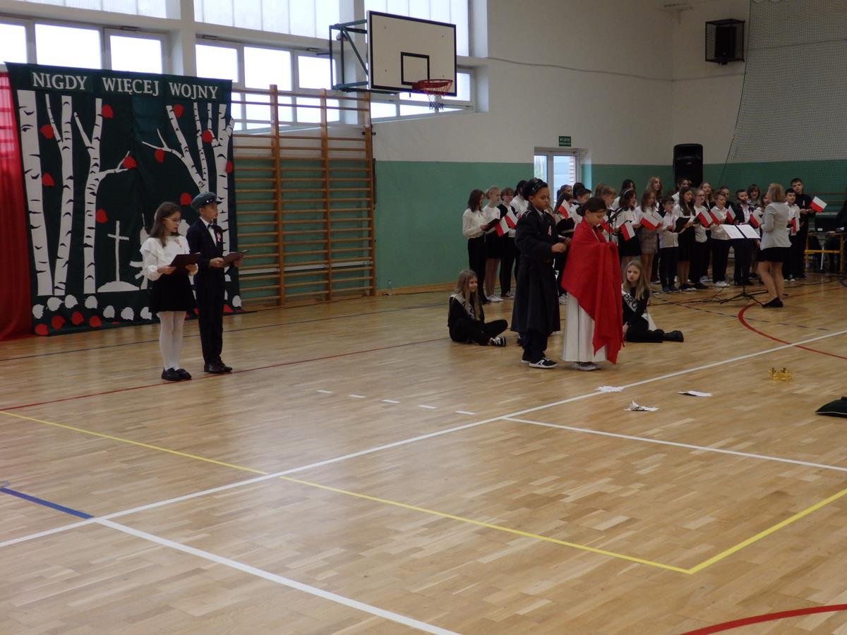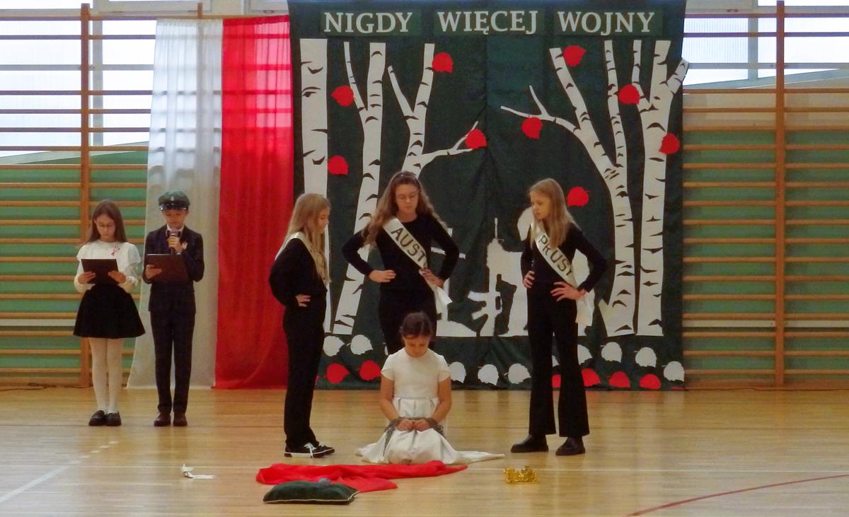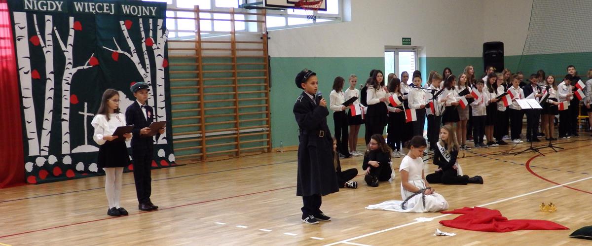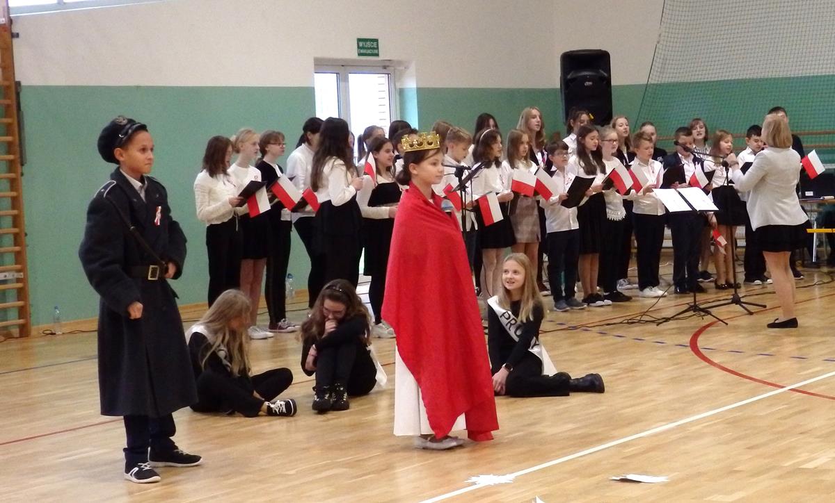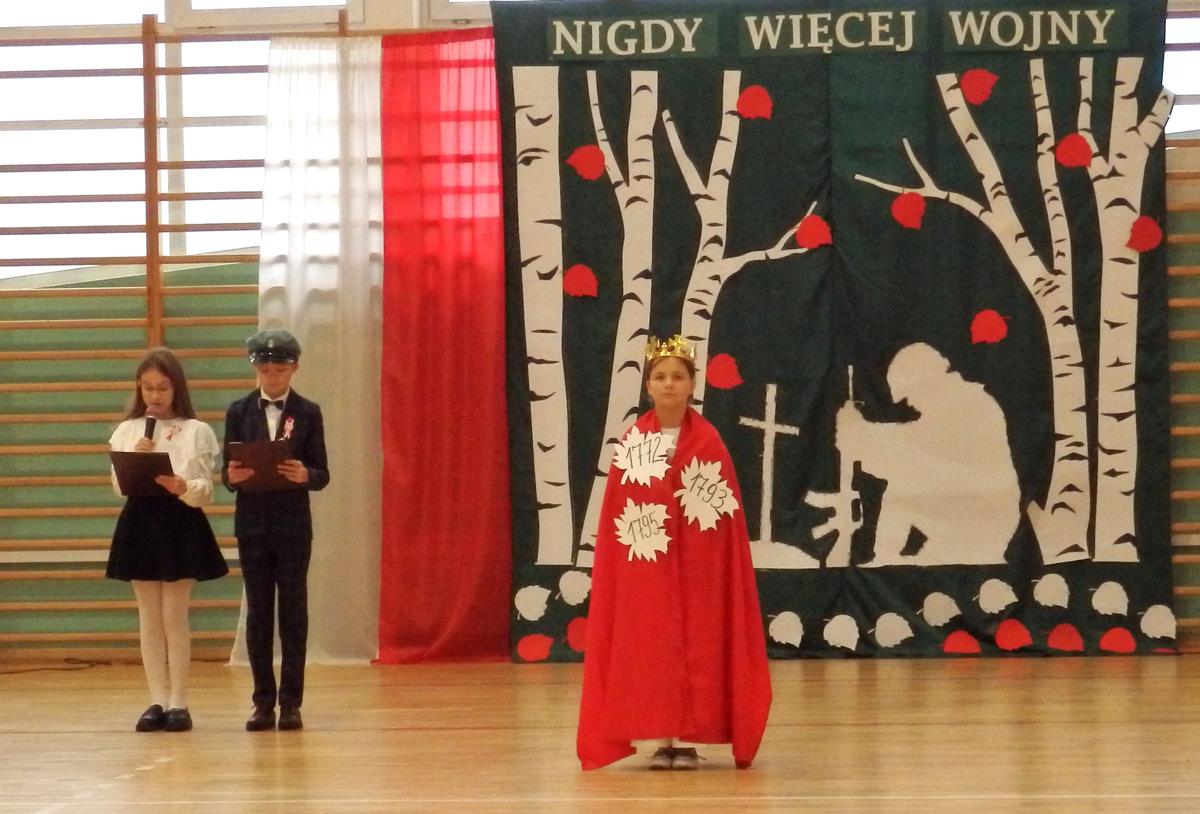 Prowadzący przedstawili krótką historię Polski. Przypomnieli czasy świetności Rzeczypospolitej, upadek naszego państwa - rozbiory, polskie powstania narodowe w XIX wieku i okoliczności odzyskania niepodległości przez Polskę w dniu 11 listopada 1918 roku. Słowa prowadzących przeplatane były scenkami obrazującymi utratę i odzyskanie niepodległości, pieśniami i piosenkami („Ojczyzno ma” księdza Karola Dąbrowskiego, „Pytasz mnie” Andrzeja Rosiewicza, „Mury” Jacka Kaczmarskiego, „Sen o Warszawie” Czesława Niemena i „Rotę” Marii Konopnickiej) wykonanymi przez chór szkolny oraz wierszami (m.in. „Moja piosnka” Cypriana Kamila Norwida).