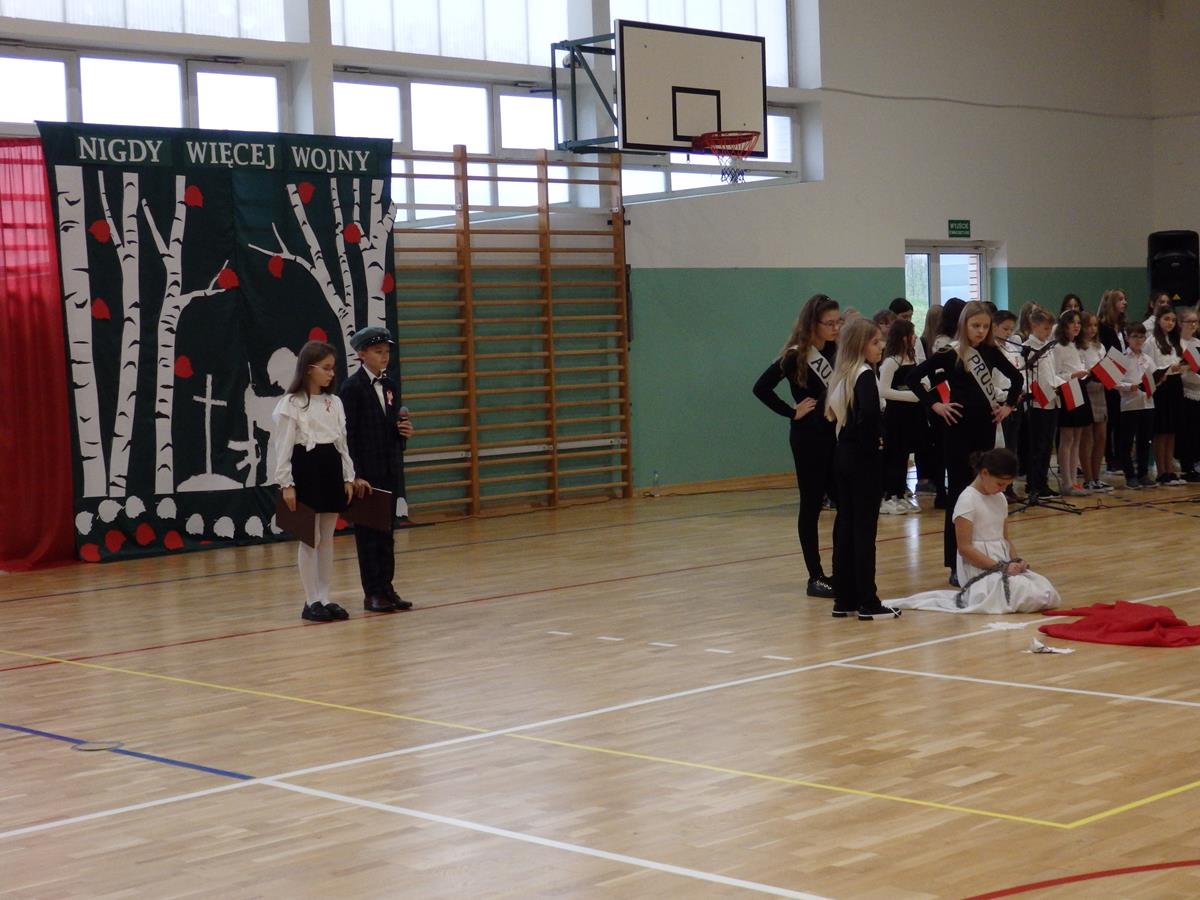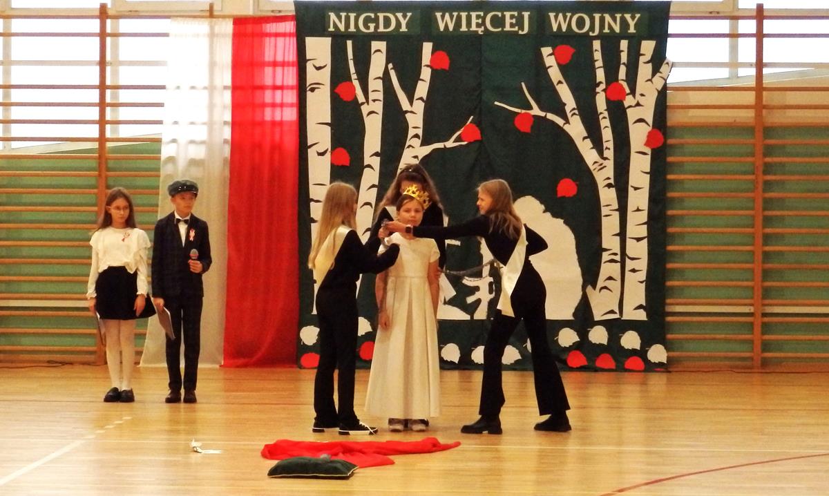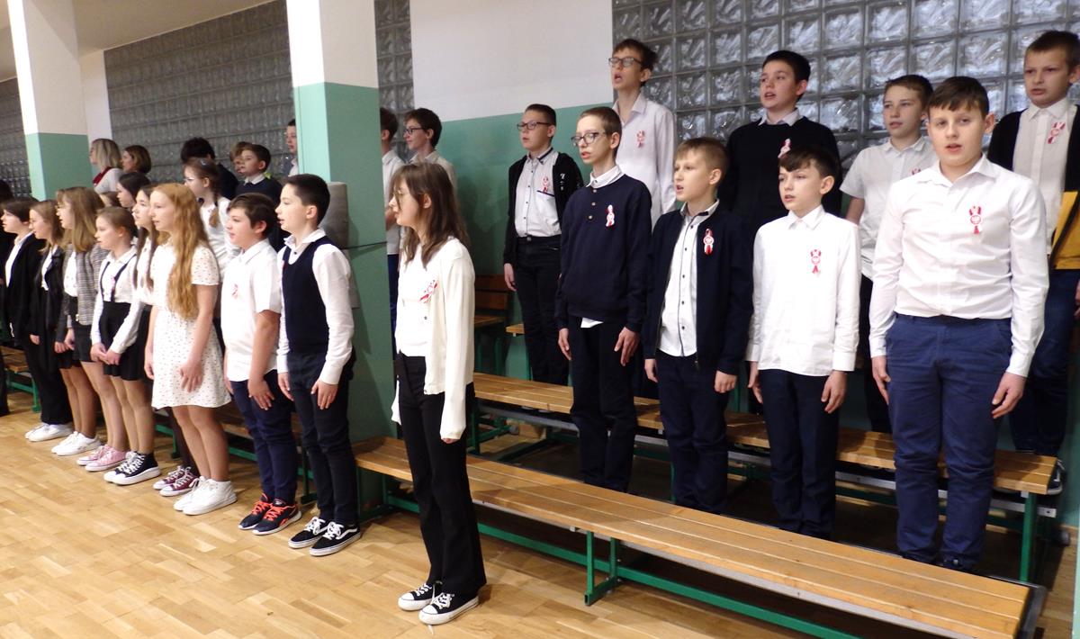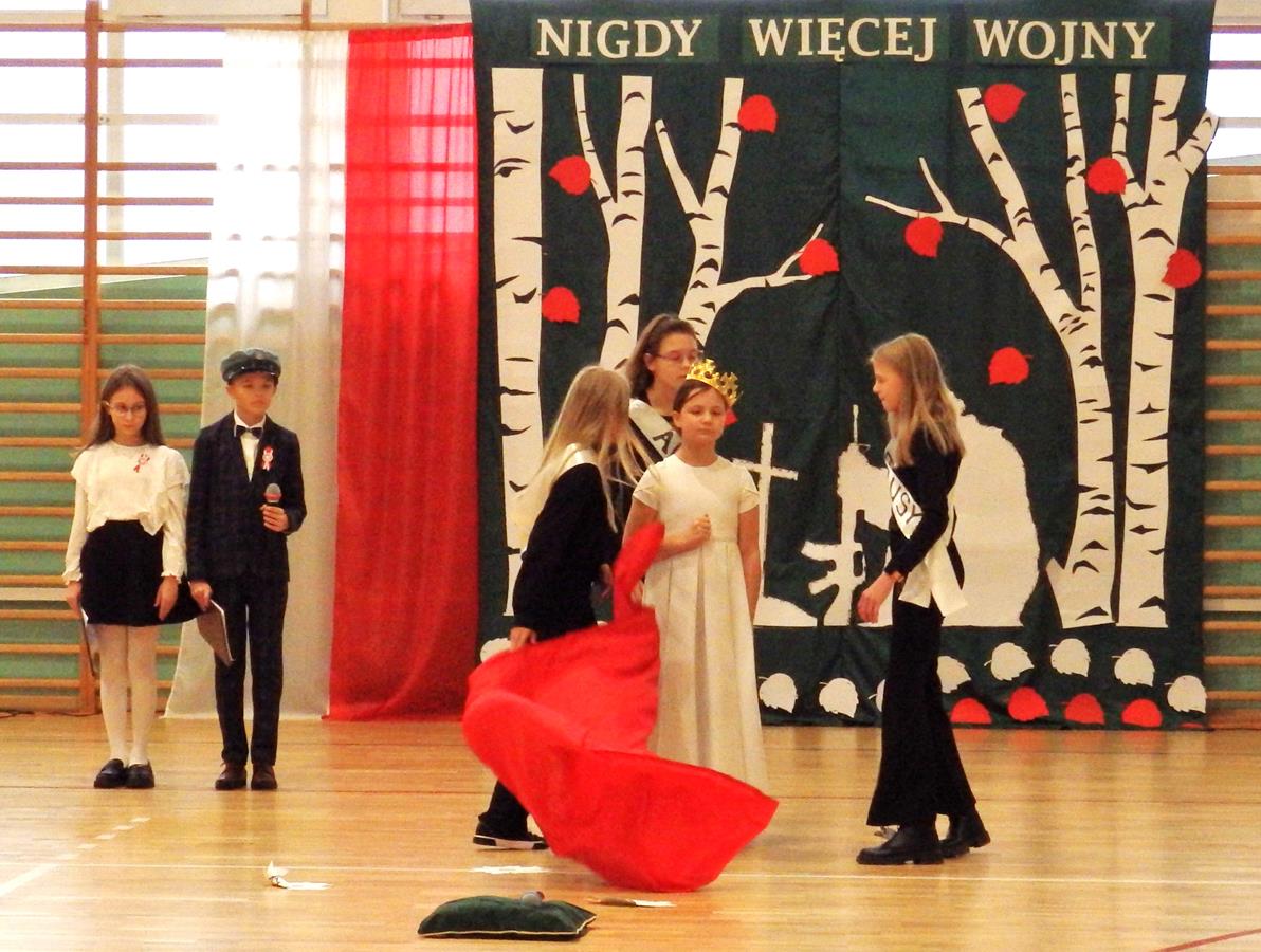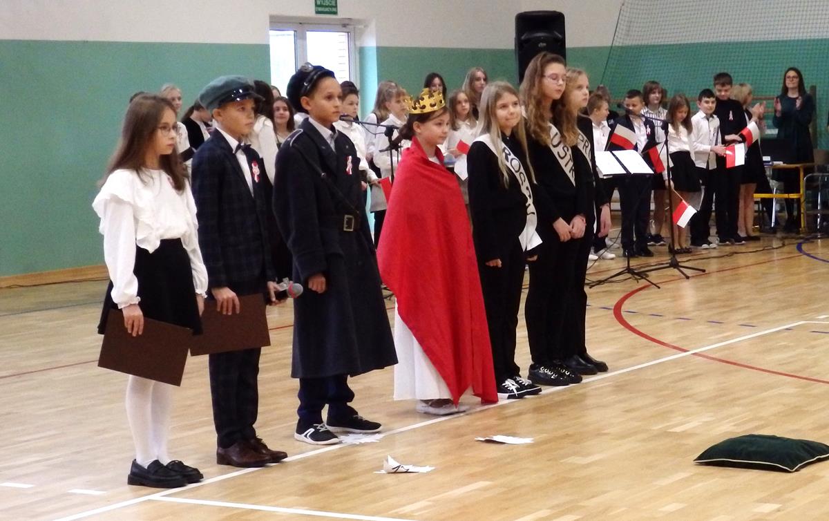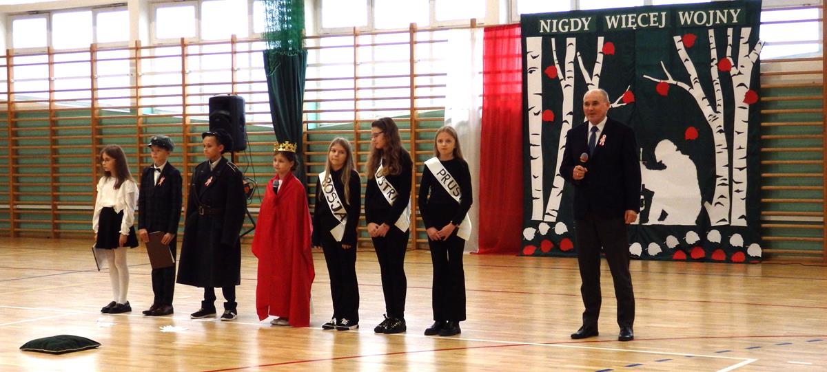 Prowadzący przedstawili krótką historię Polski. Przypomnieli czasy świetności Rzeczypospolitej, upadek naszego państwa - rozbiory, polskie powstania narodowe w XIX wieku i okoliczności odzyskania niepodległości przez Polskę w dniu 11 listopada 1918 roku. Słowa prowadzących przeplatane były scenkami obrazującymi utratę i odzyskanie niepodległości, pieśniami i piosenkami („Ojczyzno ma” księdza Karola Dąbrowskiego, „Pytasz mnie” Andrzeja Rosiewicza, „Mury” Jacka Kaczmarskiego, „Sen o Warszawie” Czesława Niemena i „Rotę” Marii Konopnickiej) wykonanymi przez chór szkolny oraz wierszami (m.in. „Moja piosnka” Cypriana Kamila Norwida).