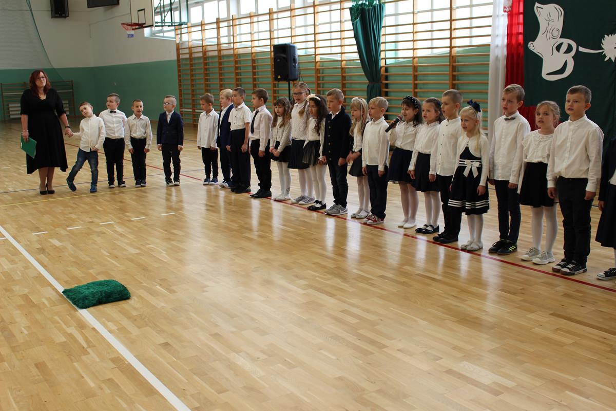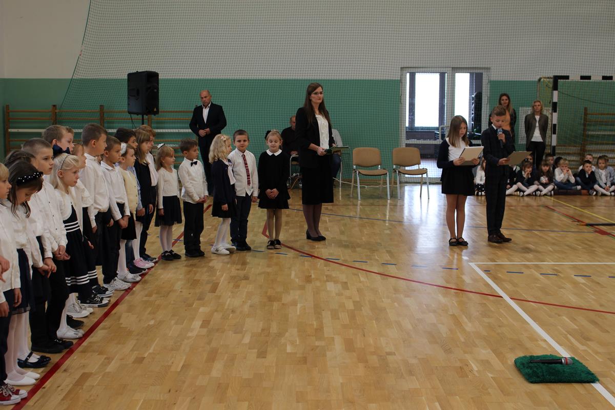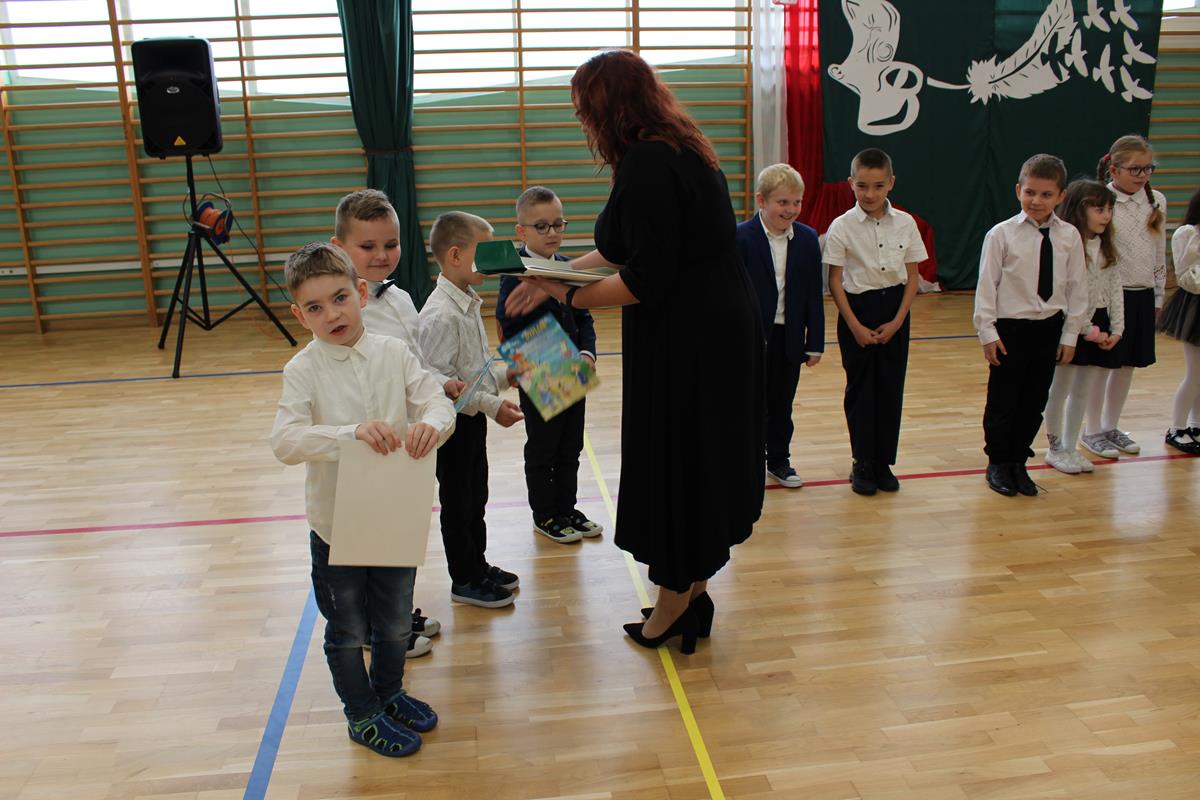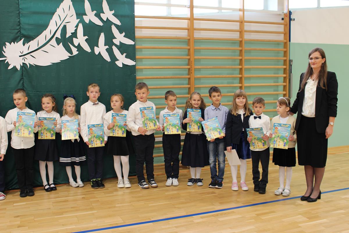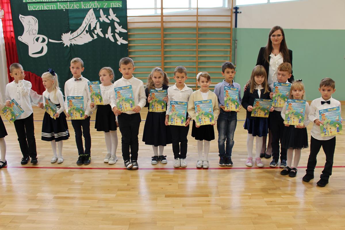 Następnie pierwszacy wykonali krótki program artystyczny, podczas którego zaprezentowali swoje talenty recytatorskie i wokalne, wzbudzając aplauz wśród zgromadzonej publiczności. Po części artystycznej wychowawczynie wręczyły wszystkim uczniom pamiątkowe dyplomy. Na koniec głos zabrał Pan Dyrektor – życząc pierwszakom wielu sukcesów w nauce.