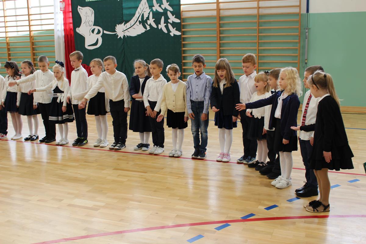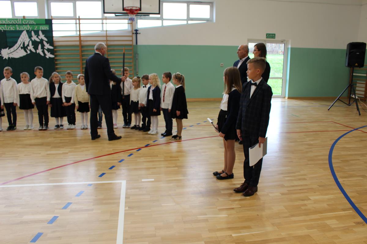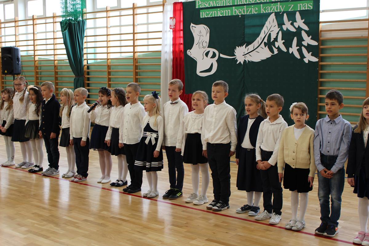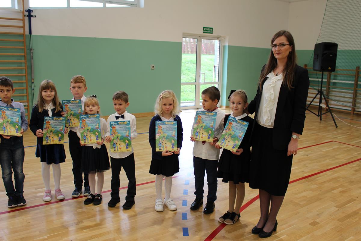Następnie pierwszacy wykonali krótki program artystyczny, podczas którego zaprezentowali swoje talenty recytatorskie i wokalne, wzbudzając aplauz wśród zgromadzonej publiczności. Po części artystycznej wychowawczynie wręczyły wszystkim uczniom pamiątkowe dyplomy. Na koniec głos zabrał Pan Dyrektor – życząc pierwszakom wielu sukcesów w nauce.