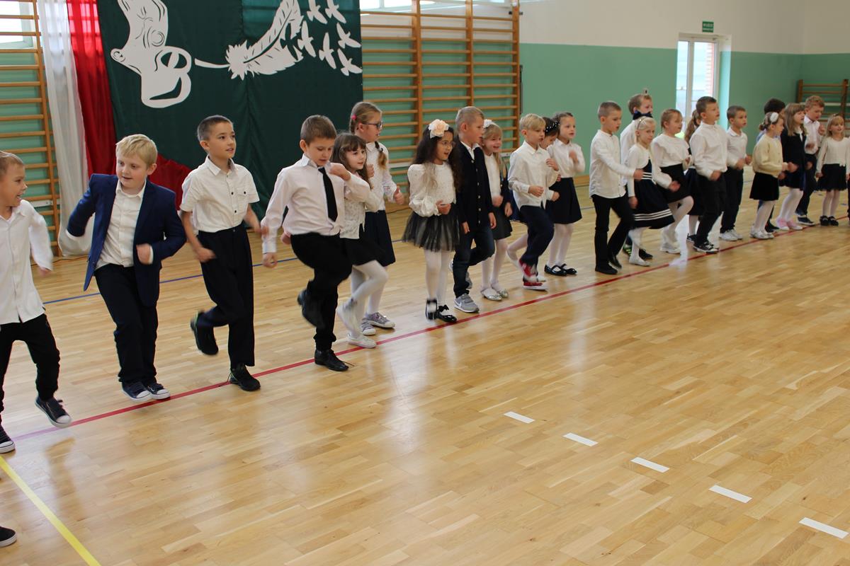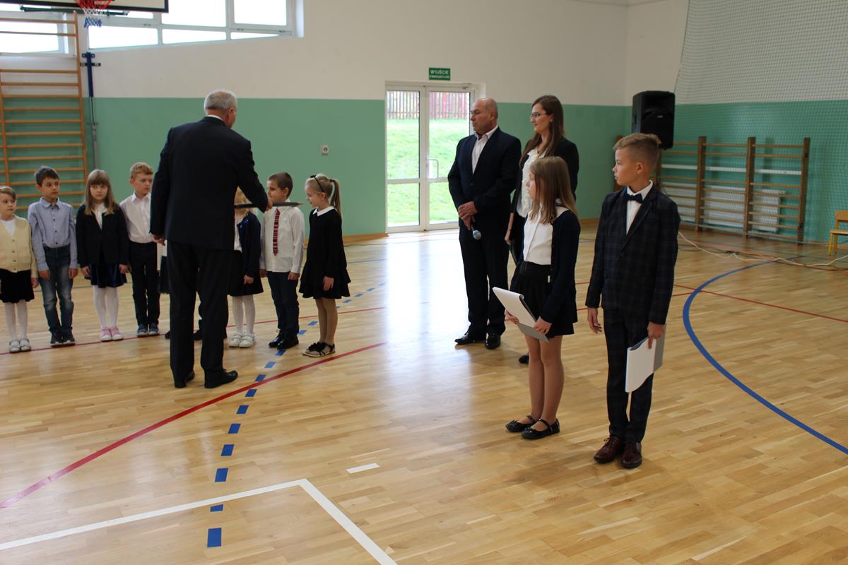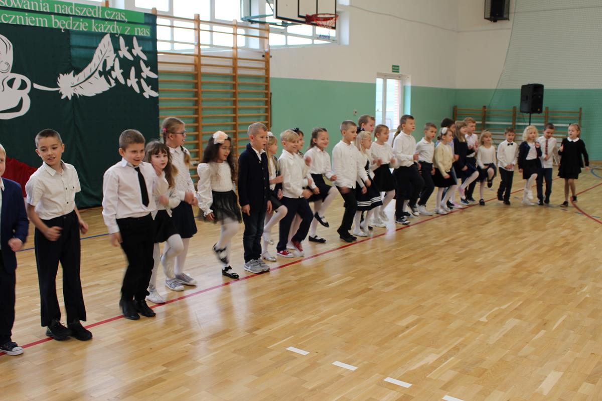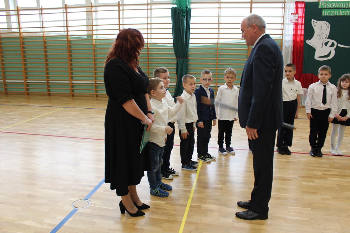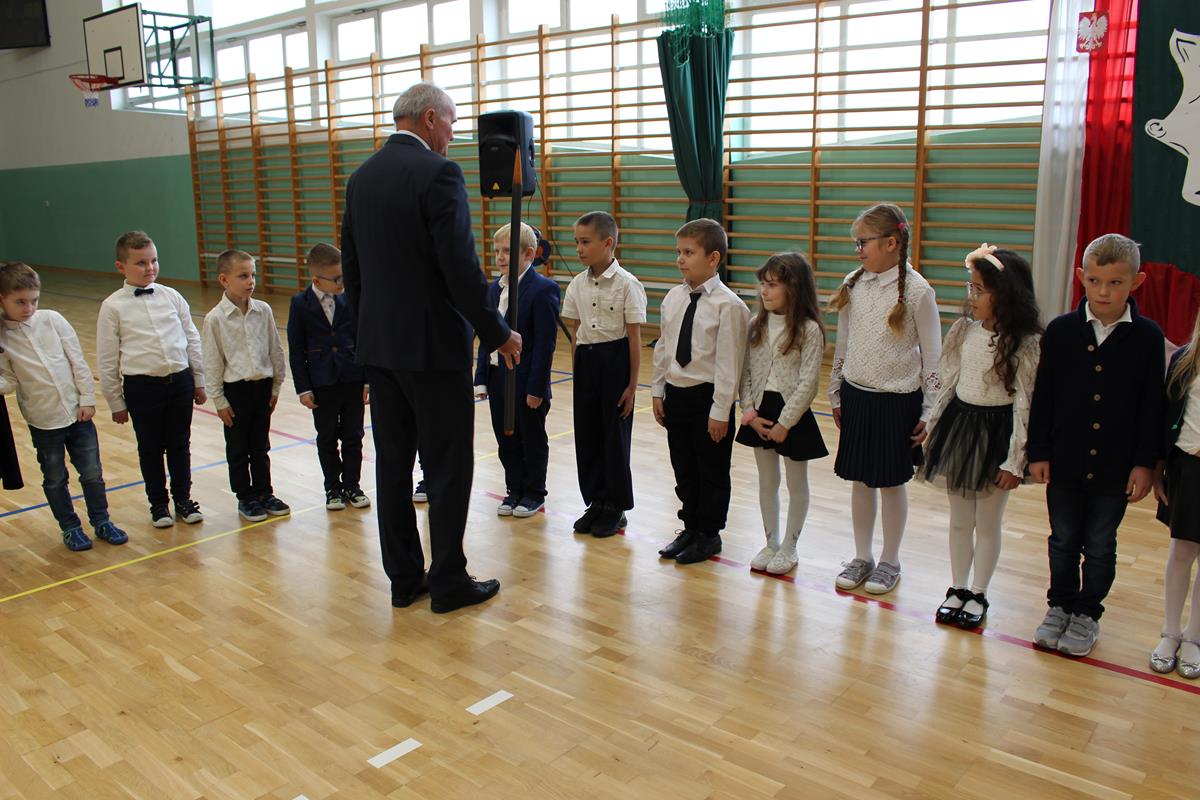 Następnie pierwszacy wykonali krótki program artystyczny, podczas którego zaprezentowali swoje talenty recytatorskie i wokalne, wzbudzając aplauz wśród zgromadzonej publiczności. Po części artystycznej wychowawczynie wręczyły wszystkim uczniom pamiątkowe dyplomy. Na koniec głos zabrał Pan Dyrektor – życząc pierwszakom wielu sukcesów w nauce.