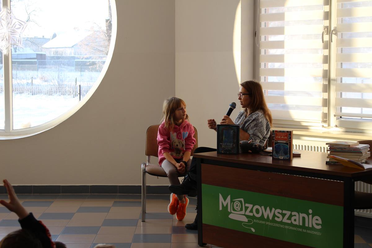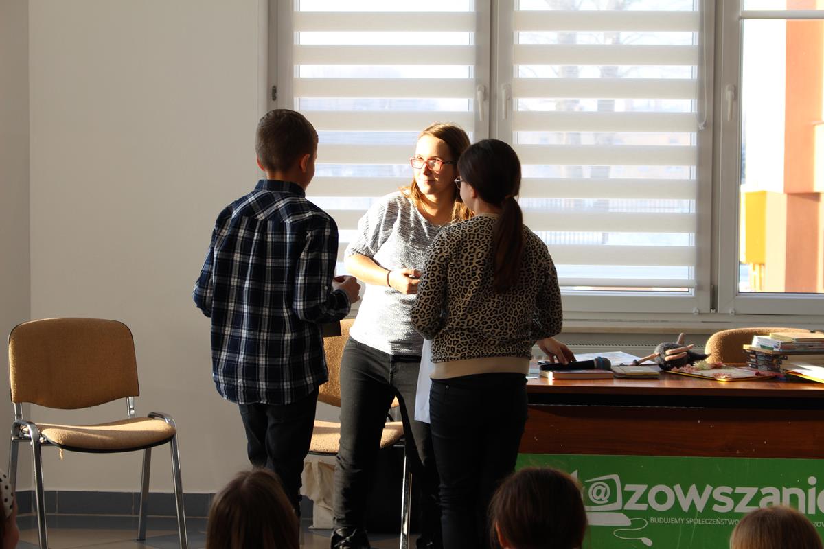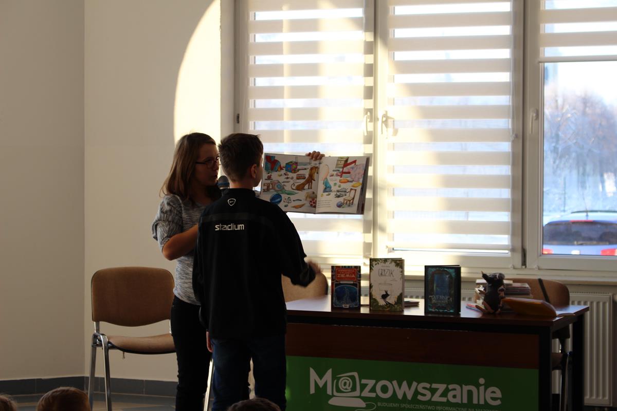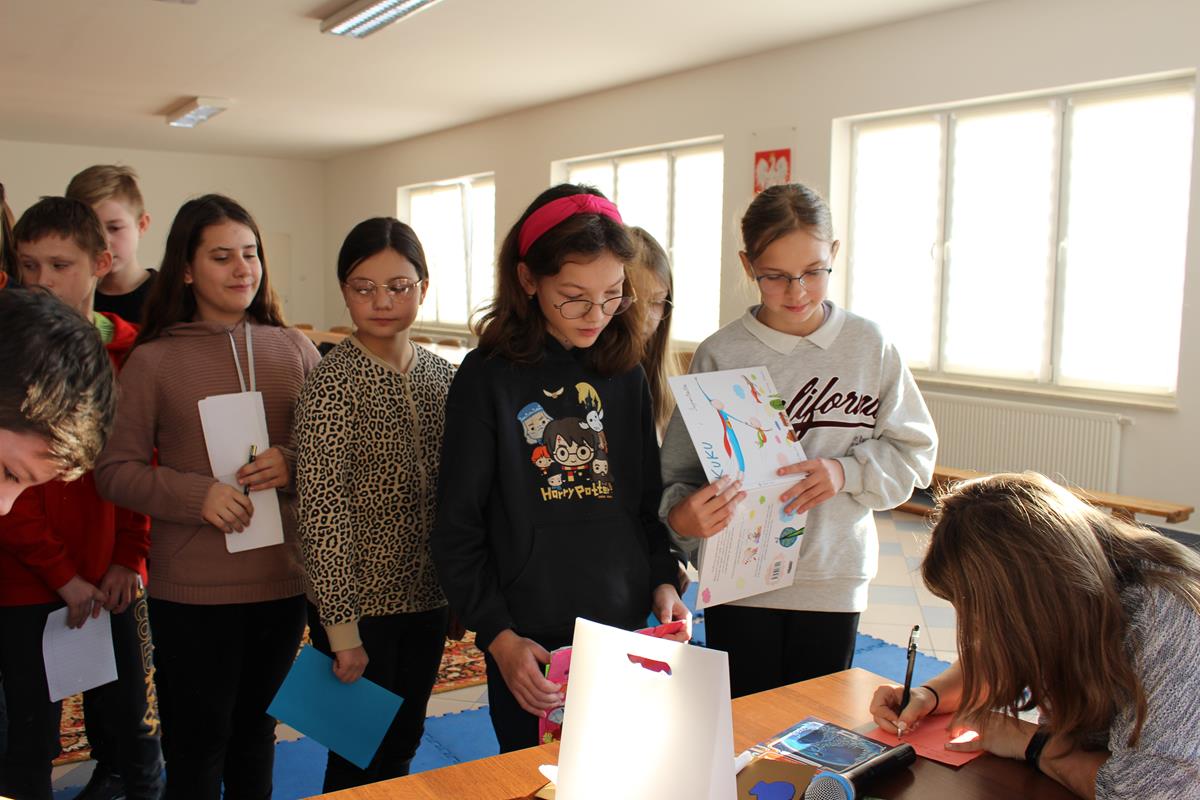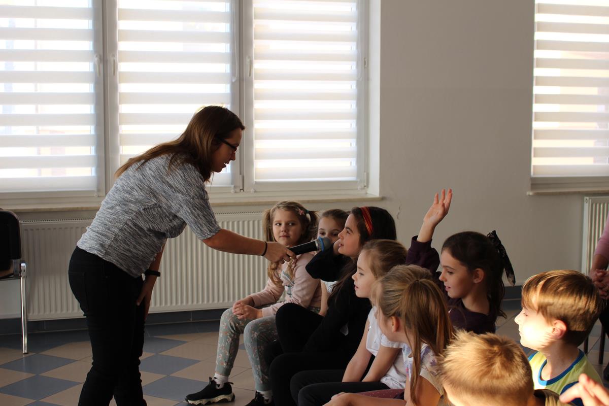 O godzinie 9:00 odbyło się spotkanie dla klas 0-3, o 10:00 zaś dla klas 4-7. Zarówno młodsi, jak i starsi uczniowie brali czynny udział w spotkaniu - odpowiadali na pytania, rozwiązywali quiz czy wykonywali różne zadania wymyślone przez gościa. Pani Monika opowiadała o wydanych książkach, o swoich pasjach, o tym, jak żyje się na co dzień we Francji, podpisała także książki zakupione przez uczniów.