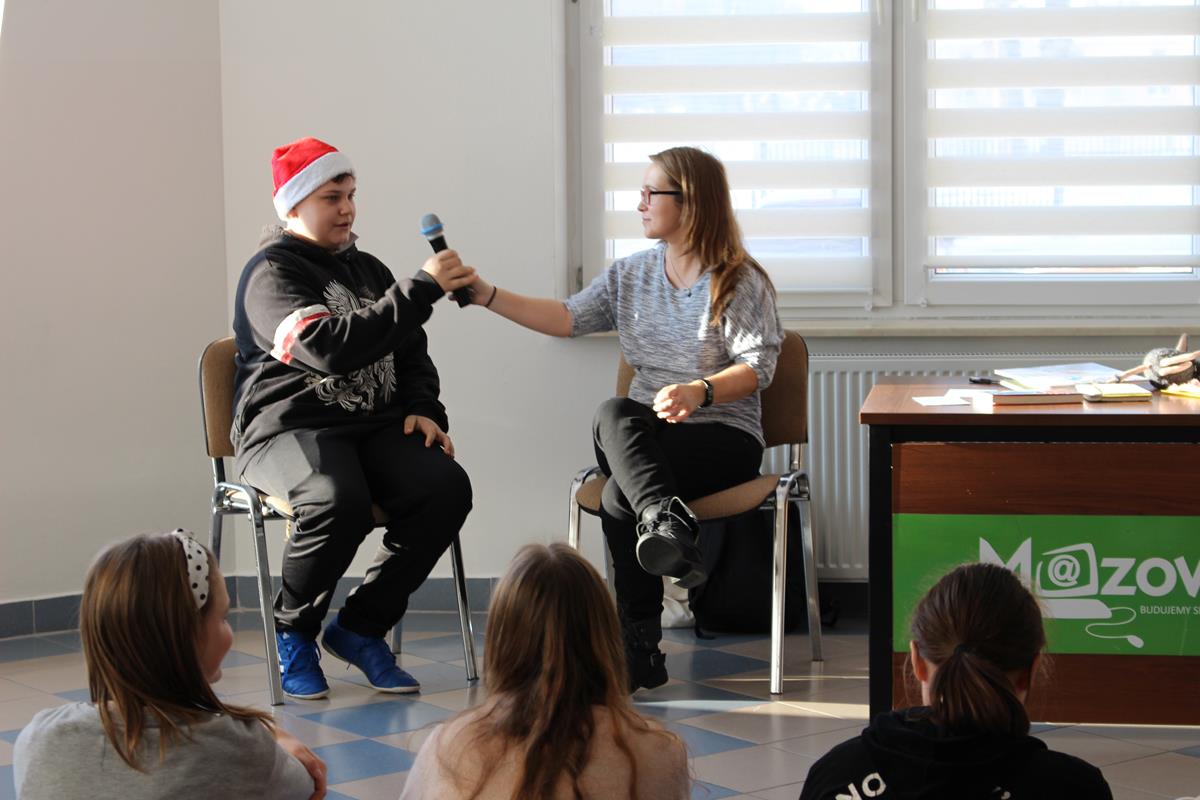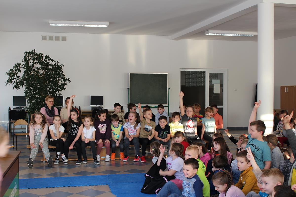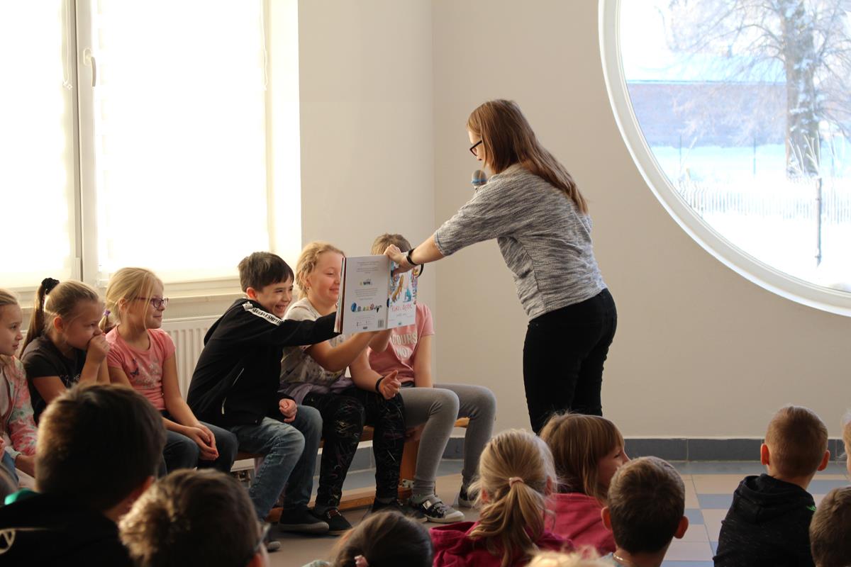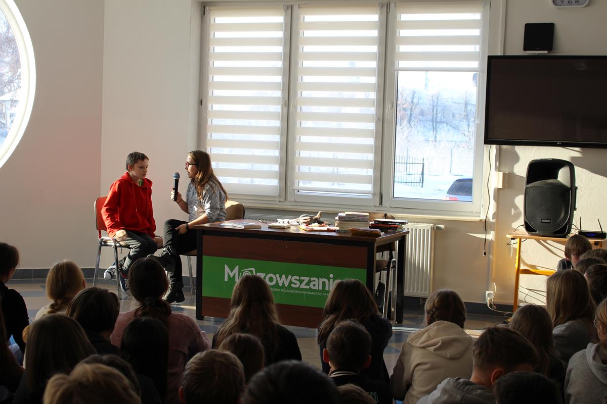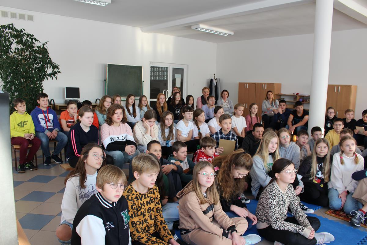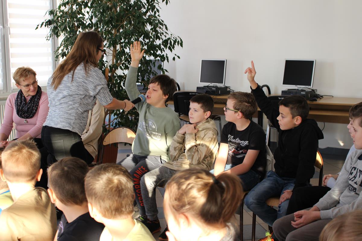 O godzinie 9:00 odbyło się spotkanie dla klas 0-3, o 10:00 zaś dla klas 4-7. Zarówno młodsi, jak i starsi uczniowie brali czynny udział w spotkaniu - odpowiadali na pytania, rozwiązywali quiz czy wykonywali różne zadania wymyślone przez gościa. Pani Monika opowiadała o wydanych książkach, o swoich pasjach, o tym, jak żyje się na co dzień we Francji, podpisała także książki zakupione przez uczniów.