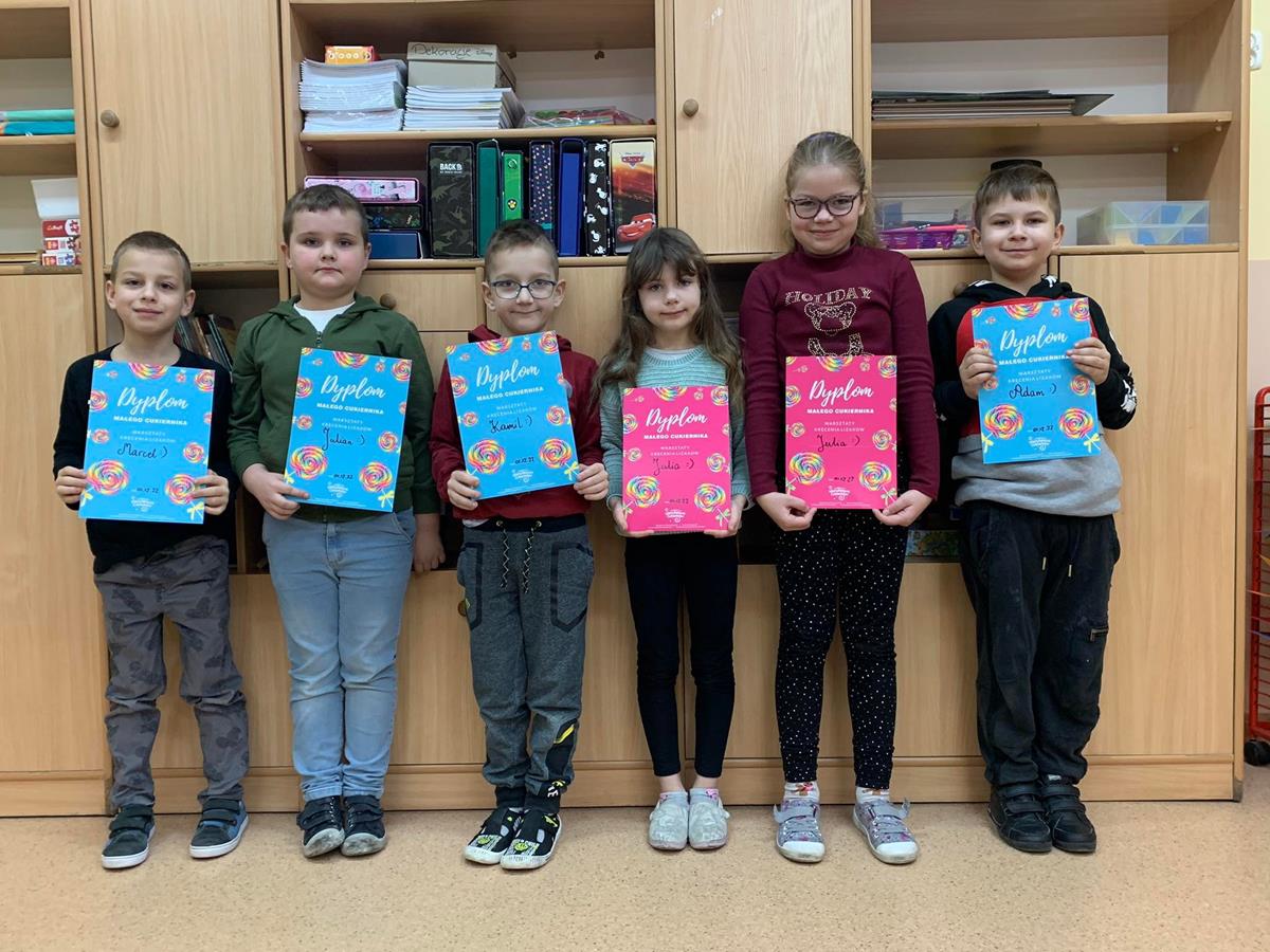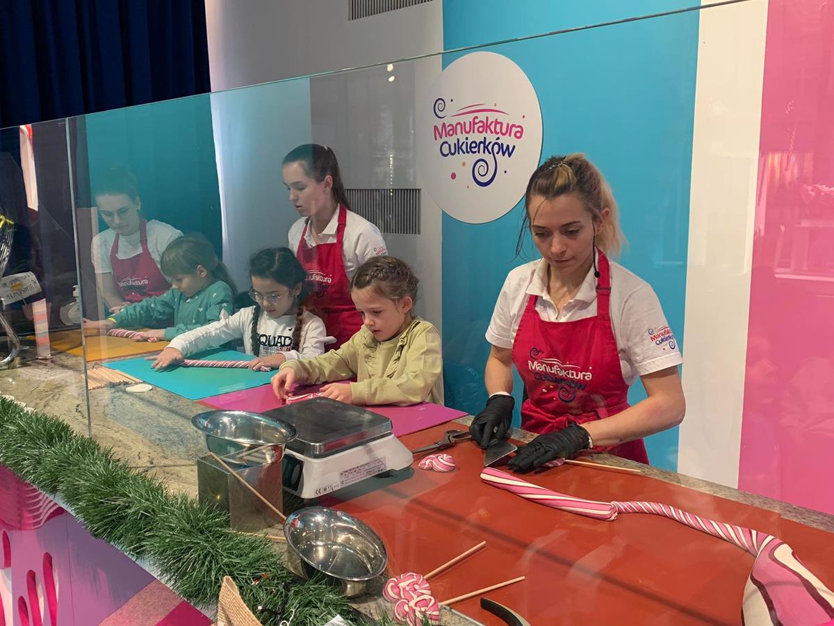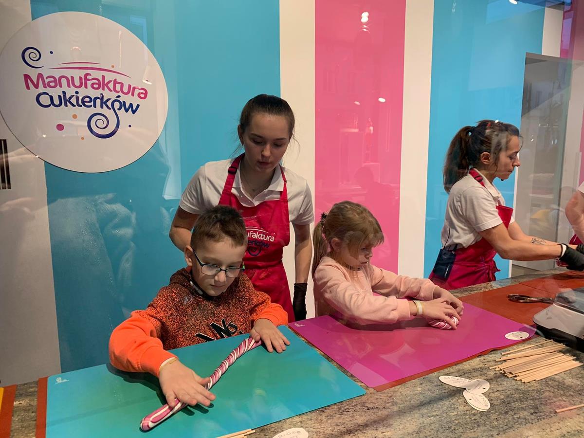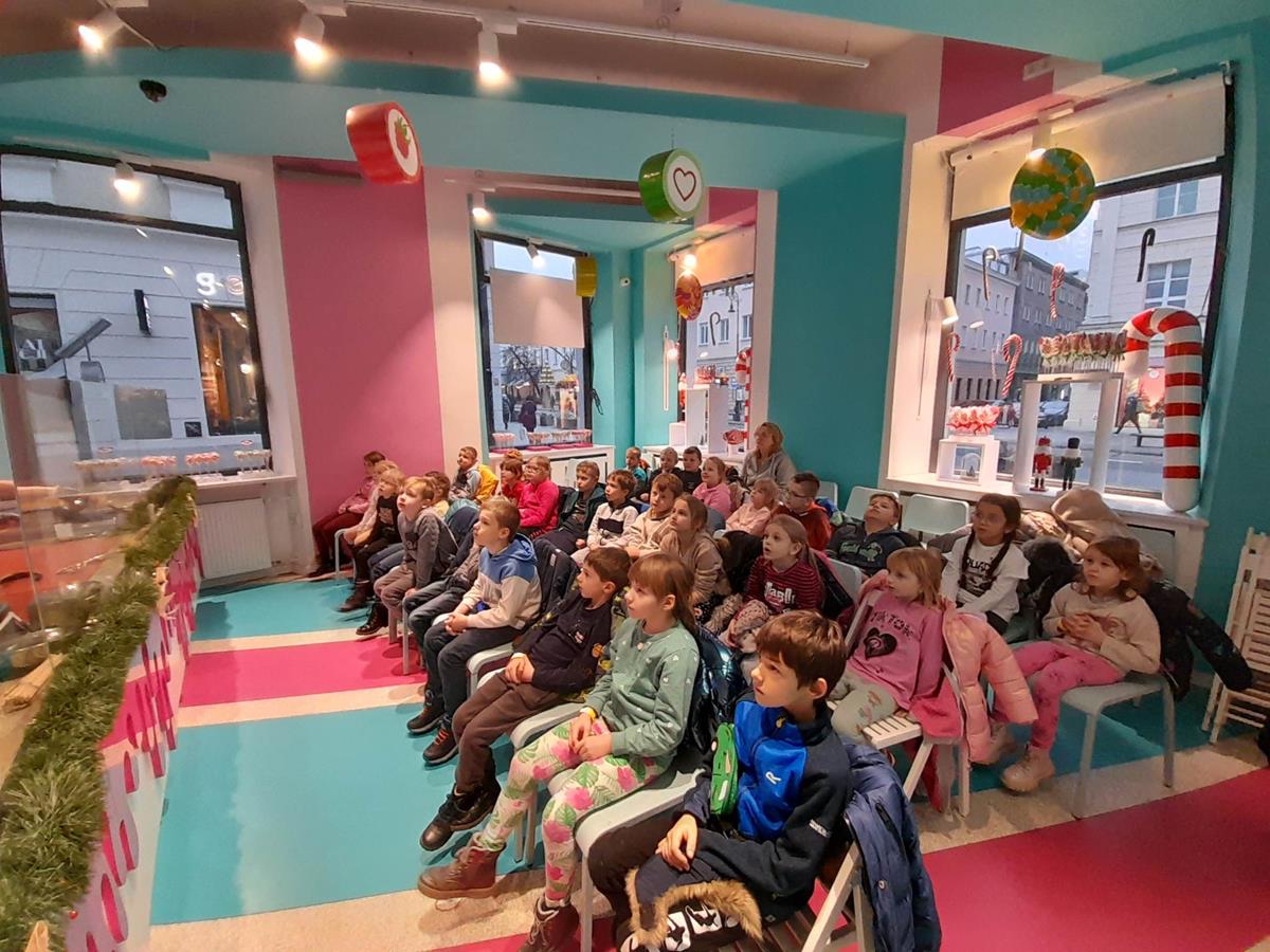 Poza tradycyjną zabawą na strefach, dzieci wzięły udział w świątecznych warsztatach noszących tytuł „Ozdabianie drewnianych bombek”, w trakcie, których rozwinęły swoje zdolności manualne, kreatywność i twórczość. Nie zabrakło również spotkania z Mikołajem, który nazywając dzieci „Smart Bystrzakami” wprowadził świąteczny nastrój, zapewnił gwiazdkowe atrakcje oraz wyzwolił radość i zadowolenie. Kolejnym punktem programu była wizyta w „Manufakturze Cukierków”. Rozpoczęła się ona od pokazu tworzenia słodyczy. Na początku karmelarze dokładnie opowiedzieli i pokazali wszystkie etapy powstawania słodyczy: od gotowania karmelu, jego barwienia aż po tworzenie wzorków. Kiedy masa karmelowa była już przygotowana każdy uczestnik wycieczki stanął przy stole produkcyjnym i własnoręcznie wykonał swojego wymarzonego lizaka. Później uczniowie wzięli udział w konkursie - odpowiadali na pytania kierowane w ich stronę przez pracowników manufaktury. Za uwagę i prawidłowe odpowiedzi zostali nagrodzeni ciepłymi karmelkami oraz dyplomami „Małego Cukiernika”. To było dla nich nie tylko wyjątkowe przeżycie, ale również niezwykła podróż w czasie – poznali cały proces ręcznego tworzenia słodyczy od podstaw i poczuli ich cudowny zapach. Wycieczka była bardzo udana, dostarczyła dzieciom wspaniałych przeżyć i atrakcji. Wszyscy zadowoleni i uśmiechnięci wrócili z powrotem do szkoły.