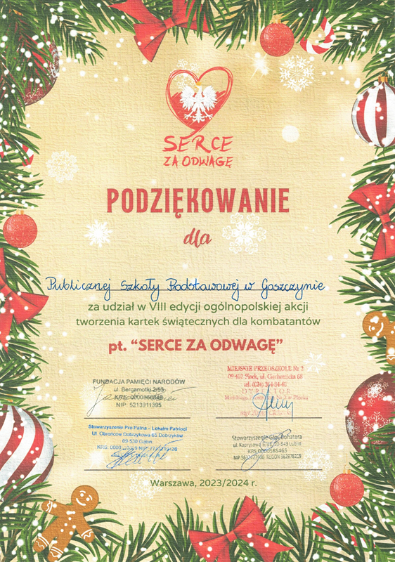 Nasza szkoła wzięła udział w ogólnopolskiej akcji „Serce za Odwagę”, organizowanej przez Fundację Pamięci Narodów. Inicjatywa polegała na przygotowaniu przez uczniów kartek świątecznych z życzeniami dla Weteranów II wojny światowej, którym zawdzięczamy wolną i niepodległą Polskę. W ten symboliczny sposób podziękowaliśmy za wielką odwagę, jaką odznaczali się Bohaterowie w czasie wojny.