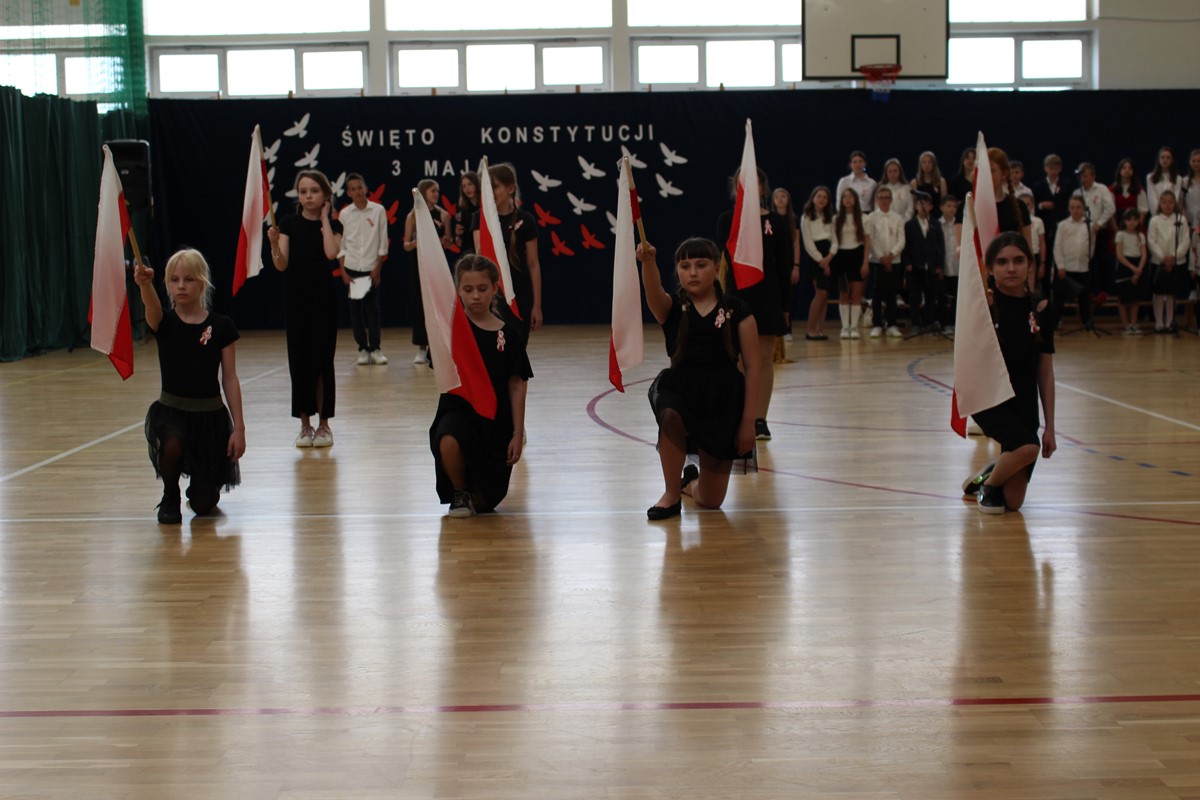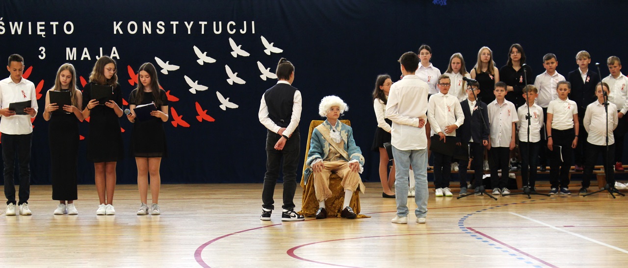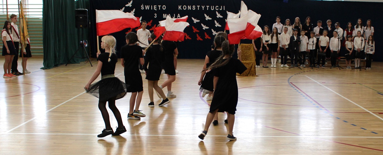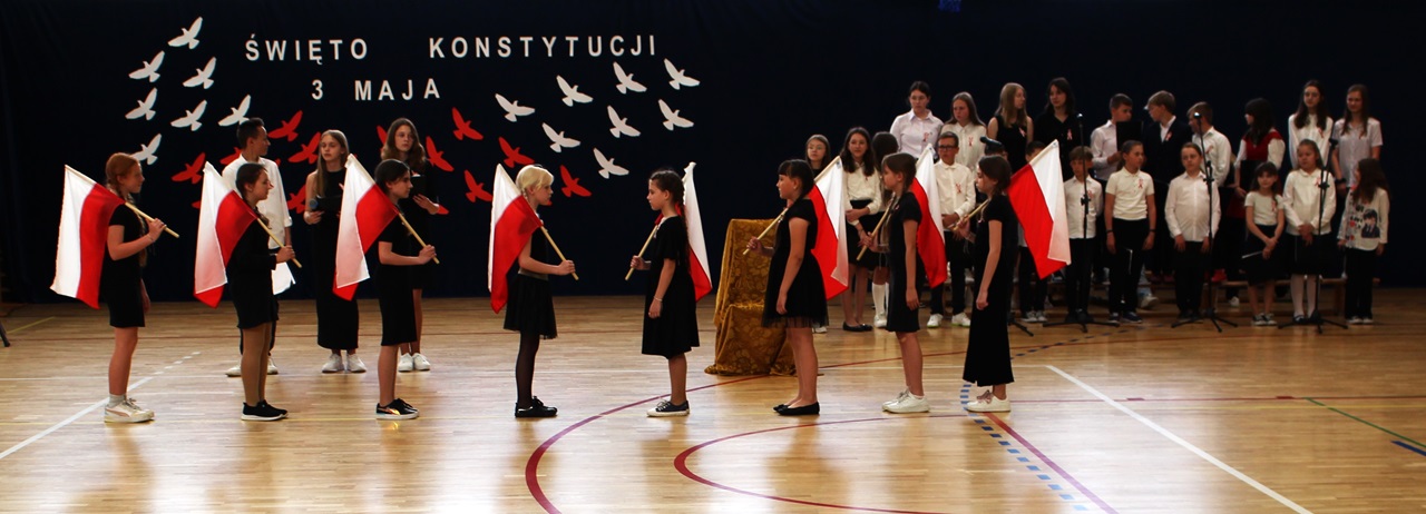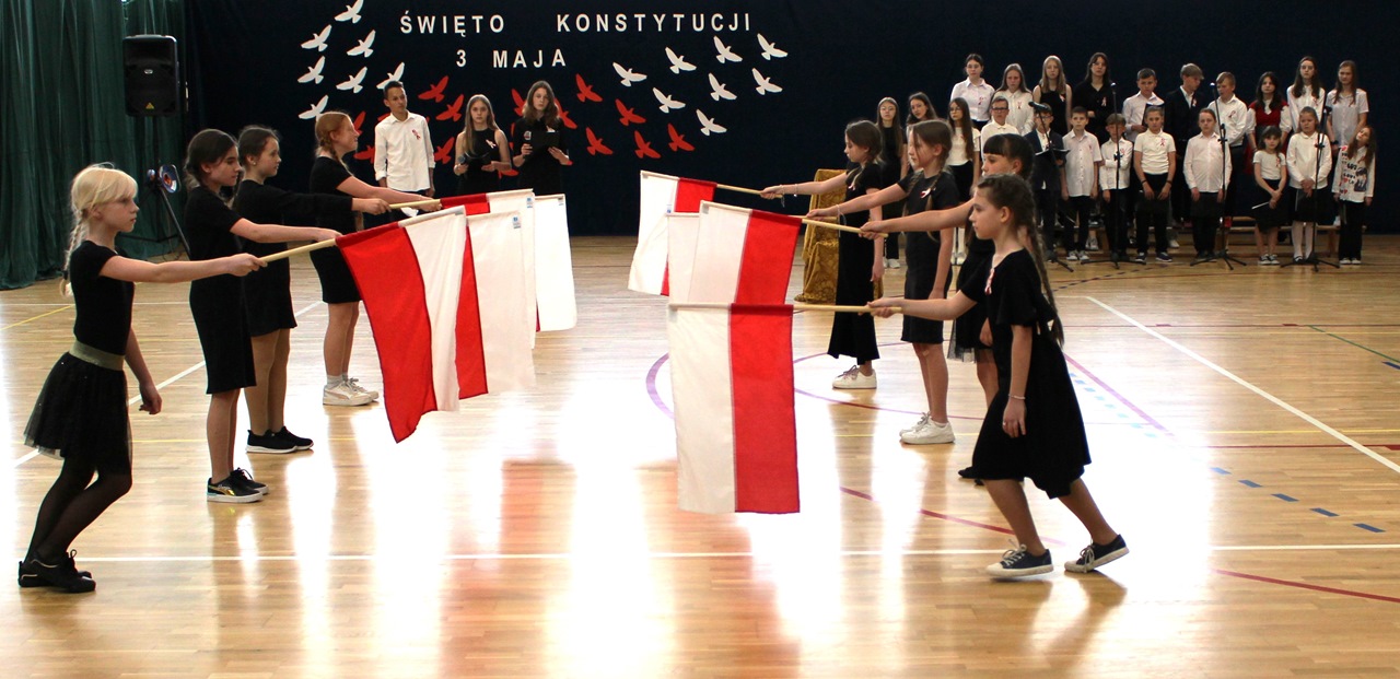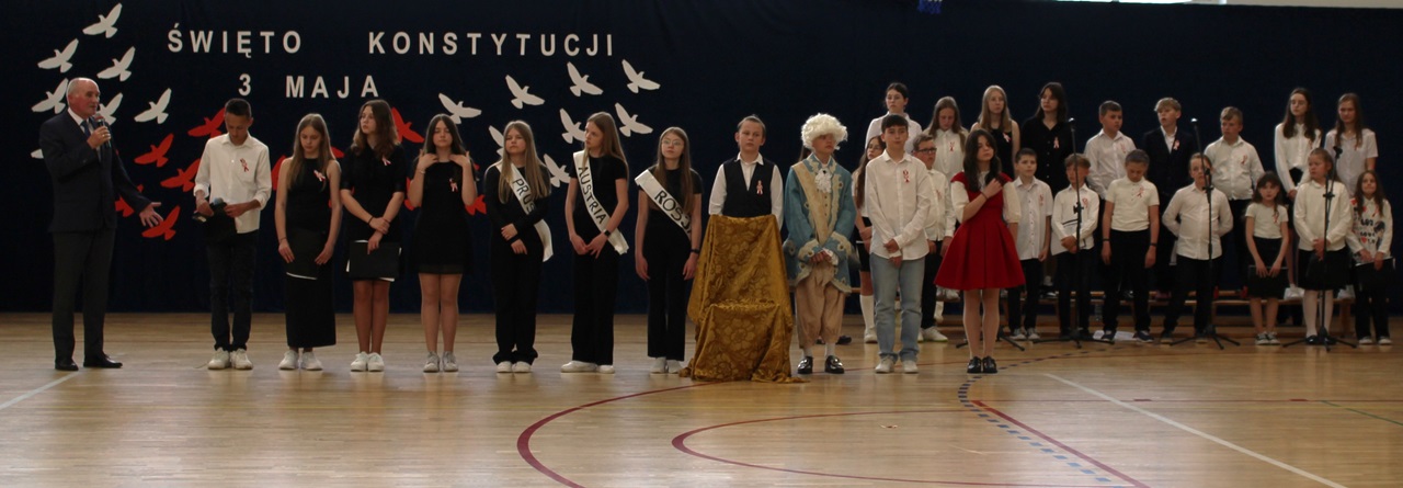 W poniedziałek, 6 maja 2024 roku w naszej szkole obchodziliśmy 233. rocznicę uchwalenia Konstytucji 3 Maja. Była to wspaniała okazja, by uzmysłowić wszystkim, jak ważną rolę i znaczenie mają słowa: Wolność, Naród i Ojczyzna. W celu podkreślenia patriotycznego charakteru uroczystości, wszyscy zebrani przybyli do hali sportowej w strojach galowych, z przypiętymi do piersi biało-czerwonymi kotylionami. Po uroczystym wprowadzeniu pocztu sztandarowego, cała społeczność Publicznej Szkoły Podstawowej w Goszczynie odśpiewała hymn państwowy. Następnie uczniowie z klas IV a i VI b oraz chór szkolny zaprezentowali część artystyczną. W wystąpieniach, wierszach i pieśniach patriotycznych opowiedzieli zebranym o doniosłym i jakże ważnym dla Polski wydarzeniu, jakim było uchwalenie Konstytucji 3 Maja. Całość uświetnił występ uczennic z klasy IV a, które wykonały przepiękny taniec z biało-czerwonymi flagami. Na zakończenie głos zabrał Dyrektor Szkoły - Pan Mariusz Wangryn, który w swoim wystąpieniu podkreślił znaczenie tej rocznicy oraz zachęcił wszystkich do pielęgnowania polskich tradycji i wartości oraz podziękował nauczycielom odpowiedzialnym za przygotowanie uroczystości.