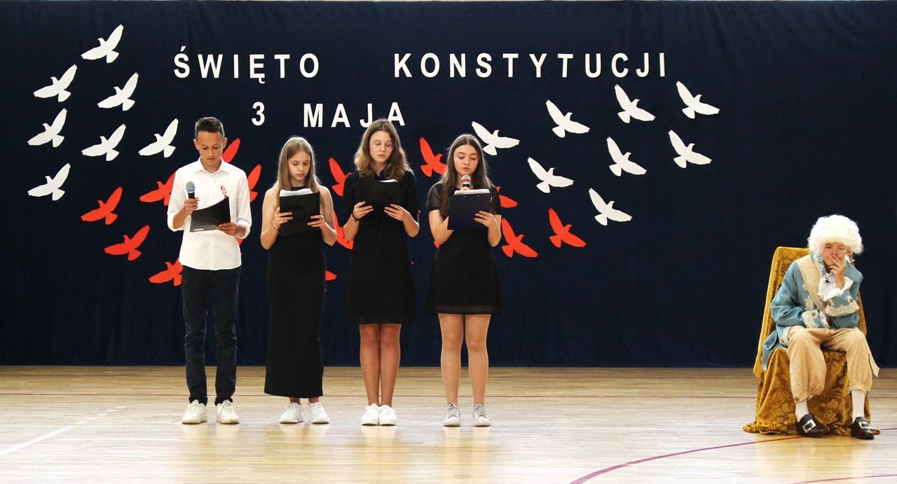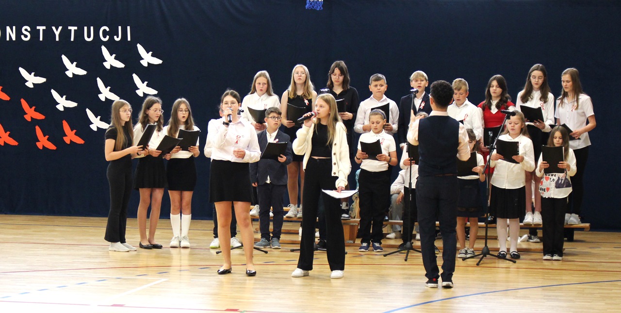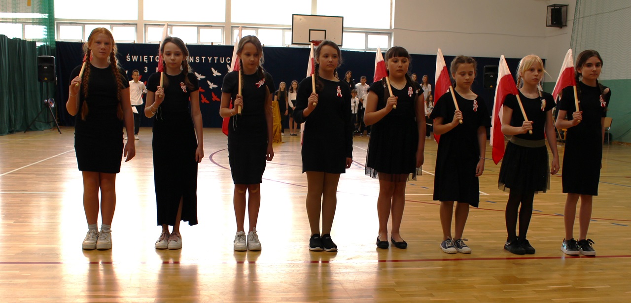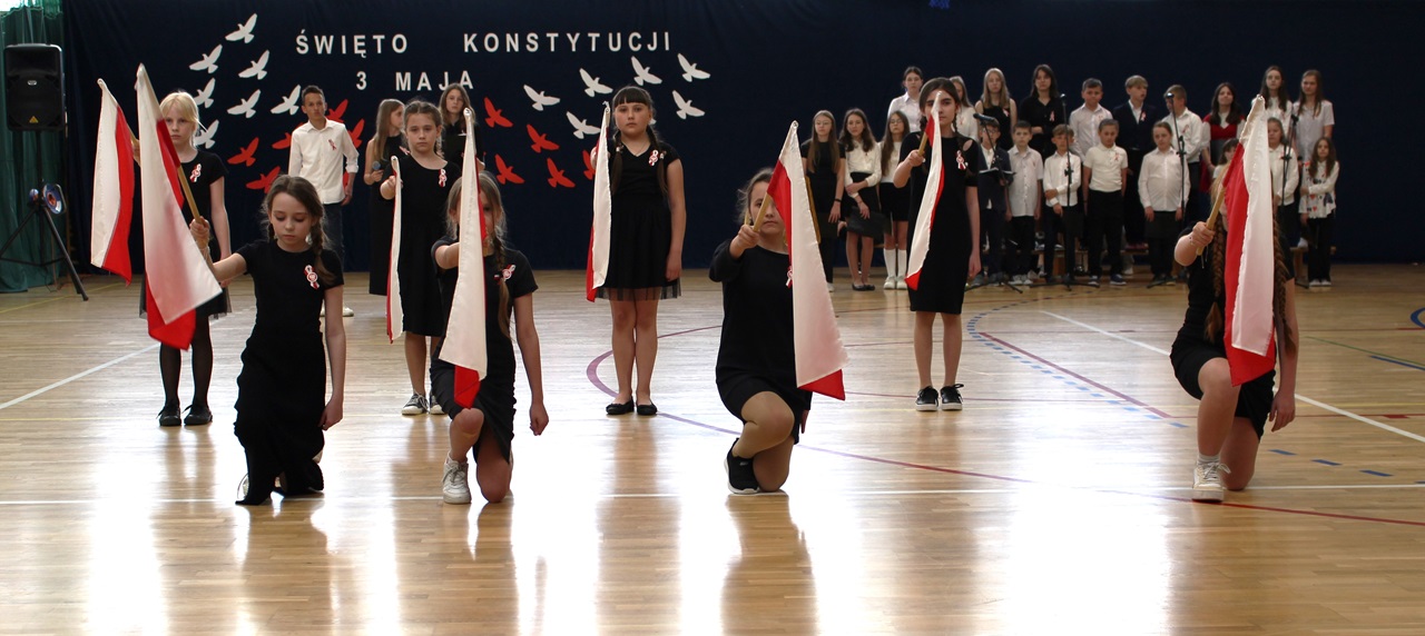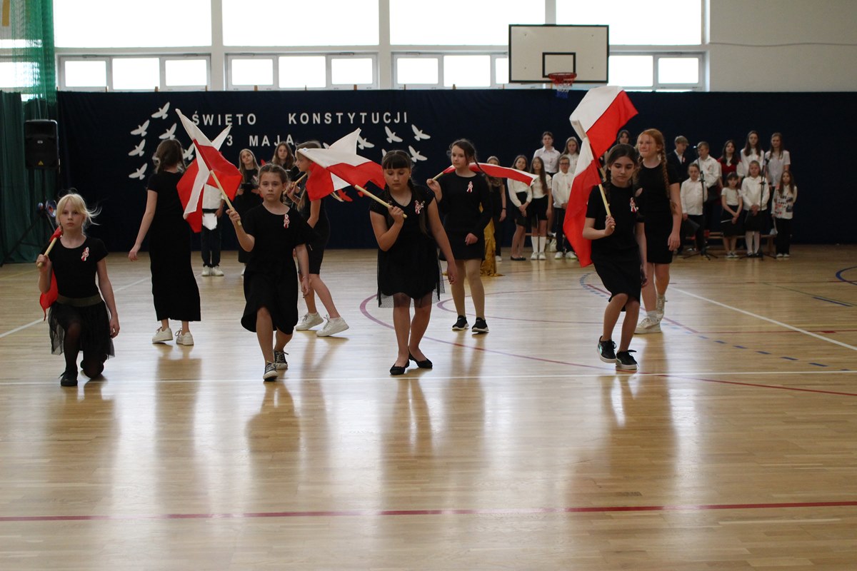 W poniedziałek, 6 maja 2024 roku w naszej szkole obchodziliśmy 233. rocznicę uchwalenia Konstytucji 3 Maja. Była to wspaniała okazja, by uzmysłowić wszystkim, jak ważną rolę i znaczenie mają słowa: Wolność, Naród i Ojczyzna. W celu podkreślenia patriotycznego charakteru uroczystości, wszyscy zebrani przybyli do hali sportowej w strojach galowych, z przypiętymi do piersi biało-czerwonymi kotylionami. Po uroczystym wprowadzeniu pocztu sztandarowego, cała społeczność Publicznej Szkoły Podstawowej w Goszczynie odśpiewała hymn państwowy. Następnie uczniowie z klas IV a i VI b oraz chór szkolny zaprezentowali część artystyczną. W wystąpieniach, wierszach i pieśniach patriotycznych opowiedzieli zebranym o doniosłym i jakże ważnym dla Polski wydarzeniu, jakim było uchwalenie Konstytucji 3 Maja. Całość uświetnił występ uczennic z klasy IV a, które wykonały przepiękny taniec z biało-czerwonymi flagami. Na zakończenie głos zabrał Dyrektor Szkoły - Pan Mariusz Wangryn, który w swoim wystąpieniu podkreślił znaczenie tej rocznicy oraz zachęcił wszystkich do pielęgnowania polskich tradycji i wartości oraz podziękował nauczycielom odpowiedzialnym za przygotowanie uroczystości.
