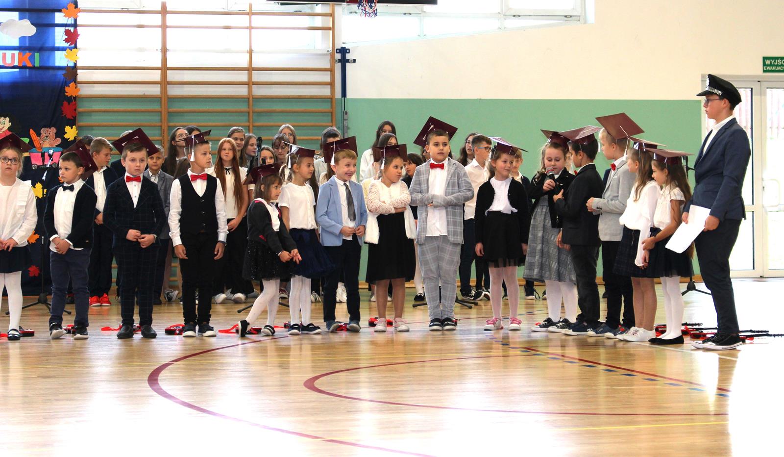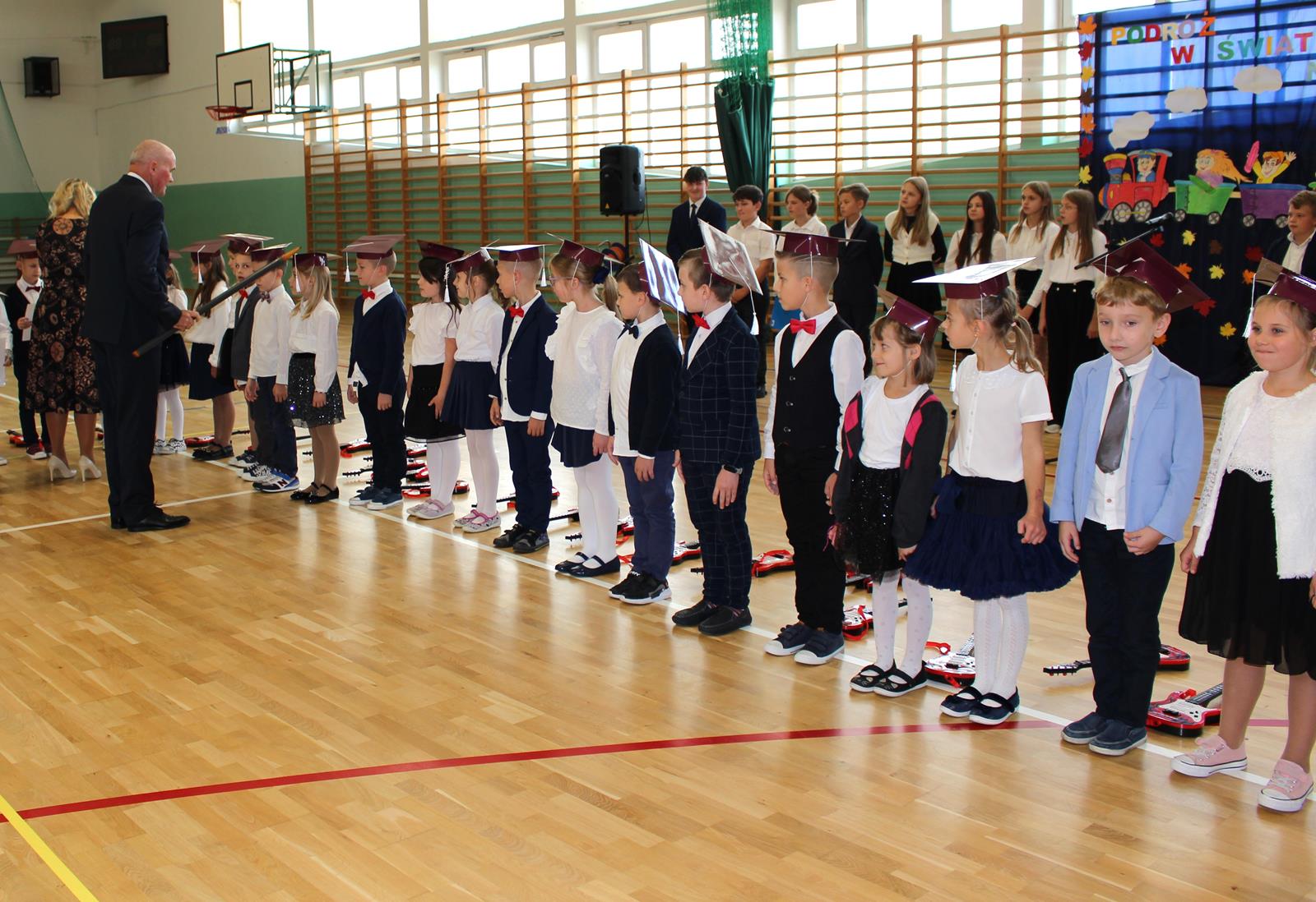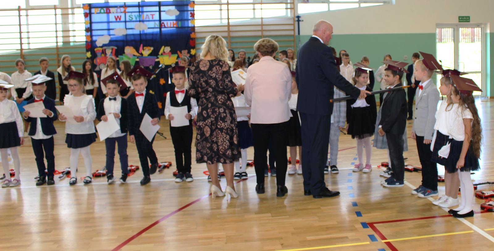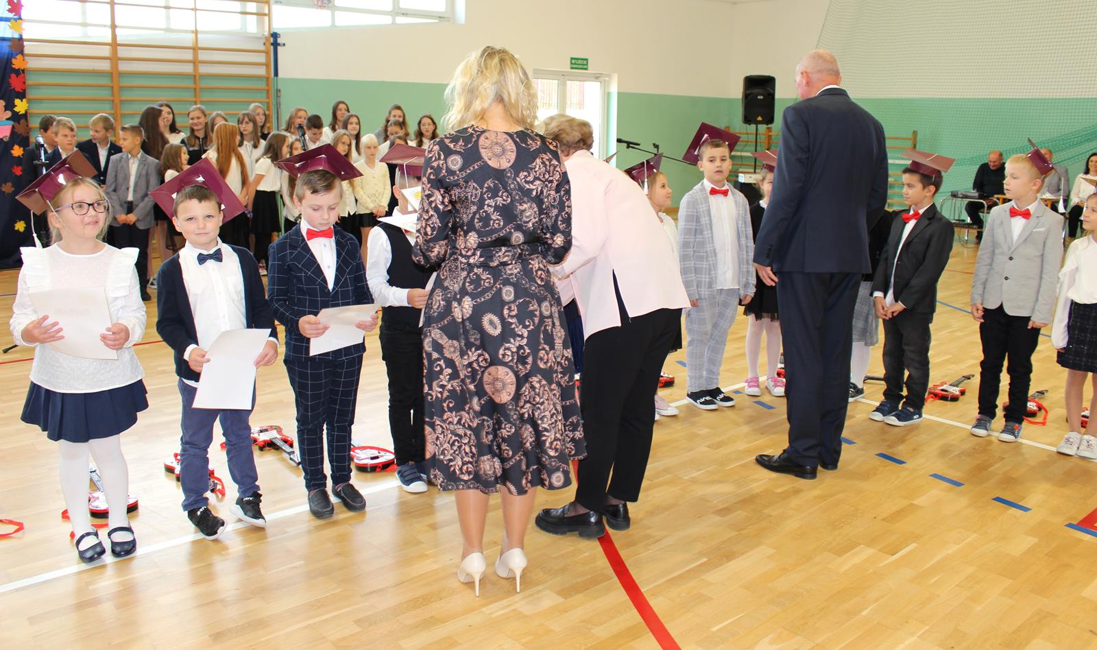 Tego dnia święto obchodzili również uczniowie klasy 1 SP. Rozpoczynając podróż w świat nauki zostali pasowani na ucznia szkoły podstawowej. W ten sposób pierwszoklasiści zostali oficjalnie włączeni do grona uczniów Szkoły Podstawowej w Goszczynie. Pierwszaki głośno i z przekonaniem przyrzekały być dobrymi i pilnymi uczniami oraz rzetelnie wypełniać swoje obowiązki, o czym przypominać im będą otrzymane pamiątkowe dyplomy.