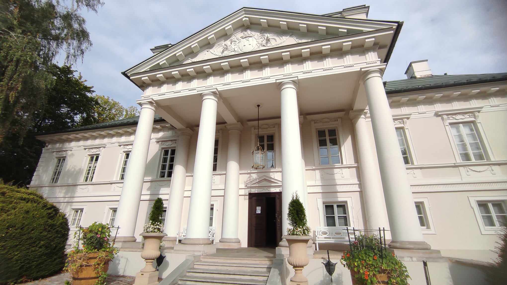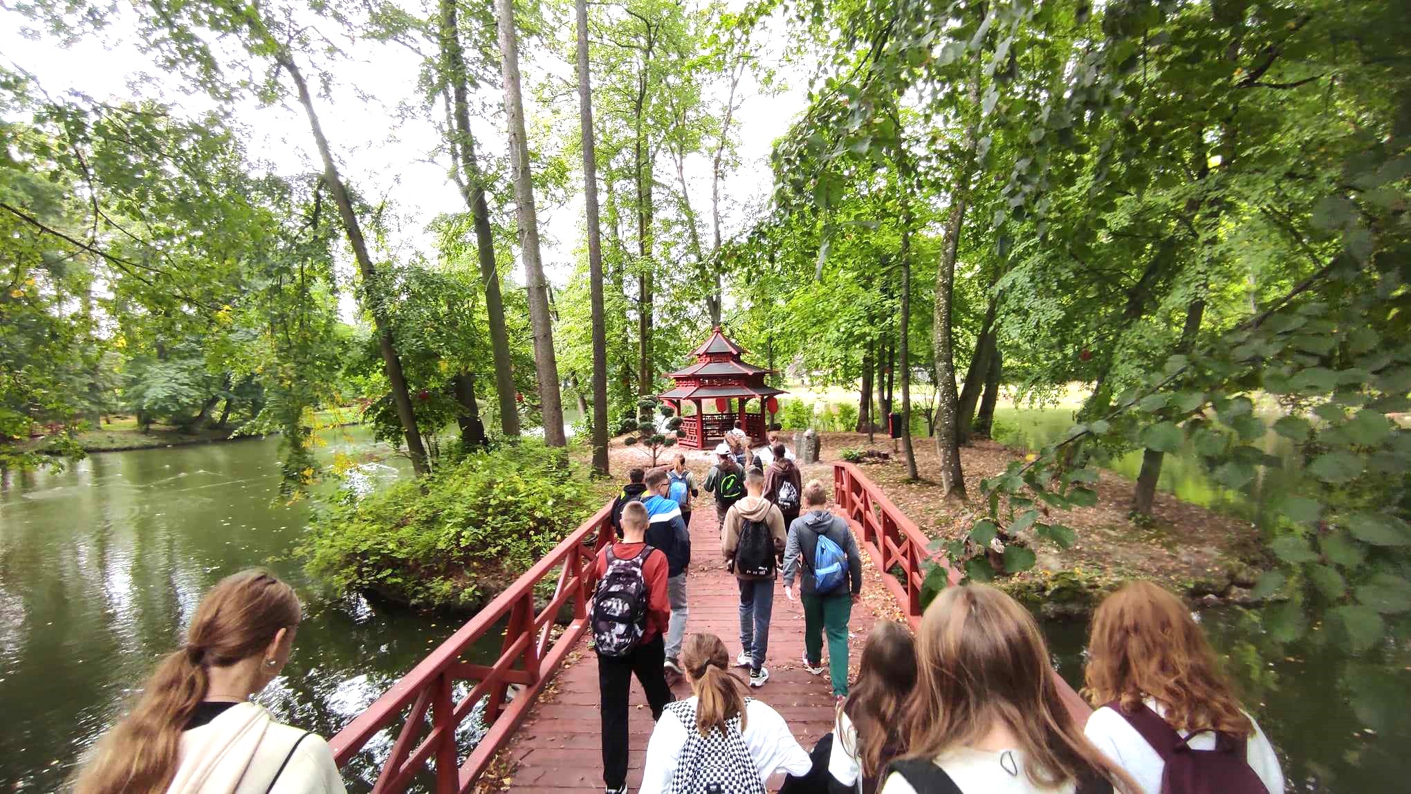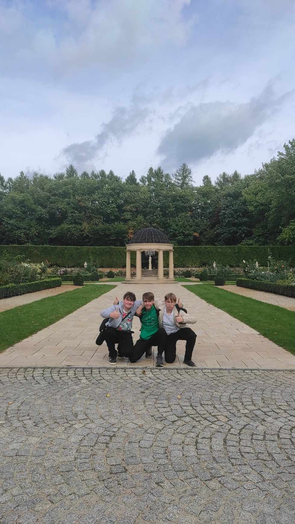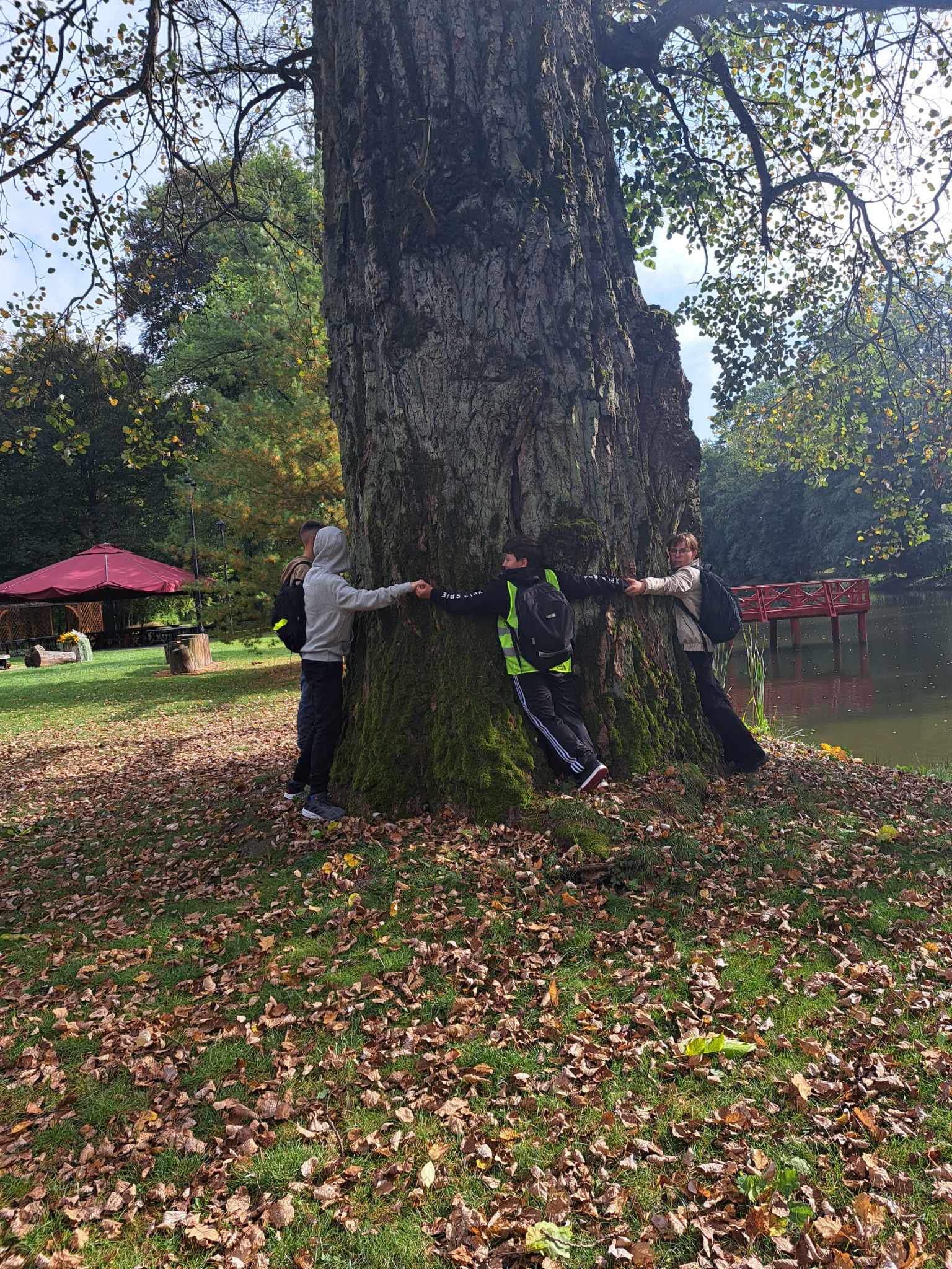 Następnie pojechaliśmy do parku przy Pałacu w Małej Wsi. Na miejscu sprawdzaliśmy, ile osób potrzeba, żeby objąć drzewo, które jest uznane za pomnik przyrody - potrzebne było siedem osób, nie wiedziałem, że drzewo może być tak pokaźnych rozmiarów. W ogrodach spacerowaliśmy pomiędzy stawami, ogromnymi drzewami, zielonymi labiryntami z bukszpanu a  ogrodem różanym. Zrobiliśmy pamiątkowe zdjęcie na ogromnej huśtawce zawieszonej na drzewie. Obeszliśmy Pałac i cały kompleks z zewnątrz.