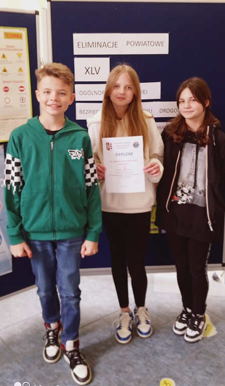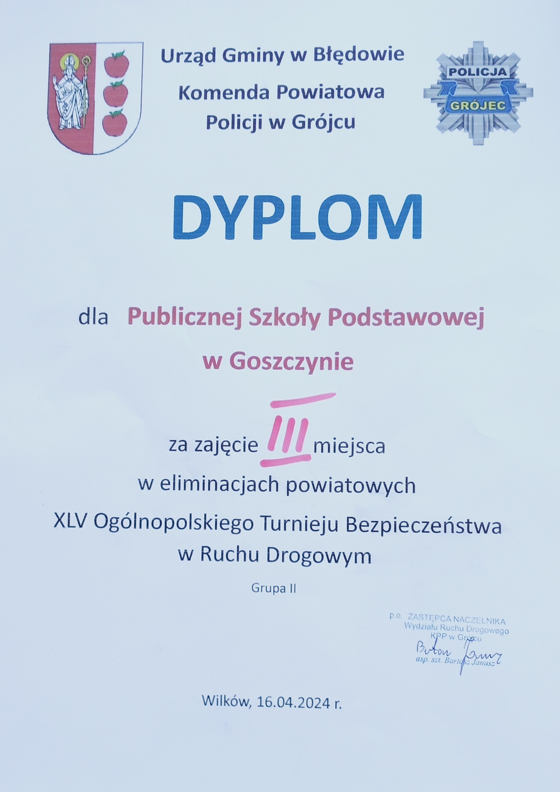 Uczniowie naszej szkoły brali udział w dniu 16 kwietnia 2024 r. w eliminacjach powiatowych XLV Ogólnopolskiego Turnieju Bezpieczeństwa w Ruchu Drogowym powiatu grójeckiego, które rozegrano w Szkole Podstawowej w Wilkowie. Celem Turnieju są działania na rzecz poprawy stanu bezpieczeństwa w ruchu drogowym, w tym bezpieczeństwa dzieci i młodzieży szkolnej. Konkurs merytorycznie przygotowali i przeprowadziła Szkoła Podstawowa w Wilkowie, pan Tomasz Augusiewicz oraz przedstawiciel Komendy Powiatowej Policji w Grójcu i przedstawiciele Ochotniczej Straży Pożarnej. Do eliminacji powiatowych przystąpiło 7 drużyn w dwóch kategoriach wiekowych. W trakcie konkursu zostały przeprowadzone testy skrzyżowań, pierwsza pomoc, tor przeszkód (slalom, żmijka, tarka, zegar i kwadrat).