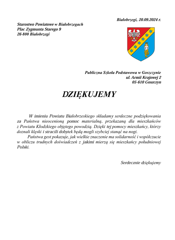 "Samorząd Uczniowski wraz z opiekunami, z całego serca dziękuje każdemu uczniowi za ogromne zaangażowanie i udział w akcji zbierania pomocy dla osób dotkniętych powodzią. Wasza postawa pełna empatii i chęci niesienia pomocy jest niezwykle budująca. Dzięki Waszemu wsparciu udało się zebrać wiele niezbędnych rzeczy, które trafiły do potrzebujących przez Powiat Białobrzeski.