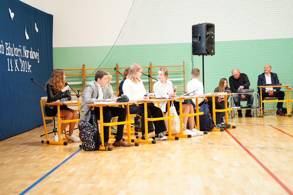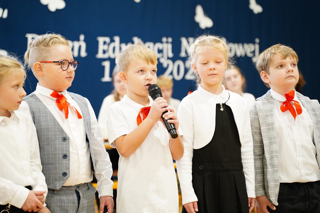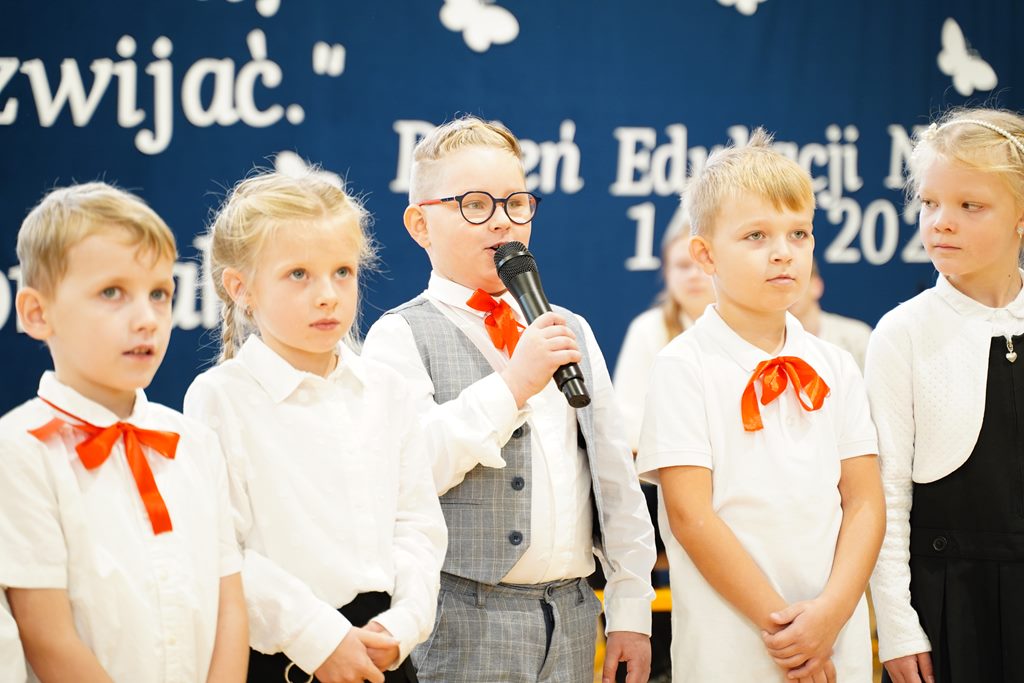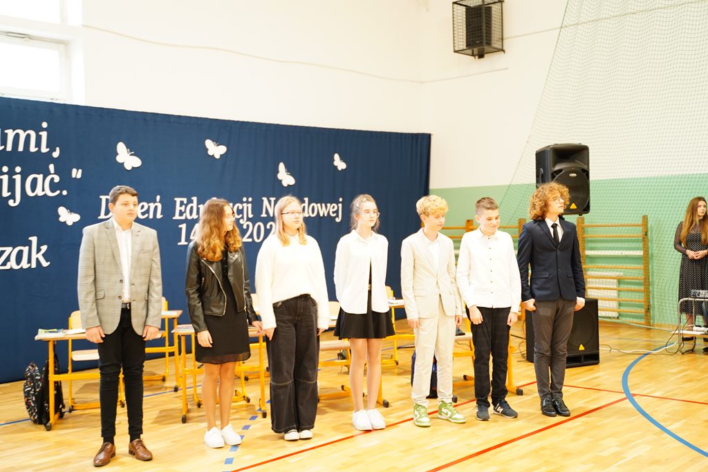 Następnie odbyła się krótka część artystyczna z okazji Dnia Edukacji Narodowej, przygotowana przez starszych kolegów i koleżanki oraz Samorząd Uczniowski. Nie zabrakło także pięknych życzeń dla nauczycieli z okazji ich święta. Był to wyjątkowy dzień pełen wzruszeń i radości, który na długo pozostanie w pamięci wszystkich uczestników.