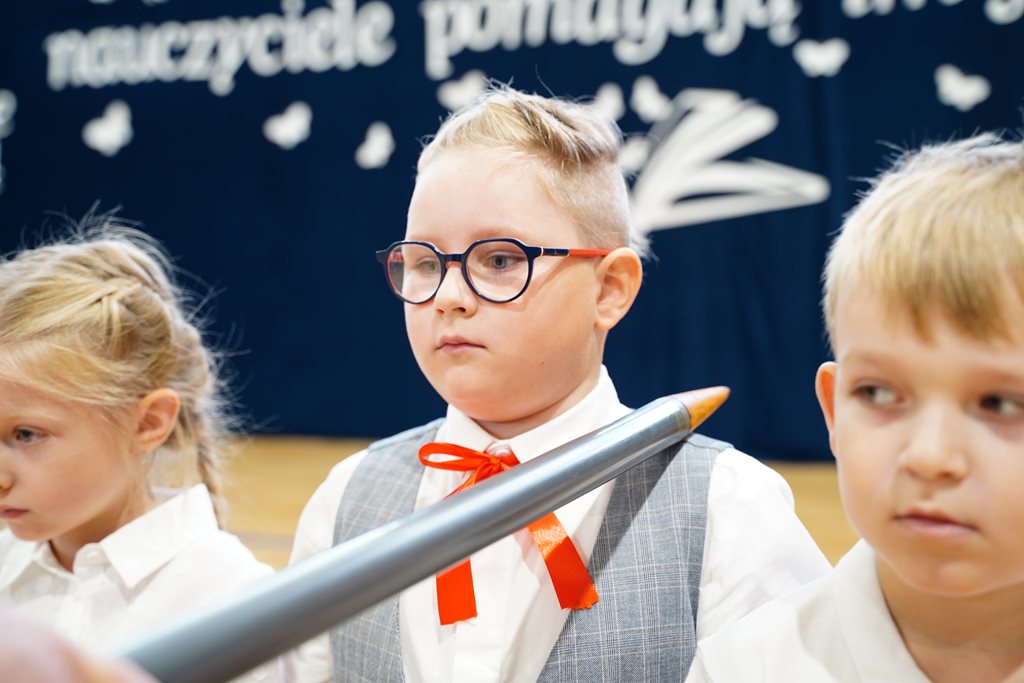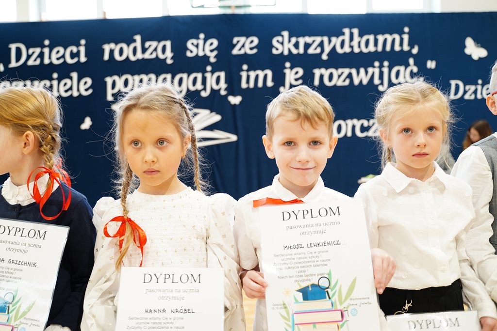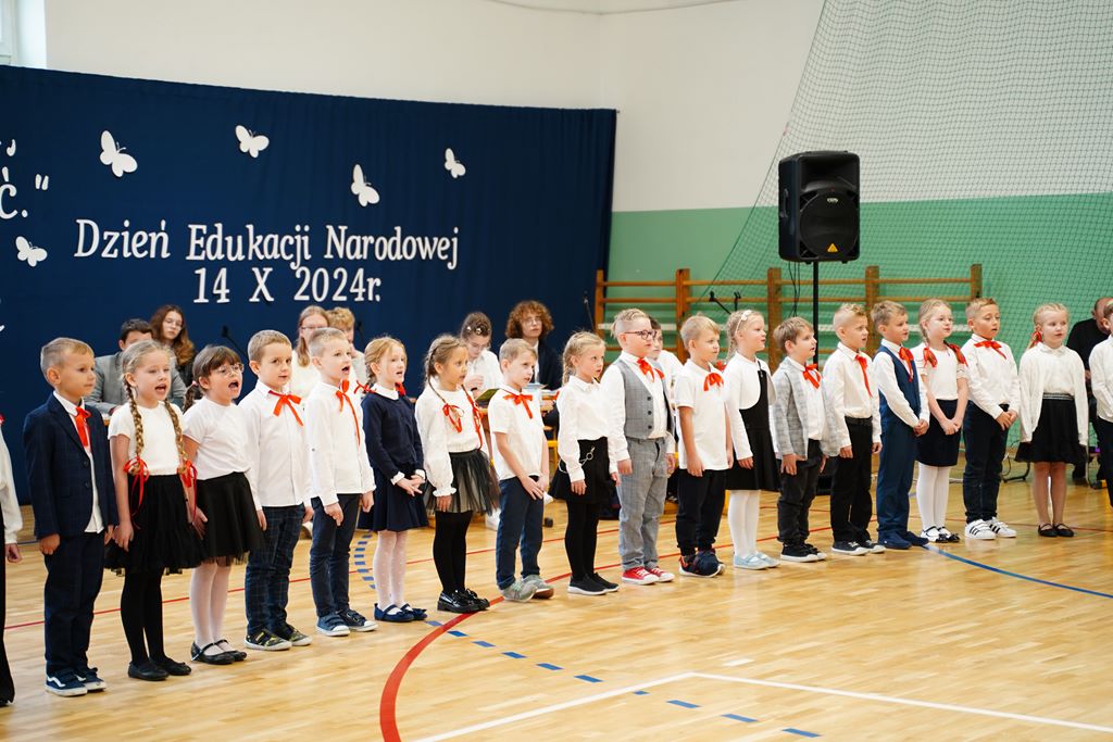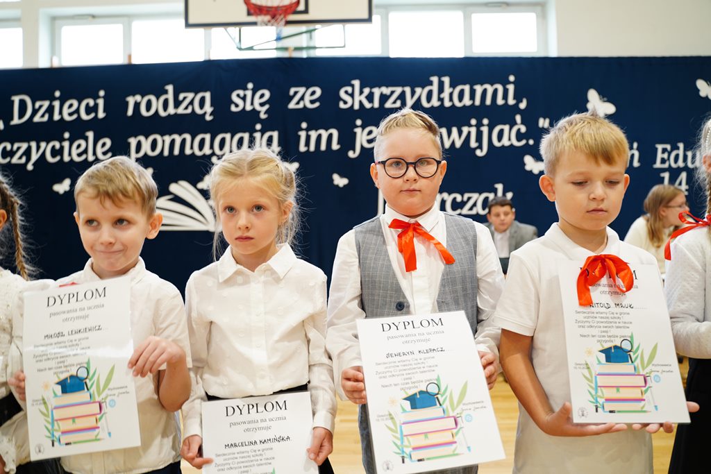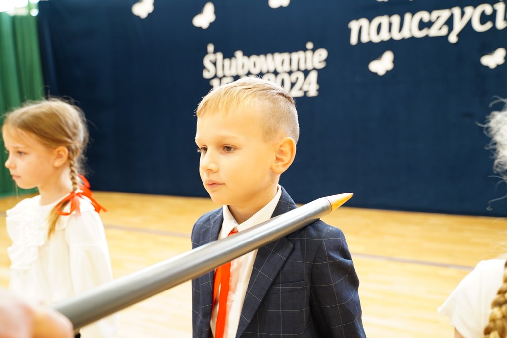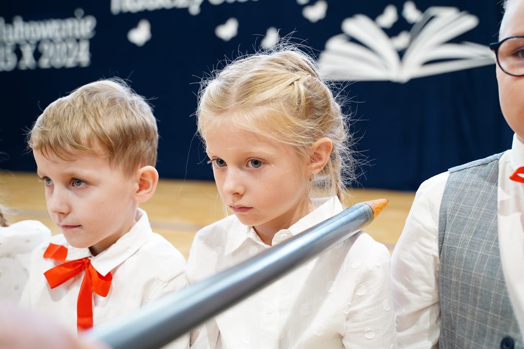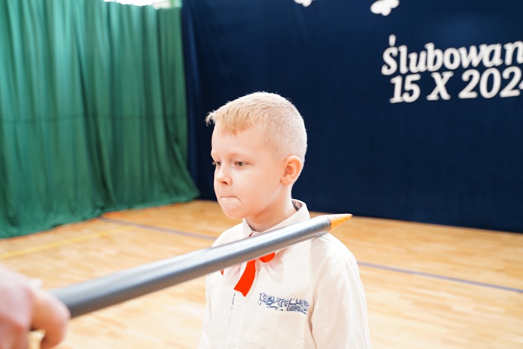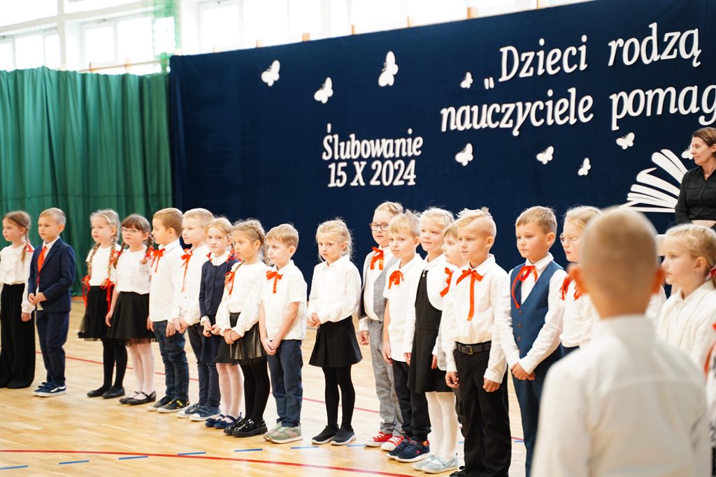 W dniu 15 października 2024 r. w naszej szkole odbyła się uroczystość ślubowania uczniów klas pierwszych połączona z uroczystym apelem z okazji Dnia Edukacji Narodowej. W wydarzeniu uczestniczyli uczniowie, nauczyciele oraz rodzice. Uroczystość rozpoczęła się od wprowadzenia sztandaru szkoły i odśpiewania hymnu państwowego. Nowi uczniowie złożyli uroczyste ślubowanie, w którym zobowiązali się być pilnymi i sumiennymi uczniami, szanować swoich nauczycieli oraz godnie reprezentować szkołę. Po ślubowaniu nastąpił moment pasowania na uczniów, które przeprowadził pan dyrektor, dotykając symbolicznie każde dziecko dużym ołówkiem. Część artystyczna była niezwykle barwna i radosna. Dzieci śpiewały piosenki, recytowały wiersze oraz zaprezentowały taniec, który wzbudził entuzjazm wśród zgromadzonej publiczności. Wychowawcy wręczyli uczniom pamiątkowe dyplomy.