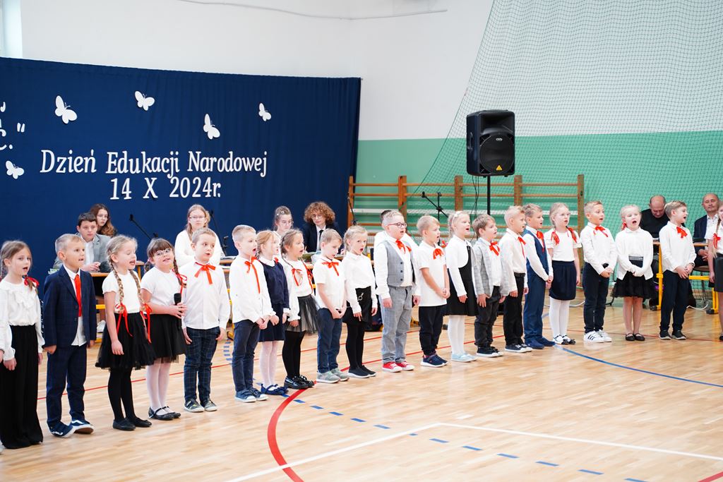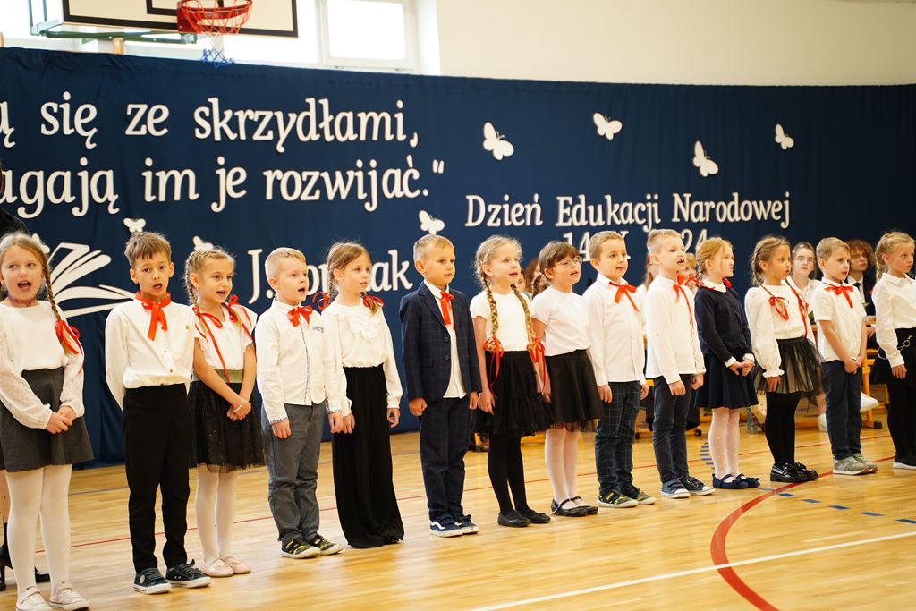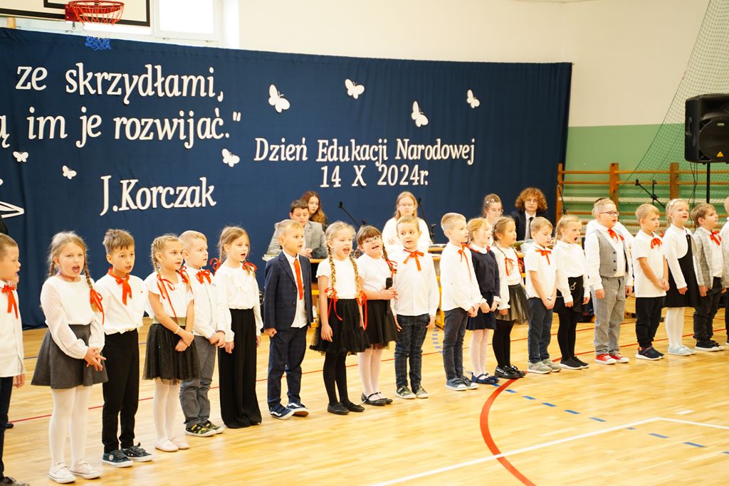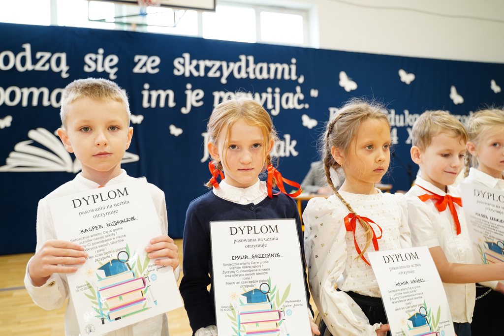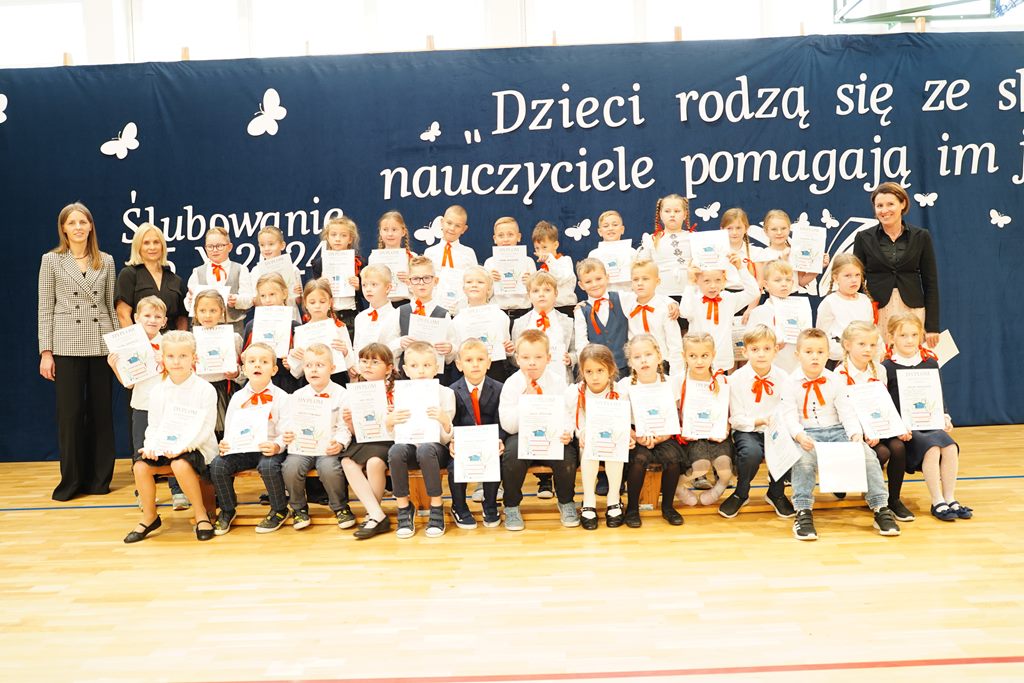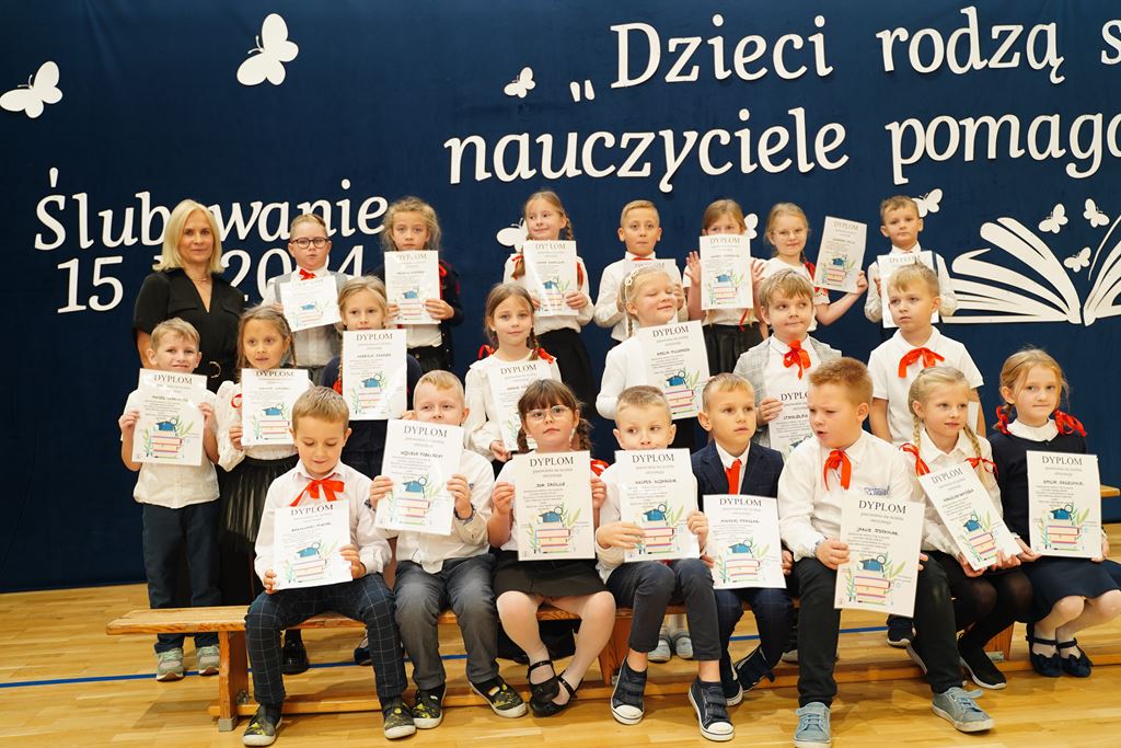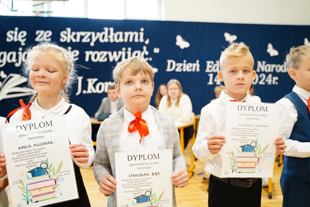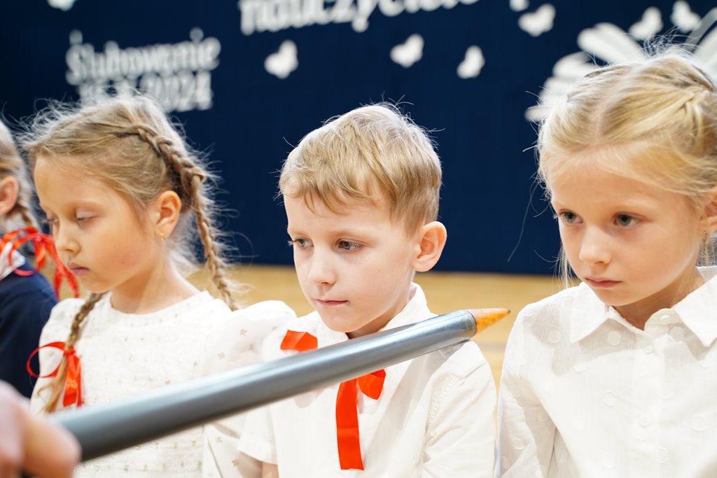 W dniu 15 października 2024 r. w naszej szkole odbyła się uroczystość ślubowania uczniów klas pierwszych połączona z uroczystym apelem z okazji Dnia Edukacji Narodowej. W wydarzeniu uczestniczyli uczniowie, nauczyciele oraz rodzice. Uroczystość rozpoczęła się od wprowadzenia sztandaru szkoły i odśpiewania hymnu państwowego. Nowi uczniowie złożyli uroczyste ślubowanie, w którym zobowiązali się być pilnymi i sumiennymi uczniami, szanować swoich nauczycieli oraz godnie reprezentować szkołę. Po ślubowaniu nastąpił moment pasowania na uczniów, które przeprowadził pan dyrektor, dotykając symbolicznie każde dziecko dużym ołówkiem. Część artystyczna była niezwykle barwna i radosna. Dzieci śpiewały piosenki, recytowały wiersze oraz zaprezentowały taniec, który wzbudził entuzjazm wśród zgromadzonej publiczności. Wychowawcy wręczyli uczniom pamiątkowe dyplomy.