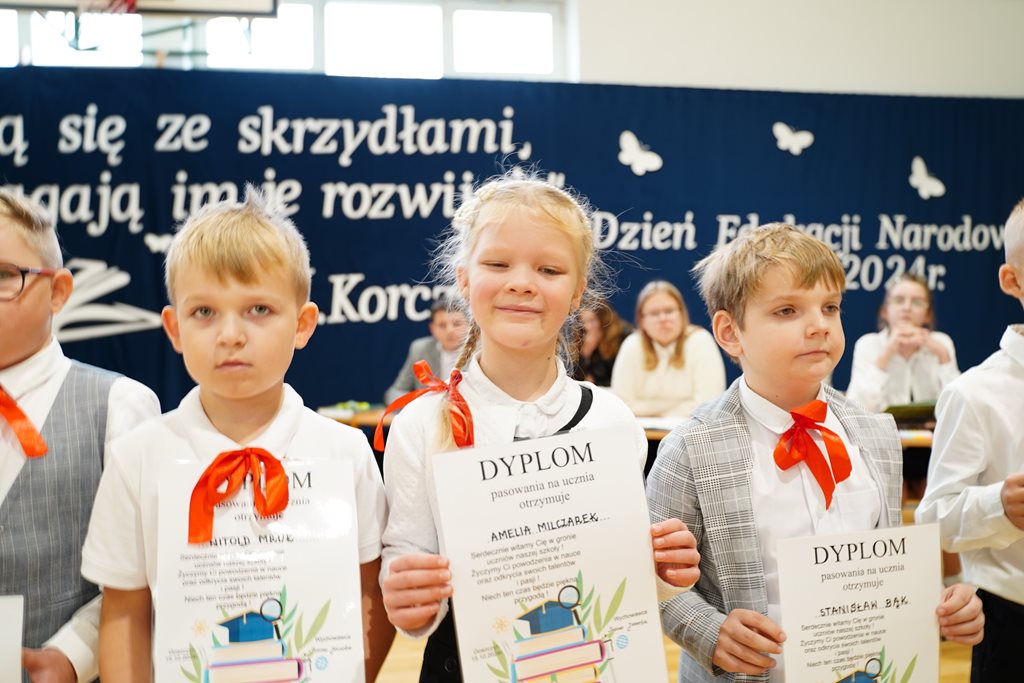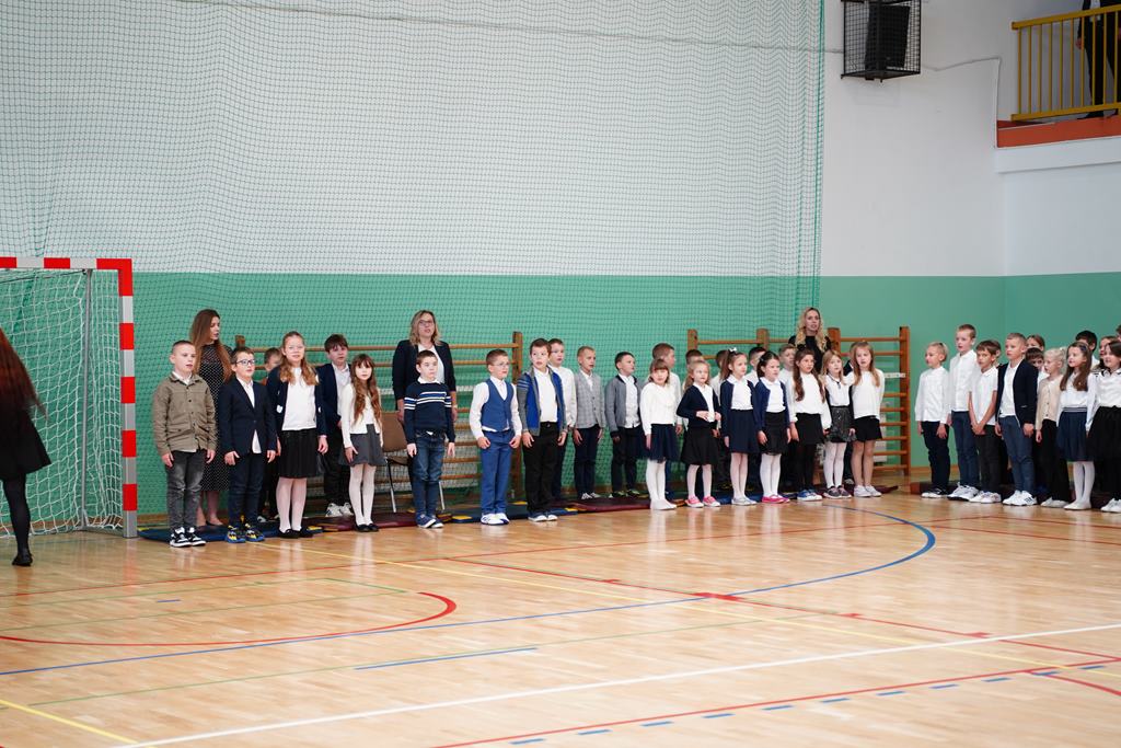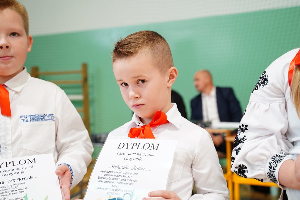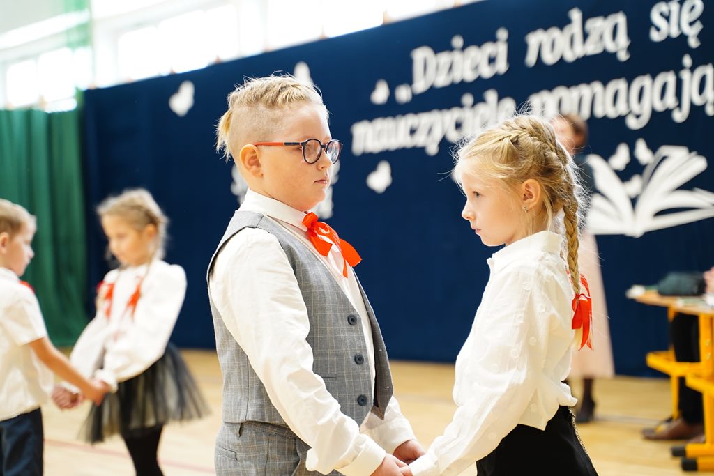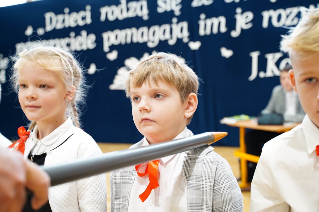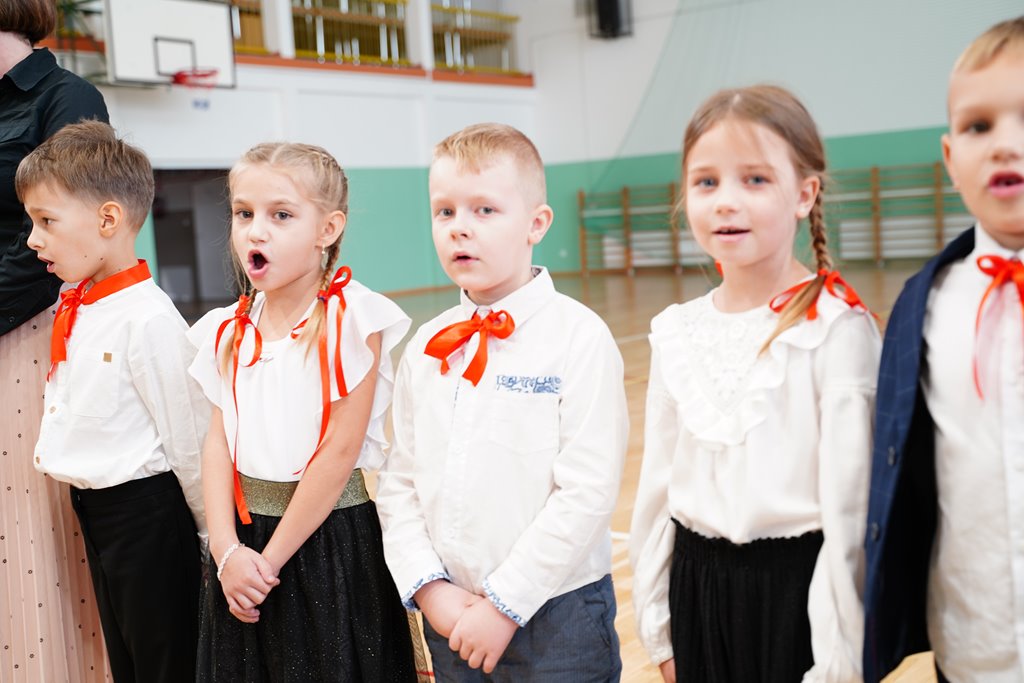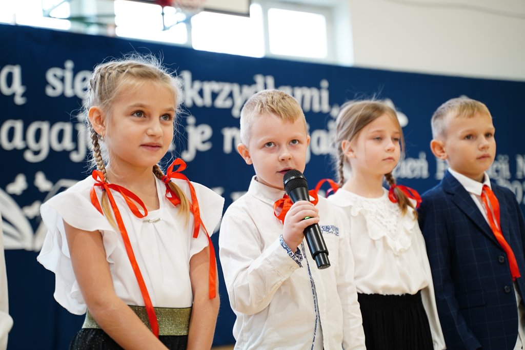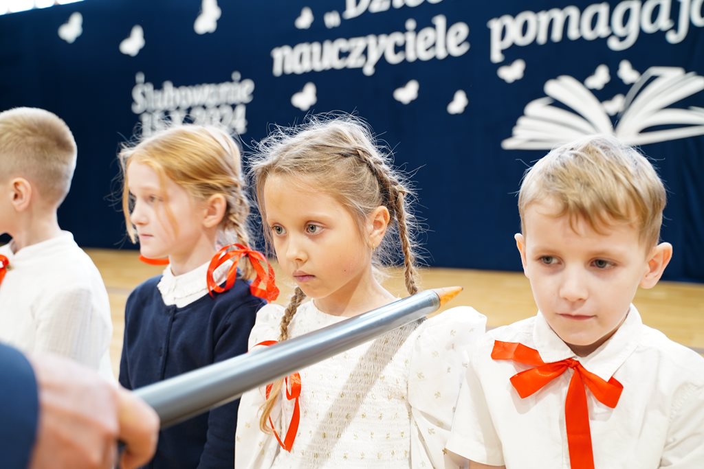 W dniu 15 października 2024 r. w naszej szkole odbyła się uroczystość ślubowania uczniów klas pierwszych połączona z uroczystym apelem z okazji Dnia Edukacji Narodowej. W wydarzeniu uczestniczyli uczniowie, nauczyciele oraz rodzice. Uroczystość rozpoczęła się od wprowadzenia sztandaru szkoły i odśpiewania hymnu państwowego. Nowi uczniowie złożyli uroczyste ślubowanie, w którym zobowiązali się być pilnymi i sumiennymi uczniami, szanować swoich nauczycieli oraz godnie reprezentować szkołę. Po ślubowaniu nastąpił moment pasowania na uczniów, które przeprowadził pan dyrektor, dotykając symbolicznie każde dziecko dużym ołówkiem. Część artystyczna była niezwykle barwna i radosna. Dzieci śpiewały piosenki, recytowały wiersze oraz zaprezentowały taniec, który wzbudził entuzjazm wśród zgromadzonej publiczności. Wychowawcy wręczyli uczniom pamiątkowe dyplomy.