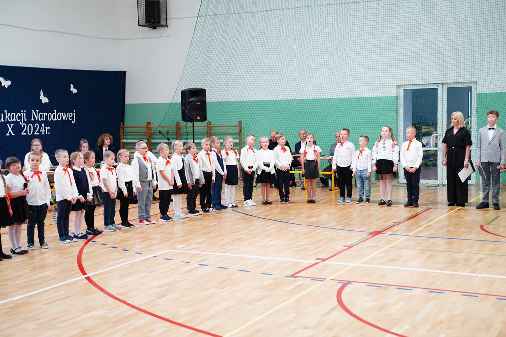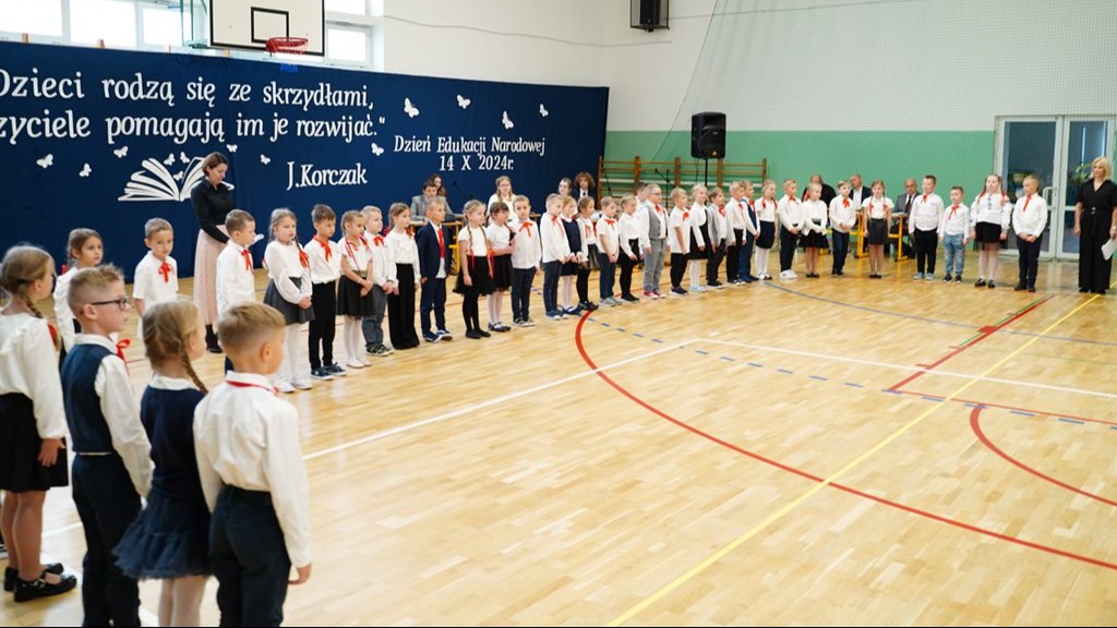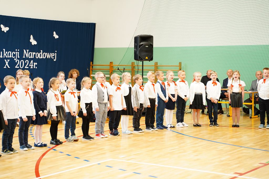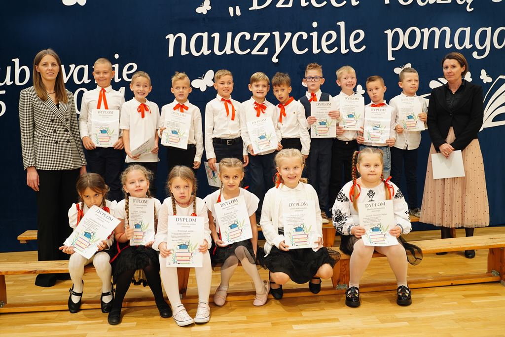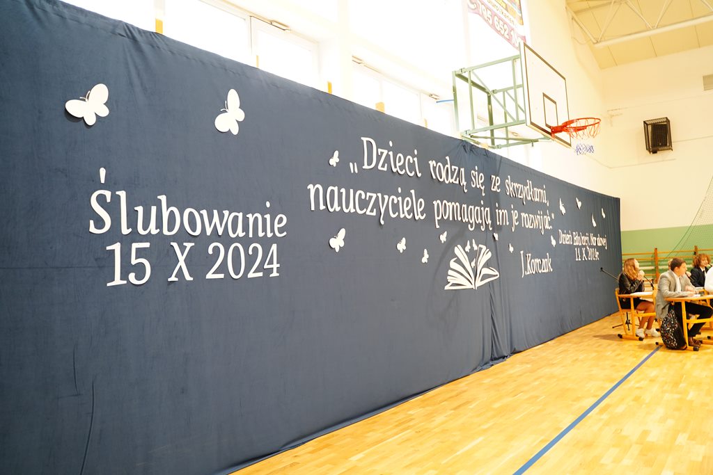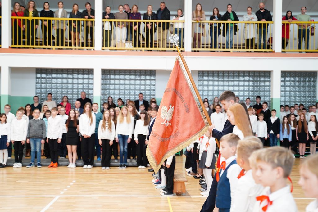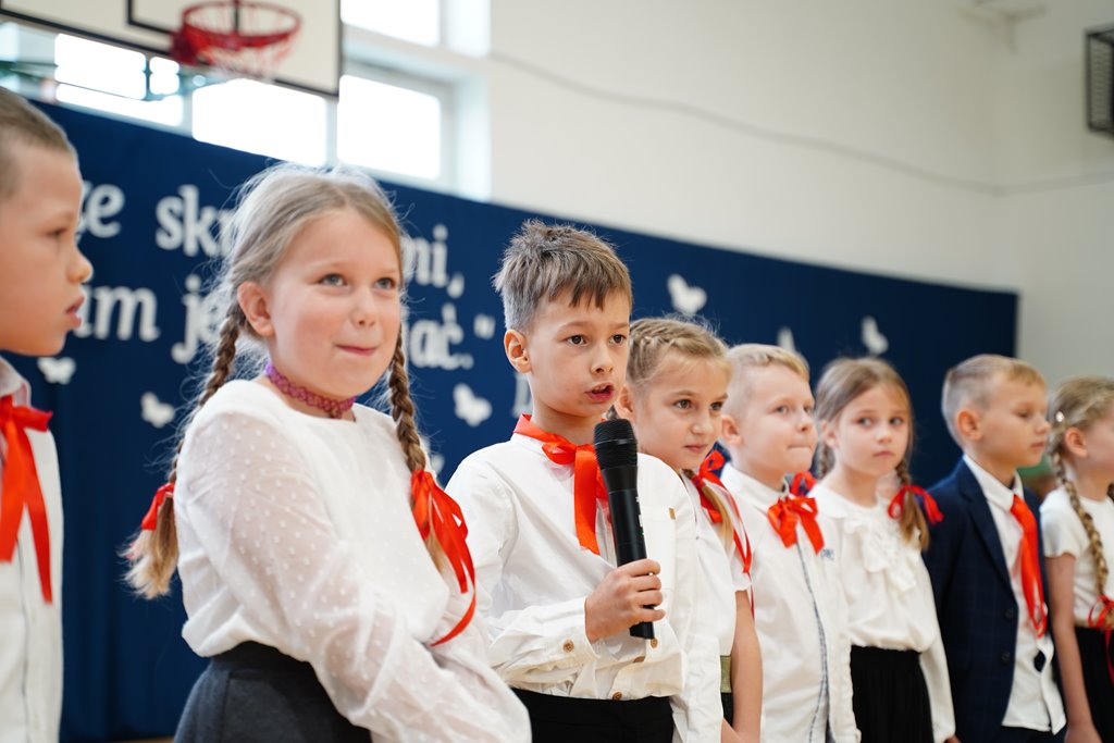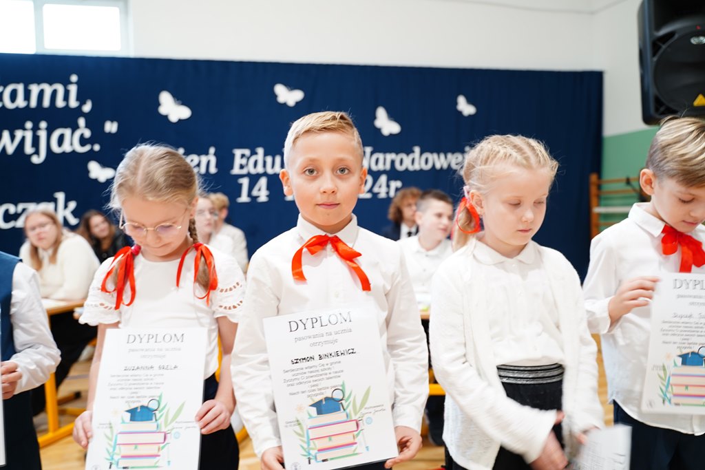 W dniu 15 października 2024 r. w naszej szkole odbyła się uroczystość ślubowania uczniów klas pierwszych połączona z uroczystym apelem z okazji Dnia Edukacji Narodowej. W wydarzeniu uczestniczyli uczniowie, nauczyciele oraz rodzice. Uroczystość rozpoczęła się od wprowadzenia sztandaru szkoły i odśpiewania hymnu państwowego. Nowi uczniowie złożyli uroczyste ślubowanie, w którym zobowiązali się być pilnymi i sumiennymi uczniami, szanować swoich nauczycieli oraz godnie reprezentować szkołę. Po ślubowaniu nastąpił moment pasowania na uczniów, które przeprowadził pan dyrektor, dotykając symbolicznie każde dziecko dużym ołówkiem. Część artystyczna była niezwykle barwna i radosna. Dzieci śpiewały piosenki, recytowały wiersze oraz zaprezentowały taniec, który wzbudził entuzjazm wśród zgromadzonej publiczności. Wychowawcy wręczyli uczniom pamiątkowe dyplomy.