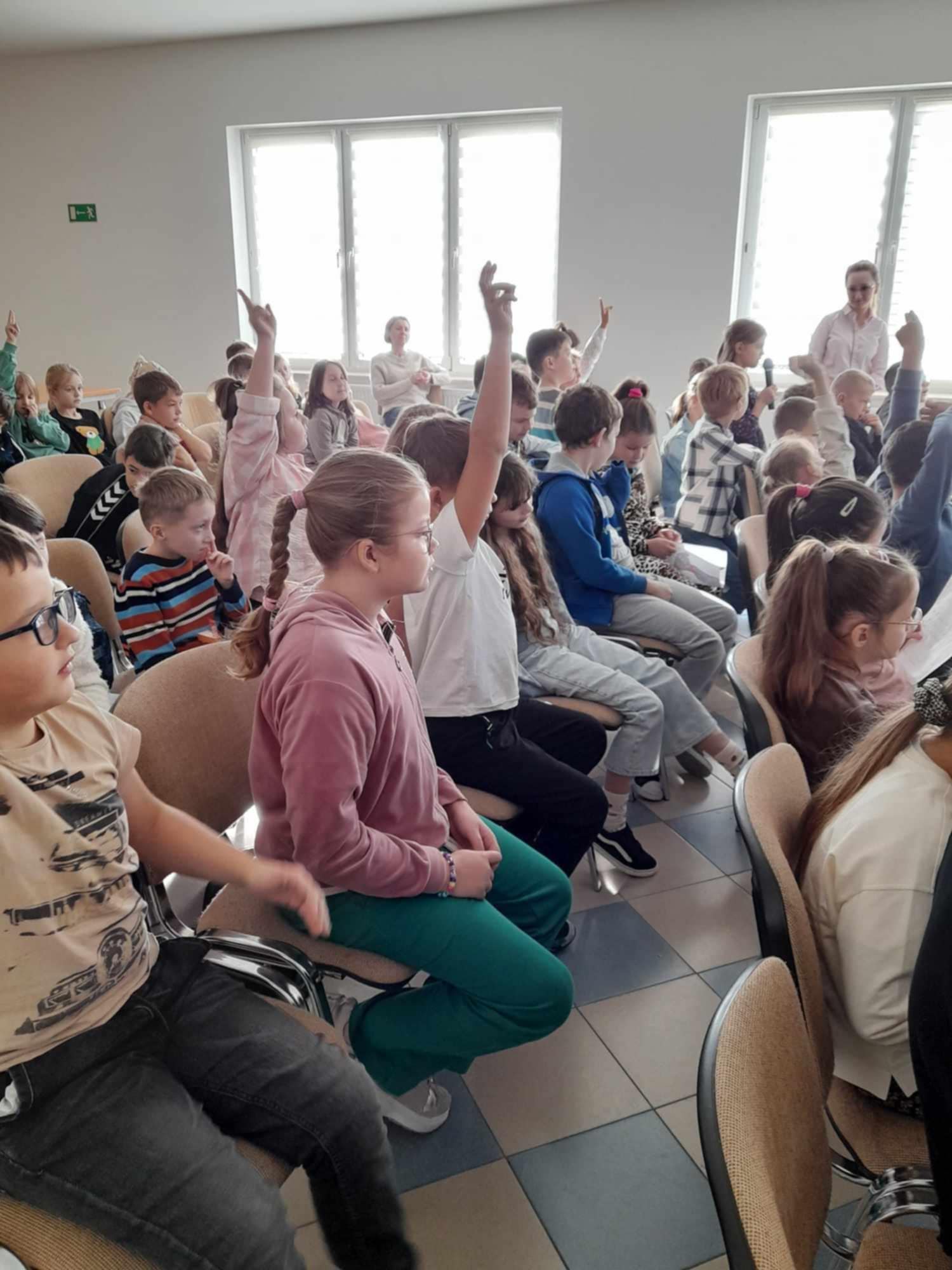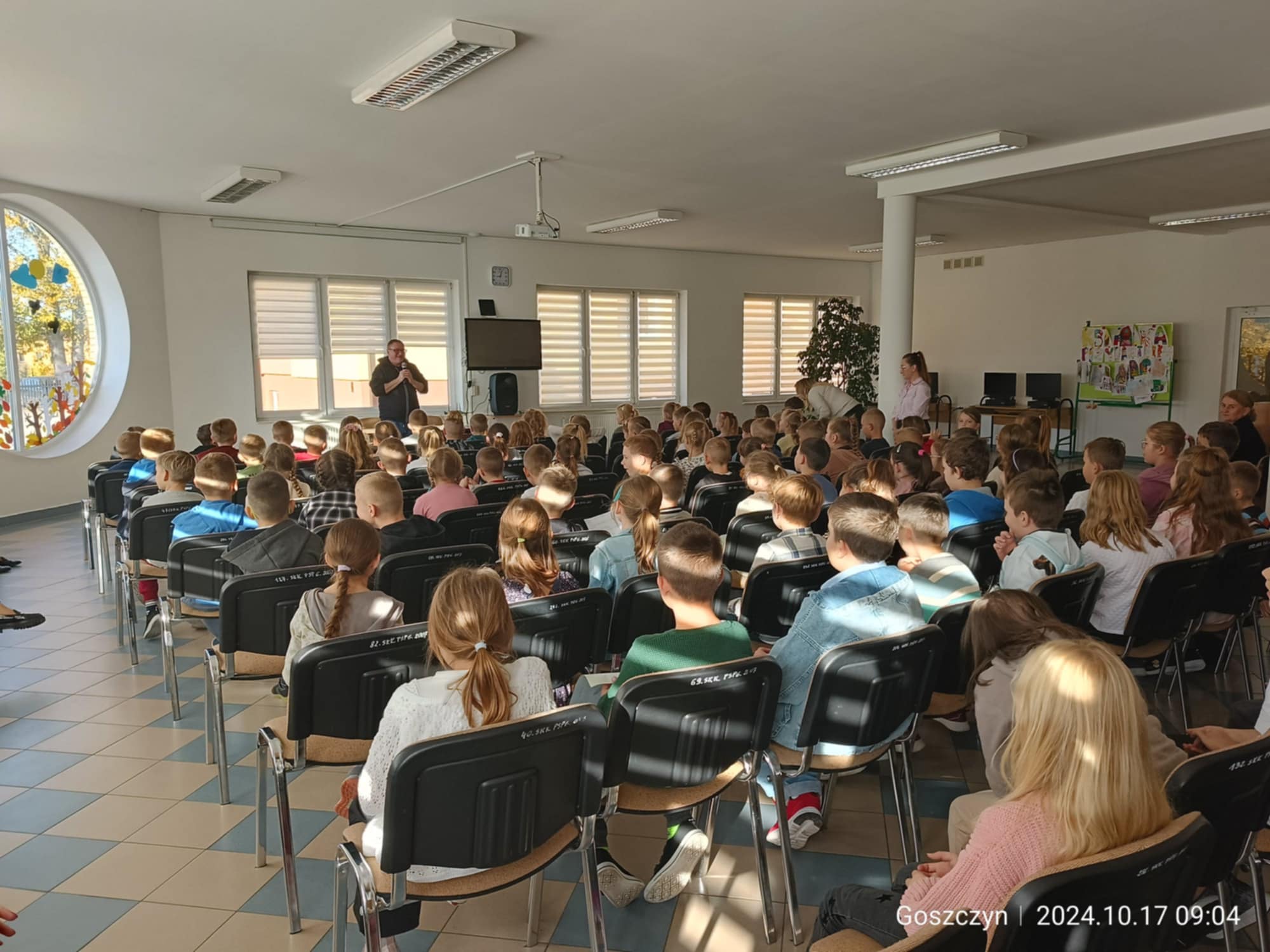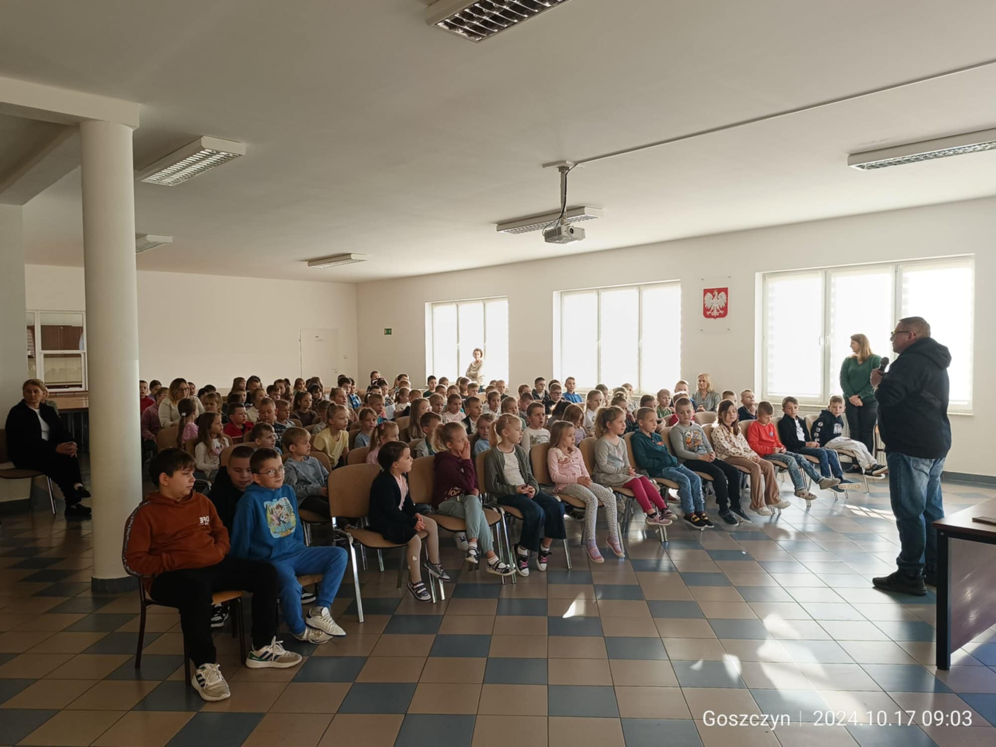 17 października 2024 roku w naszej szkole odbyło się spotkanie autorskie z pisarzem książek dla dzieci i młodzieży – panem Marcinem Pałaszem. W sali konferencyjnej zebrali się wszyscy uczniowie klas 0-3. Zarówno młodsi, jak i starsi brali czynny udział w spotkaniu – w skupieniu słuchali historii opowiadanych przez pana Marcina, zadawali nurtujące ich pytania, lecz przede wszystkim śmiali się w głos, bowiem nasz gość okazał się świetnym gawędziarzem.