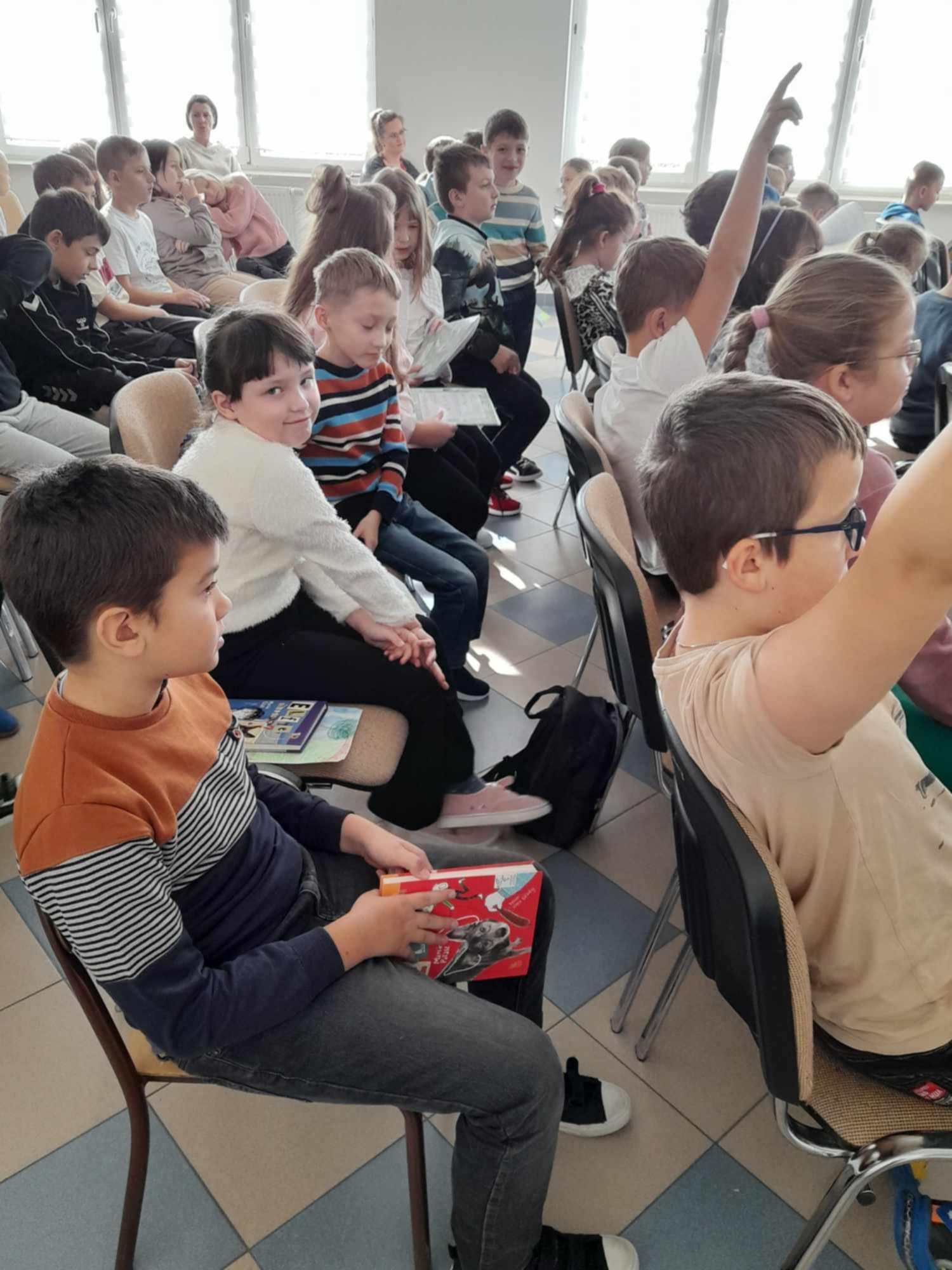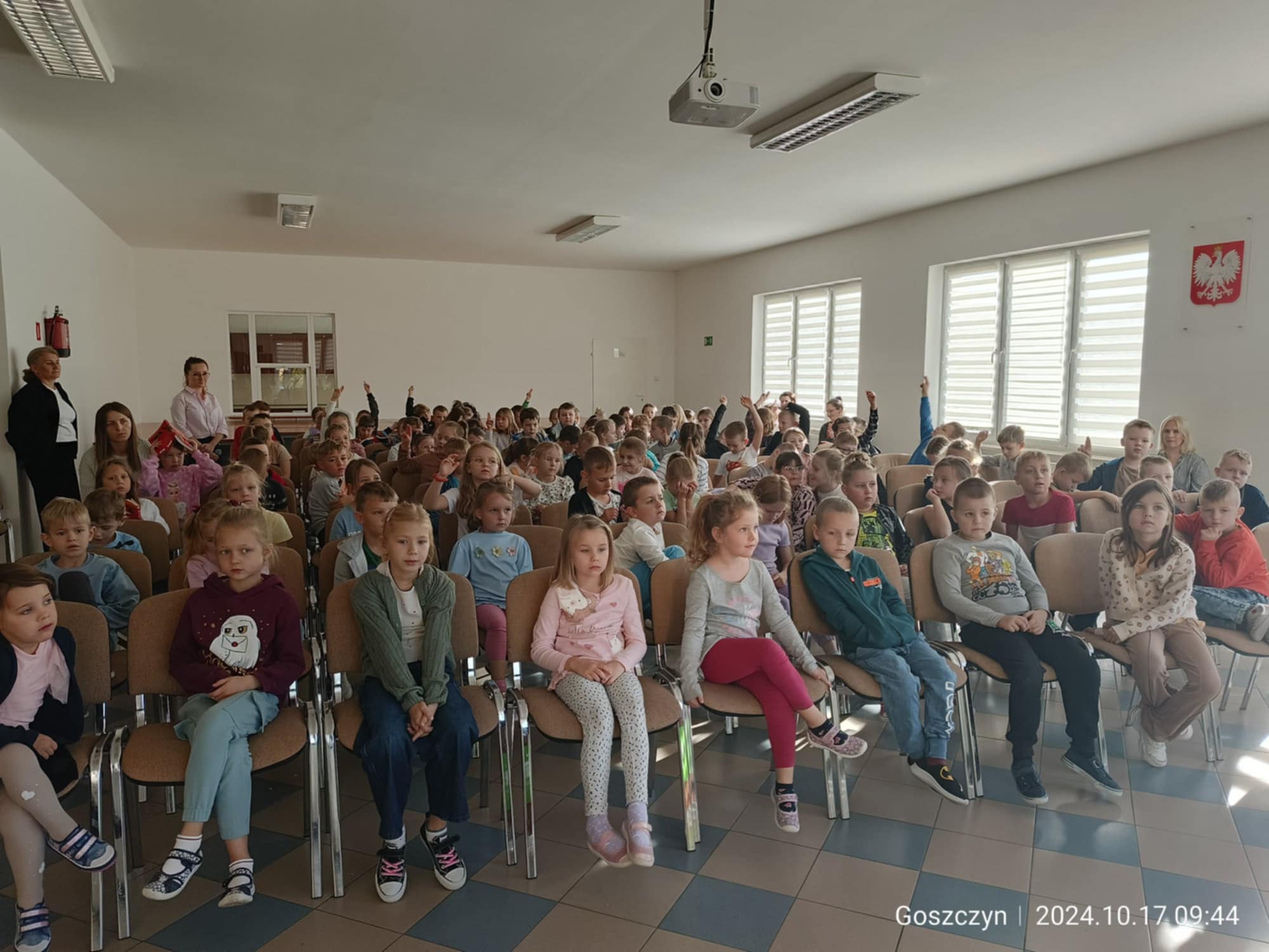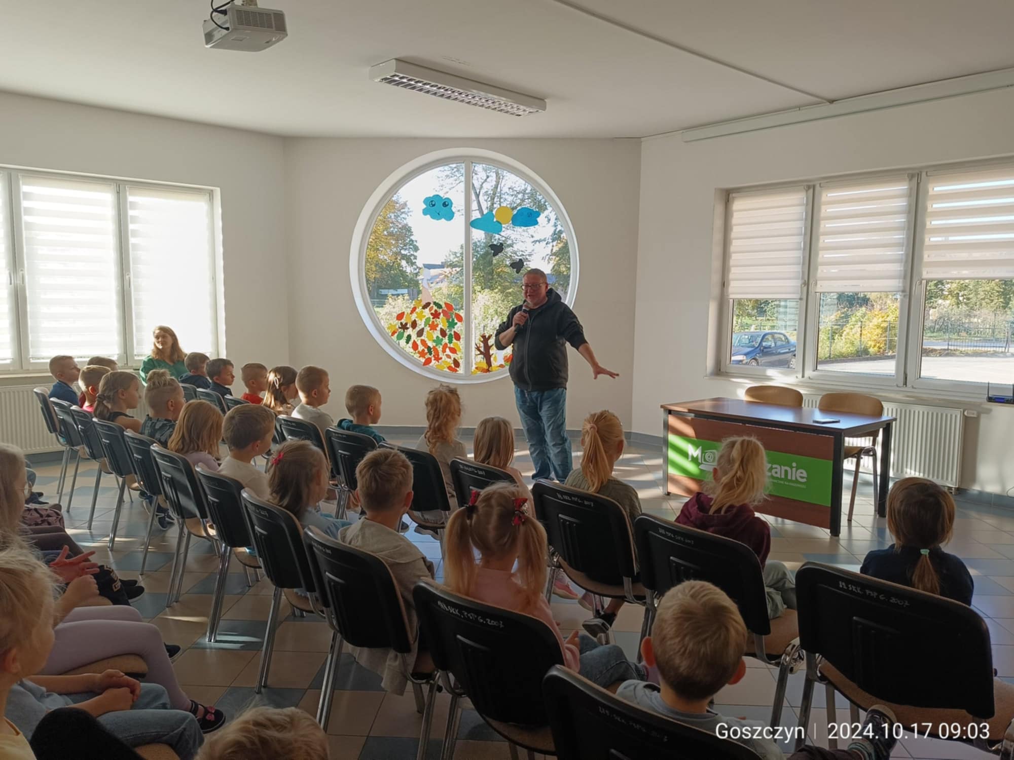 17 października 2024 roku w naszej szkole odbyło się spotkanie autorskie z pisarzem książek dla dzieci i młodzieży – panem Marcinem Pałaszem. W sali konferencyjnej zebrali się wszyscy uczniowie klas 0-3. Zarówno młodsi, jak i starsi brali czynny udział w spotkaniu – w skupieniu słuchali historii opowiadanych przez pana Marcina, zadawali nurtujące ich pytania, lecz przede wszystkim śmiali się w głos, bowiem nasz gość okazał się świetnym gawędziarzem.