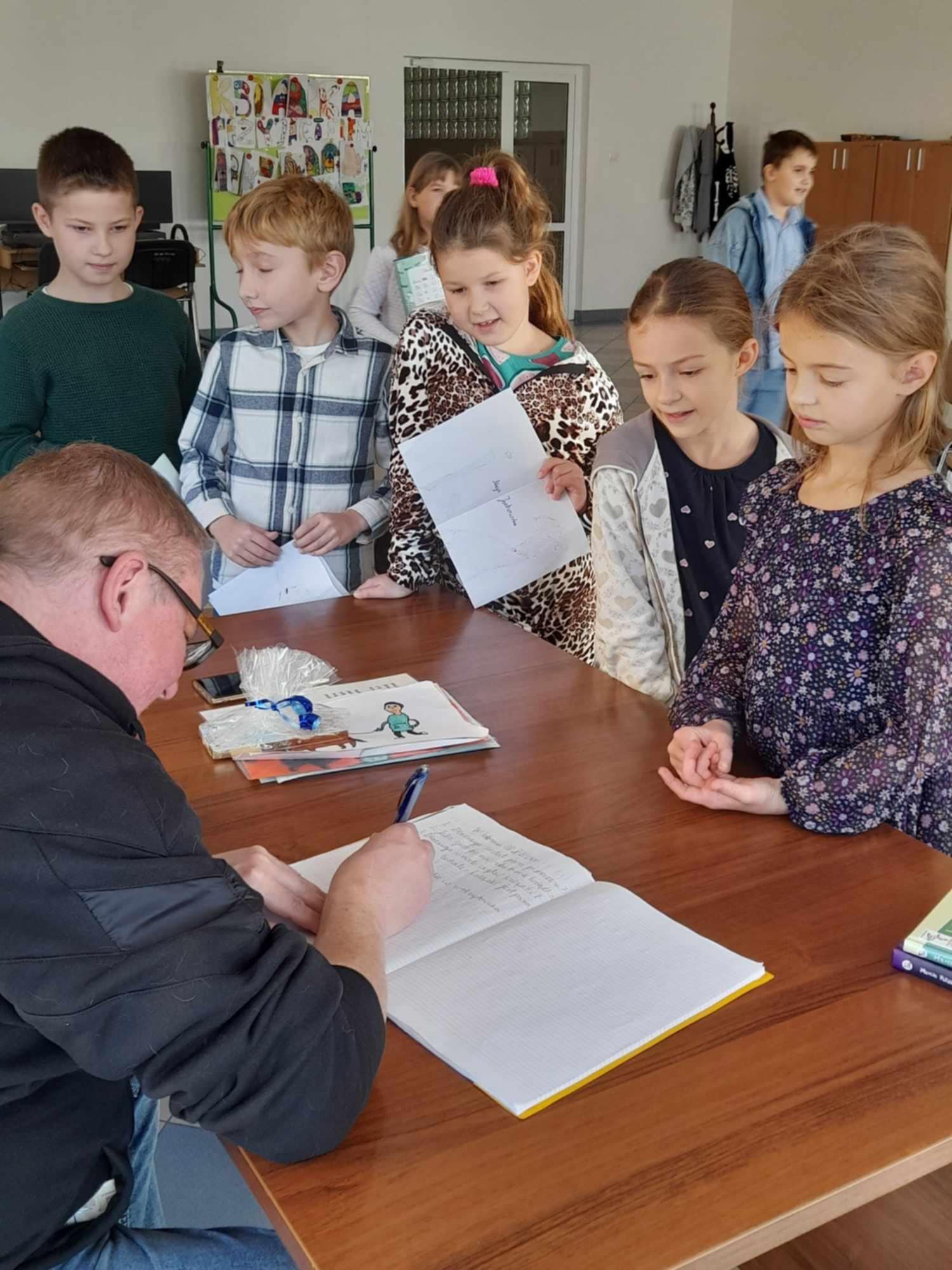 Pan Marcin opowiadał o wydanych książkach, o swoich pasjach, o tym, jak wygląda praca pisarza na co dzień i oczywiście o przyjacielu Elfie – głównym bohaterze jego utworów; podpisał także książki zakupione przez uczniów.