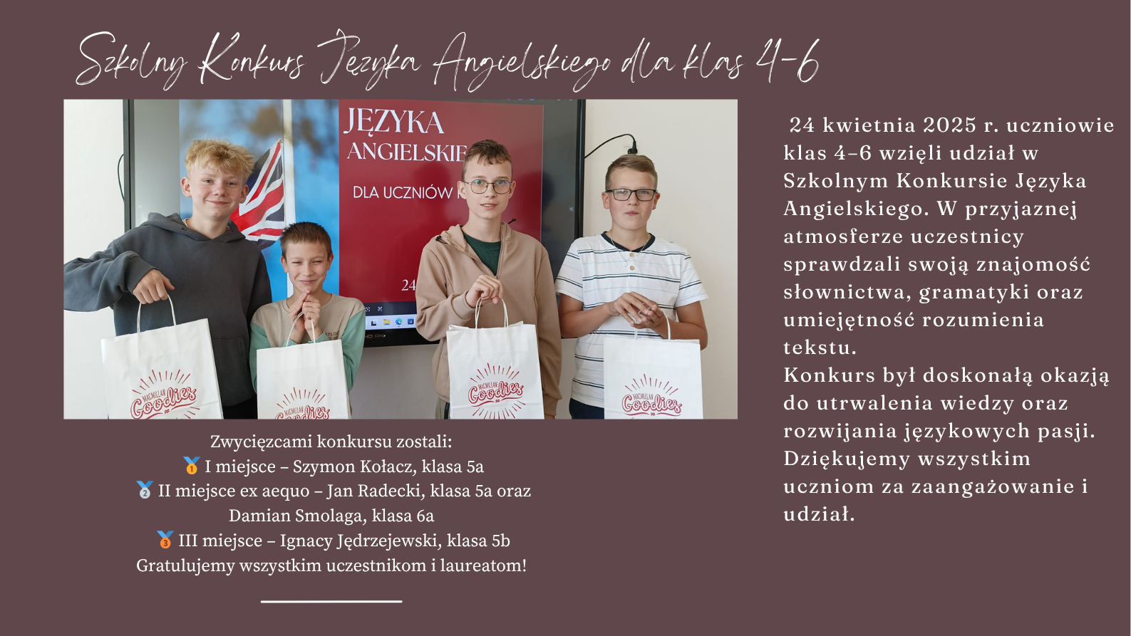 W kwietniu 2025 r. uczniowie klas 4–6 wzięli udział w Szkolnym Konkursie Języka Angielskiego. Uczestnicy mierzyli się z pytaniami dotyczącymi słownictwa, gramatyki oraz wiedzy o krajach anglojęzycznych. Konkurs przebiegał w radosnej i pełnej zaangażowania atmosferze.