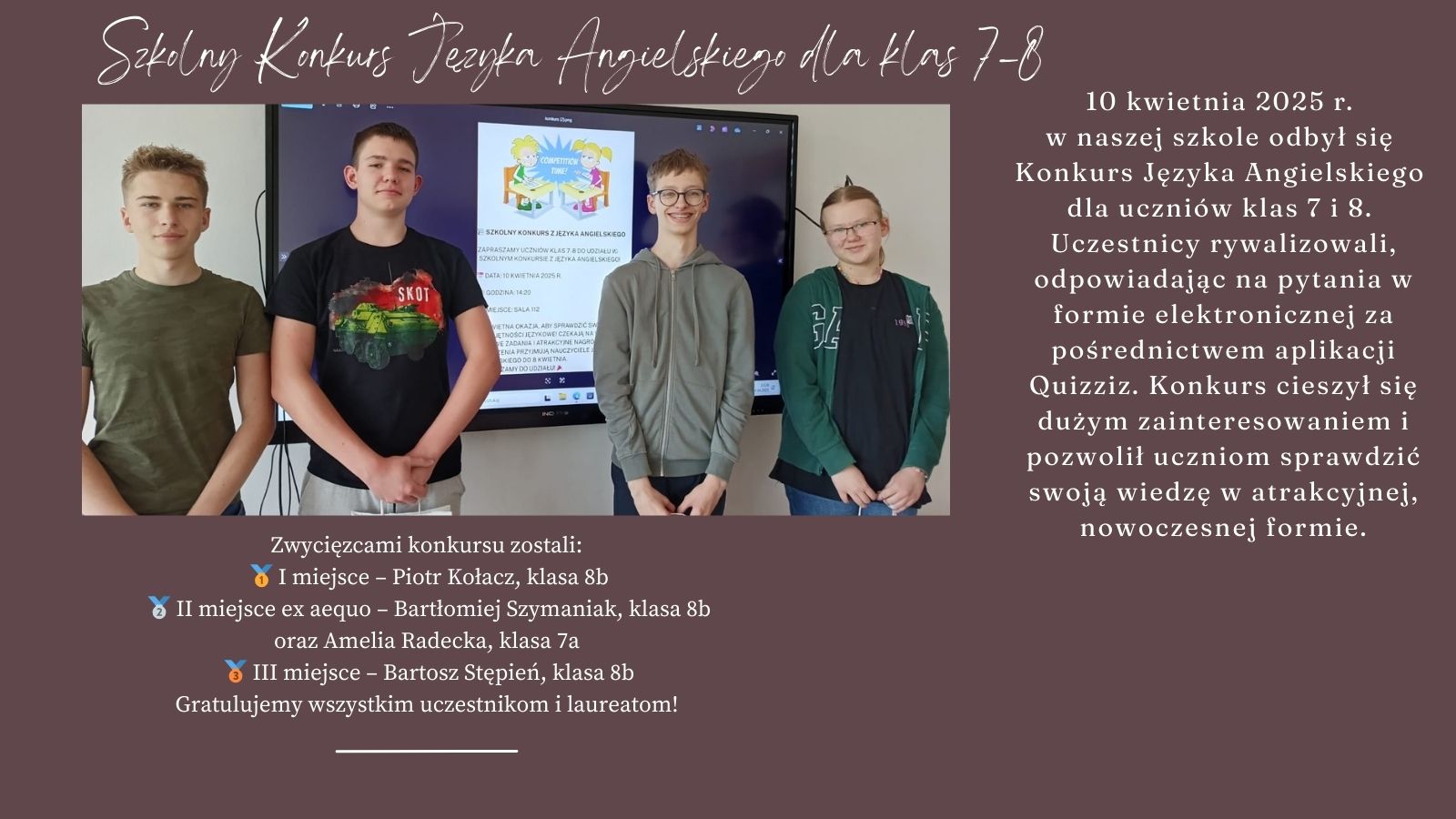 10 kwietnia 2025 r. w naszej szkole odbył się Konkurs Języka Angielskiego dla uczniów klas 7 i 8. Uczestnicy rywalizowali, odpowiadając na pytania w formie elektronicznej za pośrednictwem aplikacji Quizziz. Konkurs cieszył się dużym zainteresowaniem i pozwolił uczniom sprawdzić swoją wiedzę w atrakcyjnej, nowoczesnej formie.