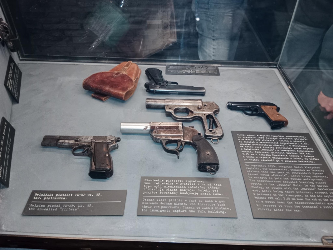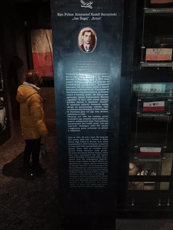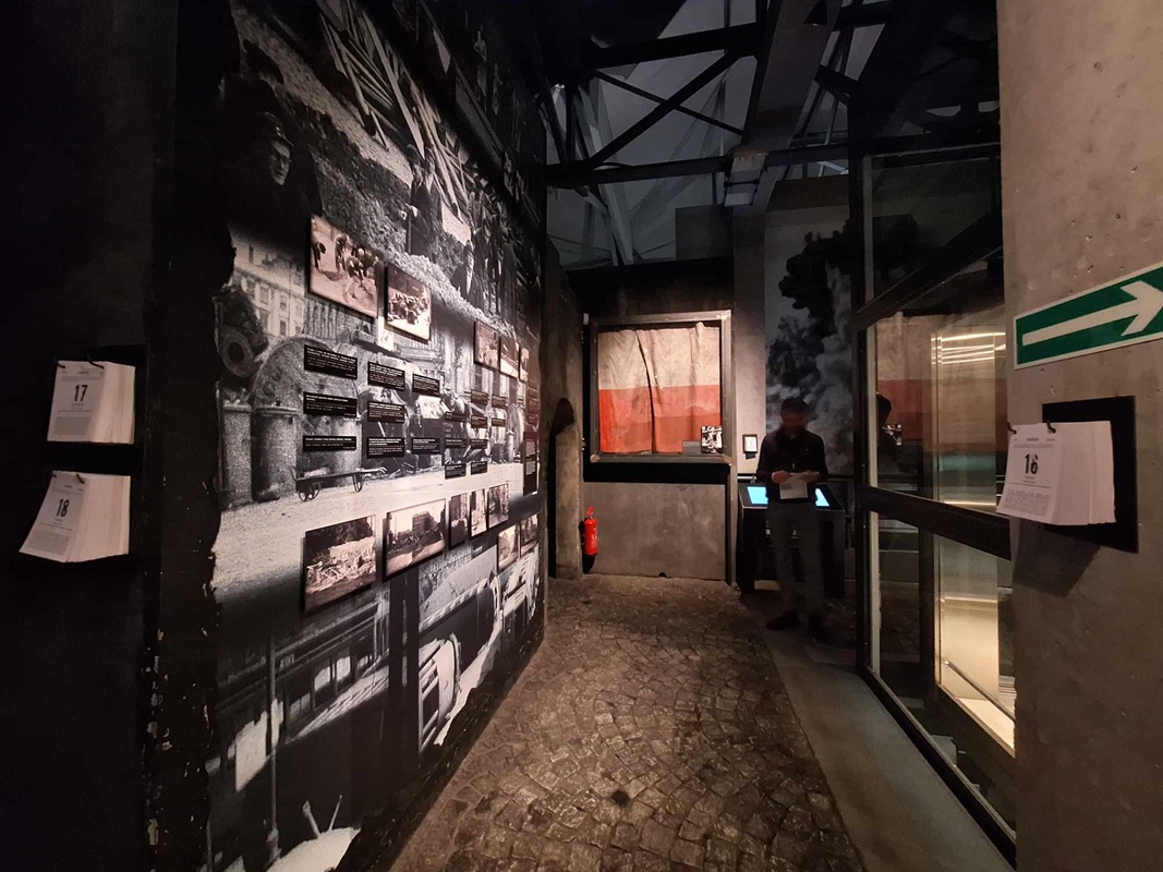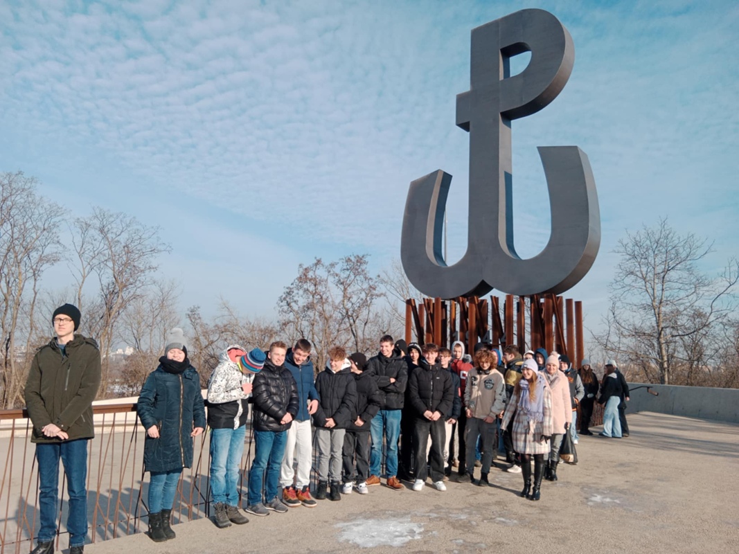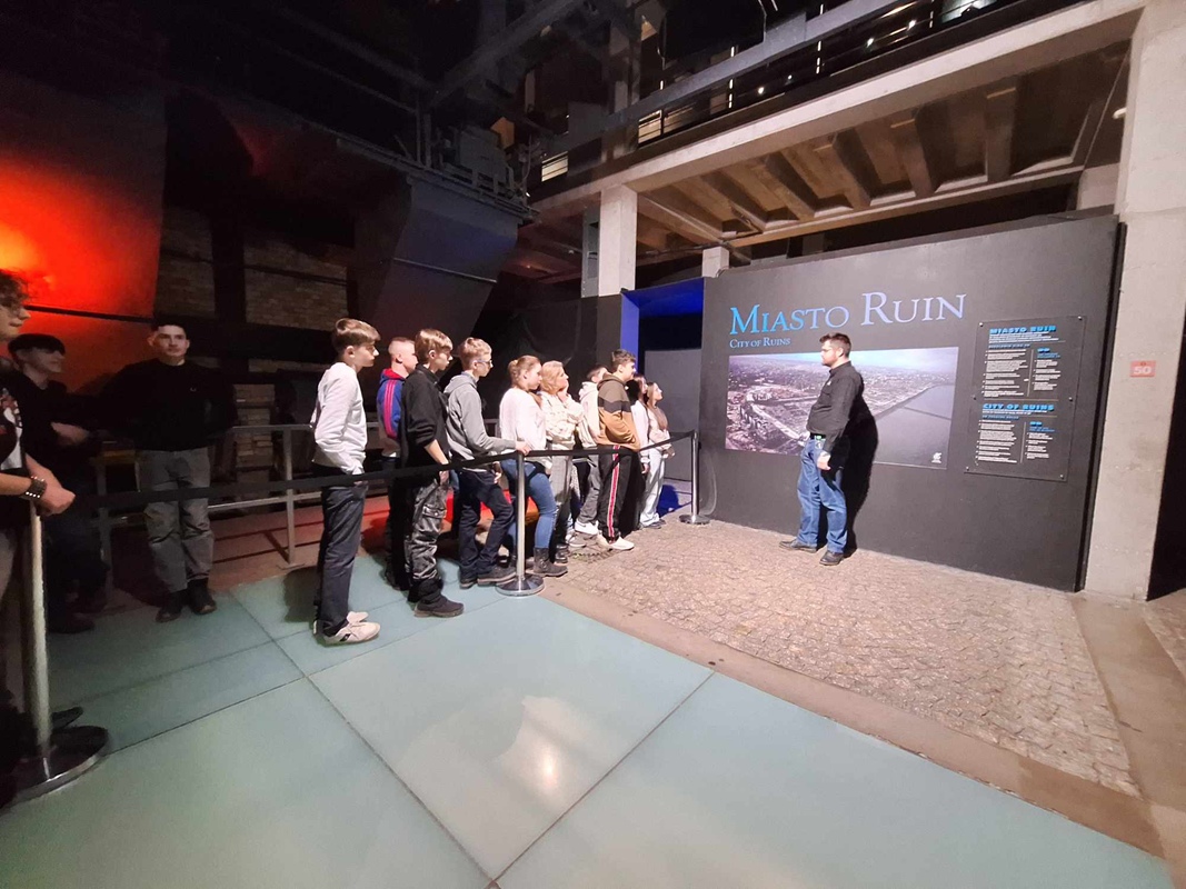 Ostatnim punktem wycieczki była wizyta w Muzeum Powstania Warszawskiego. Uczniowie zwiedzali wystawy muzealne pod opieką przewodników, którzy w bardzo szczegółowy sposób opowiedzieli nam o genezie powstania, jego przebiegu oraz straszliwych skutkach. Widzieliśmy rodzaje broni, jakich używali powstańcy, mundury, które nosili, ale także przedmioty codziennego użytku. Nowoczesne elementy, takie jak: monitory, komputery, filmy czy zasoby audio, których mogliśmy wysłuchać, robiły ogromne wrażenie na odbiorcach. W muzeum przez cały czas wybrzmiewa głośno odgłos bijącego serca (symbolizującego życie mieszkańców Warszawy), ale także odgłosy walk, strzałów, wybuchów. Centralnym punktem muzeum jest replika samolotu „Liberator B-24J” (w skali 1:1). Mogliśmy przejść się kanałem, co miało nam uzmysłowić, w jakich warunkach uciekali warszawiacy w czasie walk. Na koniec obejrzeliśmy krótki film 3D pt. „Miasto Ruin”, na którym ukazana była zniszczona Warszawa z 1945 roku. Na zewnątrz widzieliśmy Mur Pamięci, z wyrytymi nazwiskami blisko jedenastu tysięcy poległych Powstańców, a także samochód pancerny „Kubuś”, którego zadaniem była m.in. osłona wycofujących się żołnierzy, dziś ważny symbol Powstania Warszawskiego.