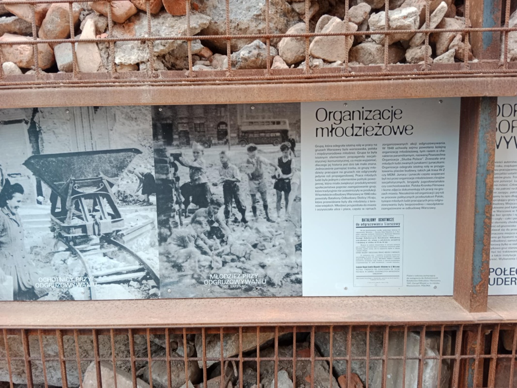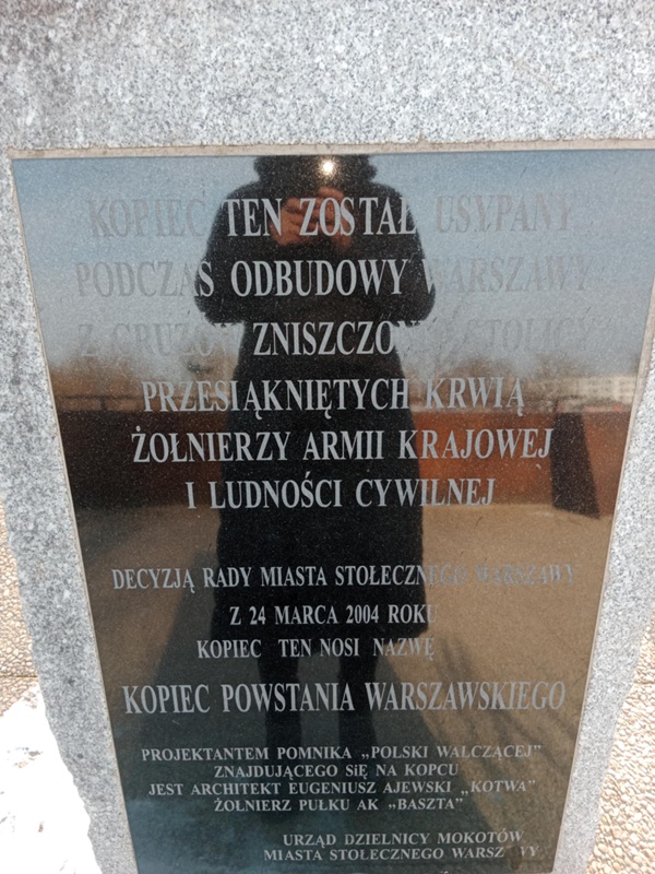 Pierwszym punktem wyjazdu był Kopiec Powstania Warszawskiego – wzniesienie znajdujące się na Czerniakowie, w całości stworzone z gruzów powojennej Warszawy. Wkoło kopca znajduje się park Akcji „Burza”. Przed schodami są usytuowane ogromne „kosze” z warszawskimi gruzami, w sposób symboliczny ukazujące wymiar zniszczenia stolicy w czasie wojny. Na samej górze został postawiony pomnik Polski Walczącej, przy którym są składane kwiaty, zapalane znicze, a także rokrocznie 1 sierpnia odbywają się tam obchody patriotyczne związane z wybuchem Powstania Warszawskiego. O genezie kopca opowiadał nam szczegółowo uczeń klasy 8b, Łukasz Kępka.