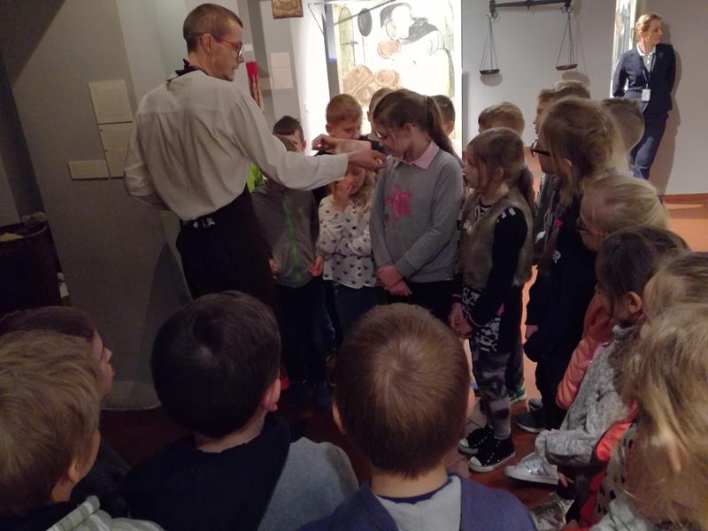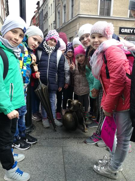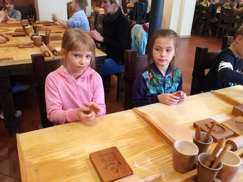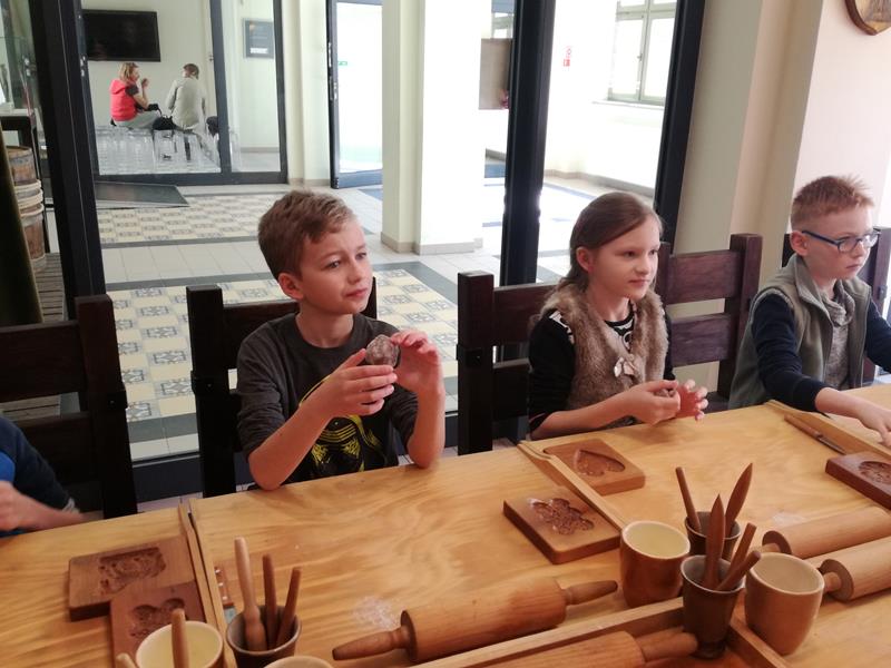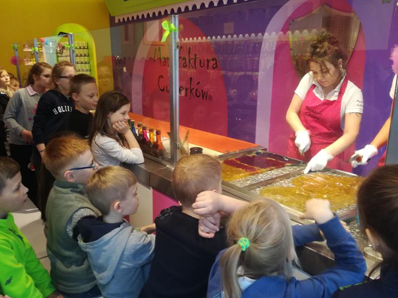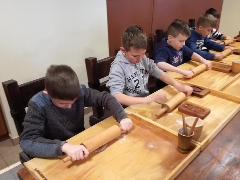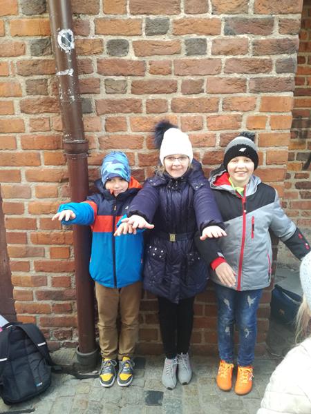 Chwila organizacji, pożegnanie z rodzicami i ruszyliśmy. Droga minęła nam bardzo miło i przyjemnie, po czym wkrótce byliśmy na miejscu. Pierwszym punktem programu była wizyta w Planetarium im. W. Dziewulskiego. Zaprezentowany tu został seans astronomiczny z zakresu wiedzy astronomicznej. Kolejnym punktem programu było zwiedzanie Starego Miasta z najlepszym przewodnikiem Torunia p. Anną Kozłowską. To właśnie ona opowiedziała nam o najcenniejszych zabytkach tego miasta. Dzięki niej zobaczyliśmy: mury miejskie, Krzywą Wieżę, Bramę Klasztorną , Katedrę św. Janów, Rynek Staromiejski, Ratusz, Dwór Artusa, pomnik M. Kopernika przy którym zrobiliśmy sobie grupowe zdjęcie, pomnik Filusia, fontannę z Flisakiem oraz piernikową aleję gwiazd. Oprócz tego p. Ania opowiedziała nam mnóstwo legend i ciekawych historii. Kolejnym miejscem, które odwiedziliśmy była Manufakturze Cukierków. Tu najpierw odbył się pokaz wytwarzania i kręcenia lizaków po którym każdy uczeń kręcił własnoręcznie swojego lizaka. Doświadczeniu temu towarzyszył słodki zapach i niesamowite emocje, których wręcz nie można opisać. Po pysznym obiedzie udaliśmy się na warsztaty pieczenia pierników w Domu Mikołaja Kopernika zatytułowane” Świat toruńskiego piernika”. To właśnie tutaj poznaliśmy tajniki wyrobu tutejszych najsmaczniejszych, korzennych ciasteczek, po czym zabraliśmy się do samodzielnego przygotowania pierników. Po wywałkowaniu ciasta odcisnęliśmy je w rzeźbionych, drewnianych formach piekarskich. Efekt był niesamowity! Nasze pierniczki były po prostu cudowne