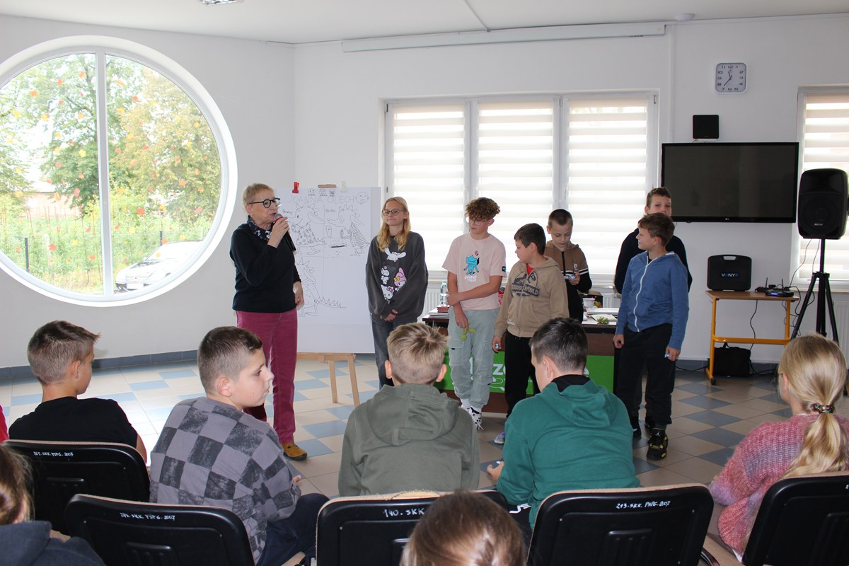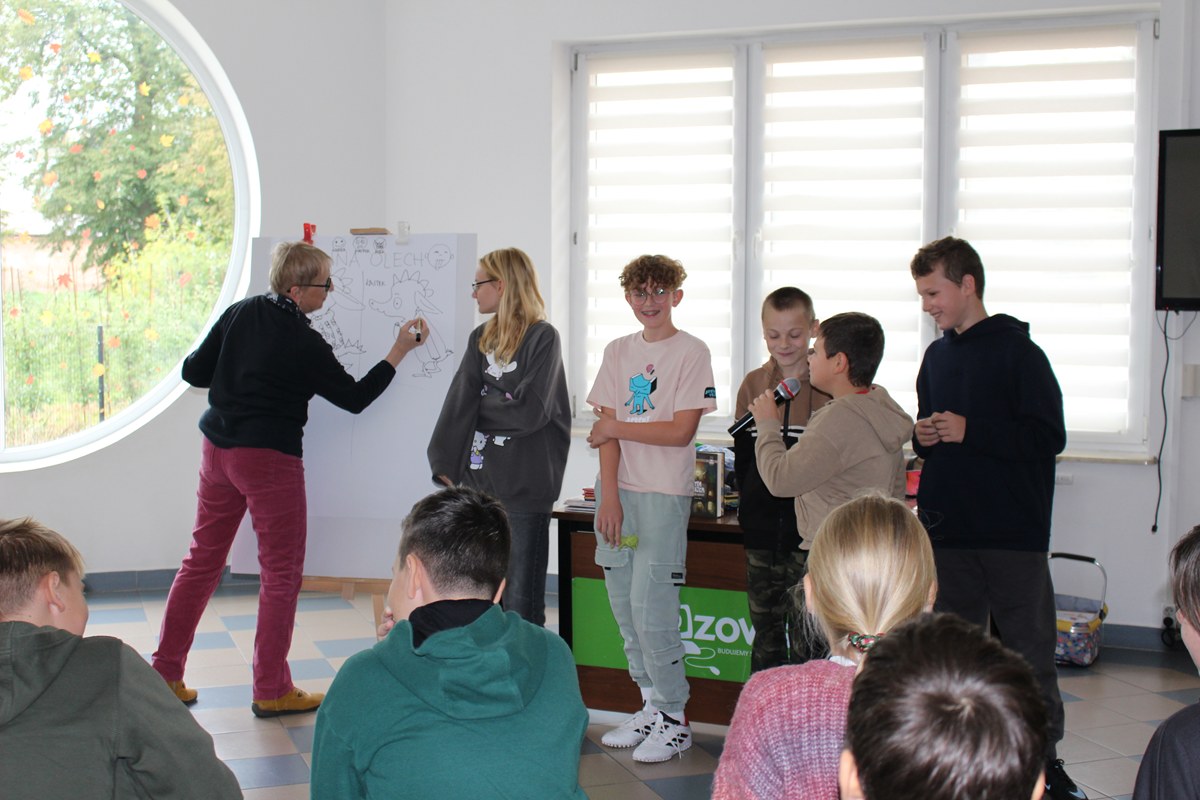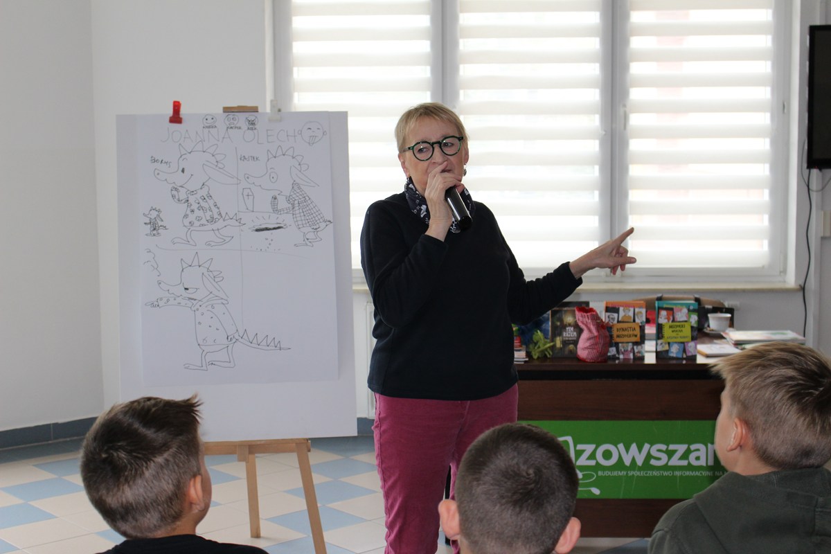Pisarka, niczym Święty Mikołaj, nagradzała uczestników spotkania angażujących się w zaproponowane aktywności. Uczniowie odwzajemniali się dużą ilością śmiechów i uśmiechów.