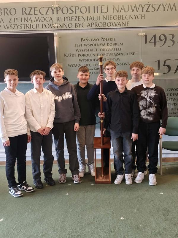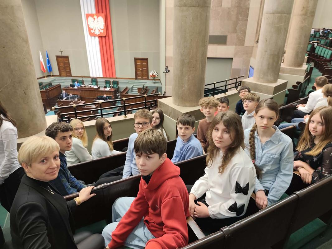 Pierwszym punktem naszej wycieczki było zwiedzanie Sejmu Rzeczypospolitej Polskiej. Podczas wizyty uczniowie mieli okazję zobaczyć jedno z najważniejszych miejsc w Polsce, w którym podejmowane są decyzje dotyczące funkcjonowania państwa. Przewodnik opowiedział nam o historii polskiego parlamentaryzmu oraz o roli Sejmu w systemie władzy w Polsce. Dowiedzieliśmy się, że Sejm jest izbą niższą polskiego parlamentu i zasiada w nim 460 posłów wybieranych w wyborach powszechnych. Posłowie pracują nad projektami ustaw, uczestniczą w debatach oraz głosują nad ważnymi decyzjami dotyczącymi życia społecznego, gospodarczego i politycznego kraju. Podczas zwiedzania mogliśmy zobaczyć Salę Posiedzeń Sejmu, w której odbywają się obrady posłów. Zwróciliśmy uwagę na charakterystyczną kopułę nad salą oraz układ miejsc dla posłów. Dowiedzieliśmy się również, gdzie zasiada Marszałek Sejmu oraz jak wygląda przebieg posiedzeń i głosowań. Przewodnik wyjaśnił nam także, czym zajmują się komisje sejmowe i w jaki sposób powstają nowe ustawy. Poznaliśmy również inne ważne miejsca w budynku, takie jak korytarze sejmowe, gdzie często odbywają się rozmowy i spotkania posłów, a także miejsca przeznaczone dla dziennikarzy relacjonujących pracę parlamentu.