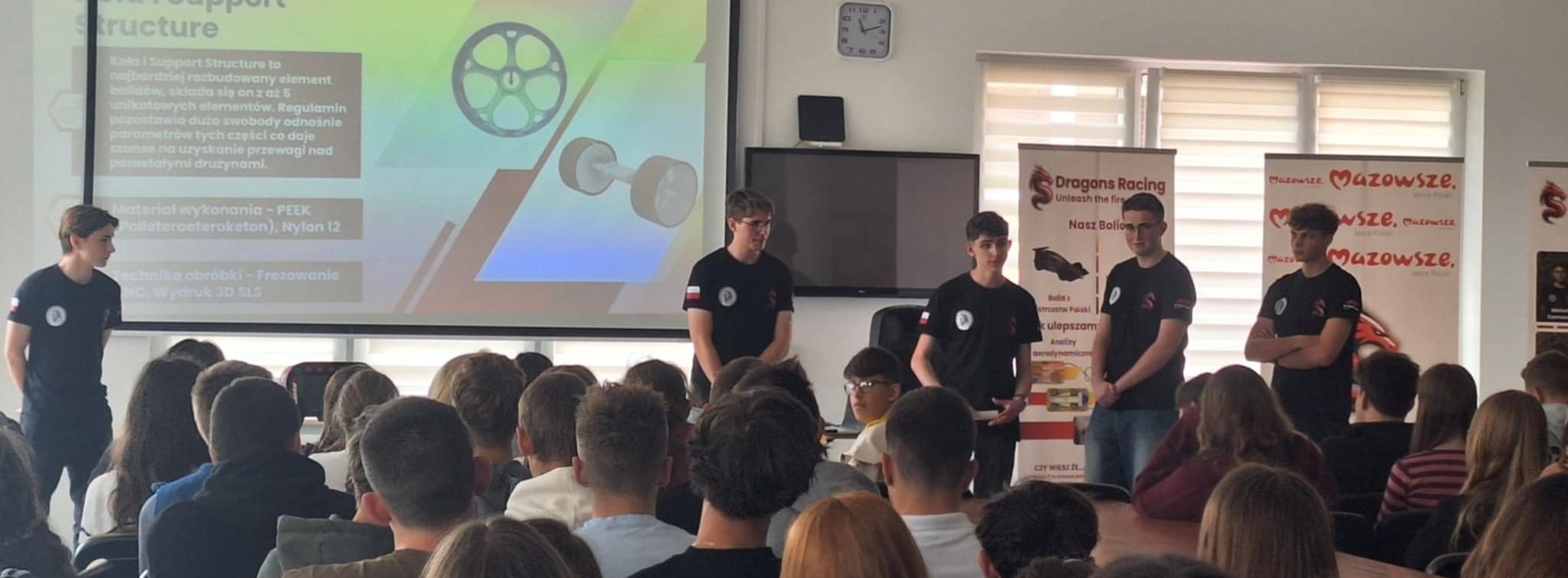22 maja 2025 roku uczniowie klas 6-8 wzięli udział w spotkaniu z drużyną „Dragon Racing”. Uczniowie z Liceum im. Piotra Skargi w Grójcu opowiedzieli młodszym kolegom na temat konkursu, w którym biorą udział. W ramach projektu „F1 in Schools” mają za zadanie zaprojektować oraz zbudować model bolidu wyścigowego łączącego zaawansowane rozwiązania techniczne z kreatywnością uczestników. Cieszymy się, że jednym z członków drużyny jest nasz absolwent, Sebastian Bernacki.